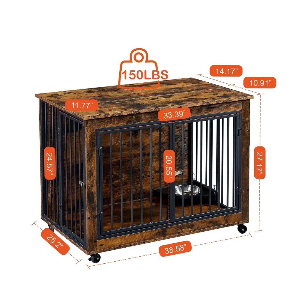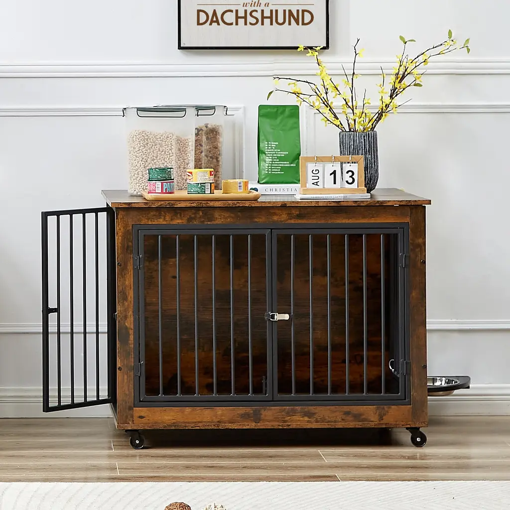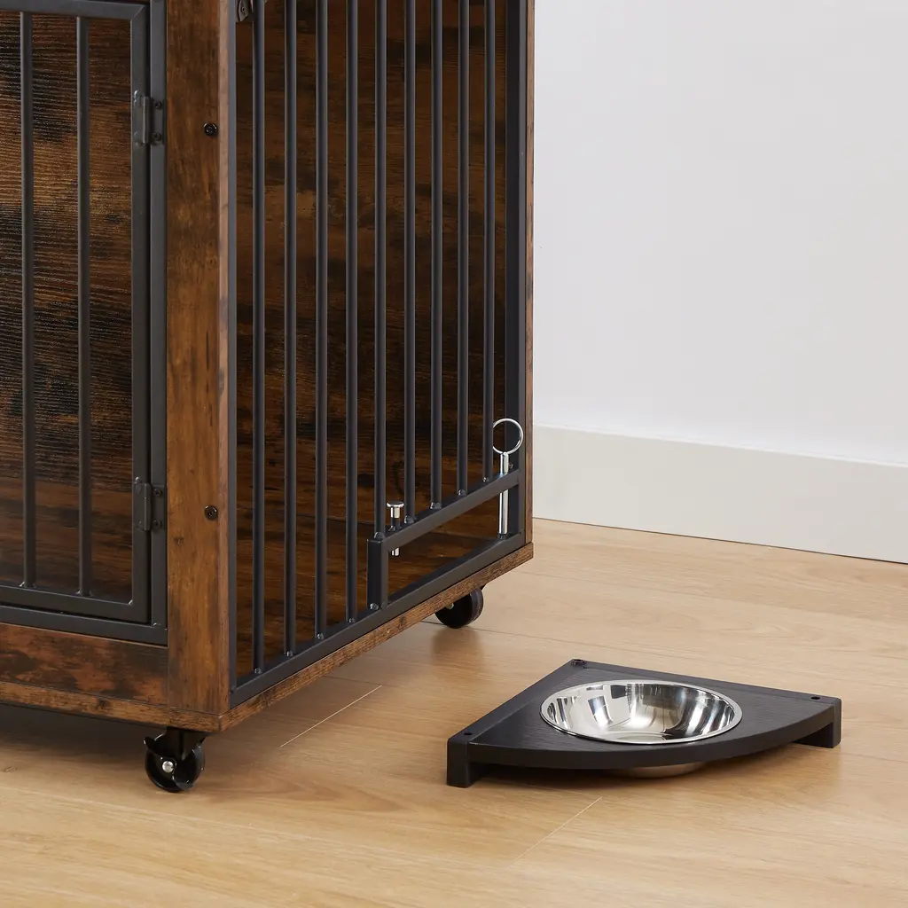 Adjustable BowlAdjustable raised dog feeder with 1 stainless steel 7-inch dog food bowls and easy 180-degree rotation, allowing the feeding bowl to stay on the inside or outside of the crate. Daily feeding can be carried out without opening the door.Durable MaterialDesigned with durable particleboard and metal enclosure bars, offering a lasting, stable, and safe retreat.Flip-Up Top OpeningThe top door can be opened for you interacting with your dog with toys, and increase your bond.Support RodSupport, with damping, you don't have to worry about the top plate falling suddenly.All-Around ProtectionDual secure latch lock prevent dog opening the door from inside. The quality is strong enough and the solid lock doesn't make a lot of noise.Side doorEasily accessible, this furniture-style dog crate is perfect for active dogs who like to come and go as they please.Bottom WheelsYou can effortlessly push this crate to any corner of your home, then lock the wheels to secure the dog crate.