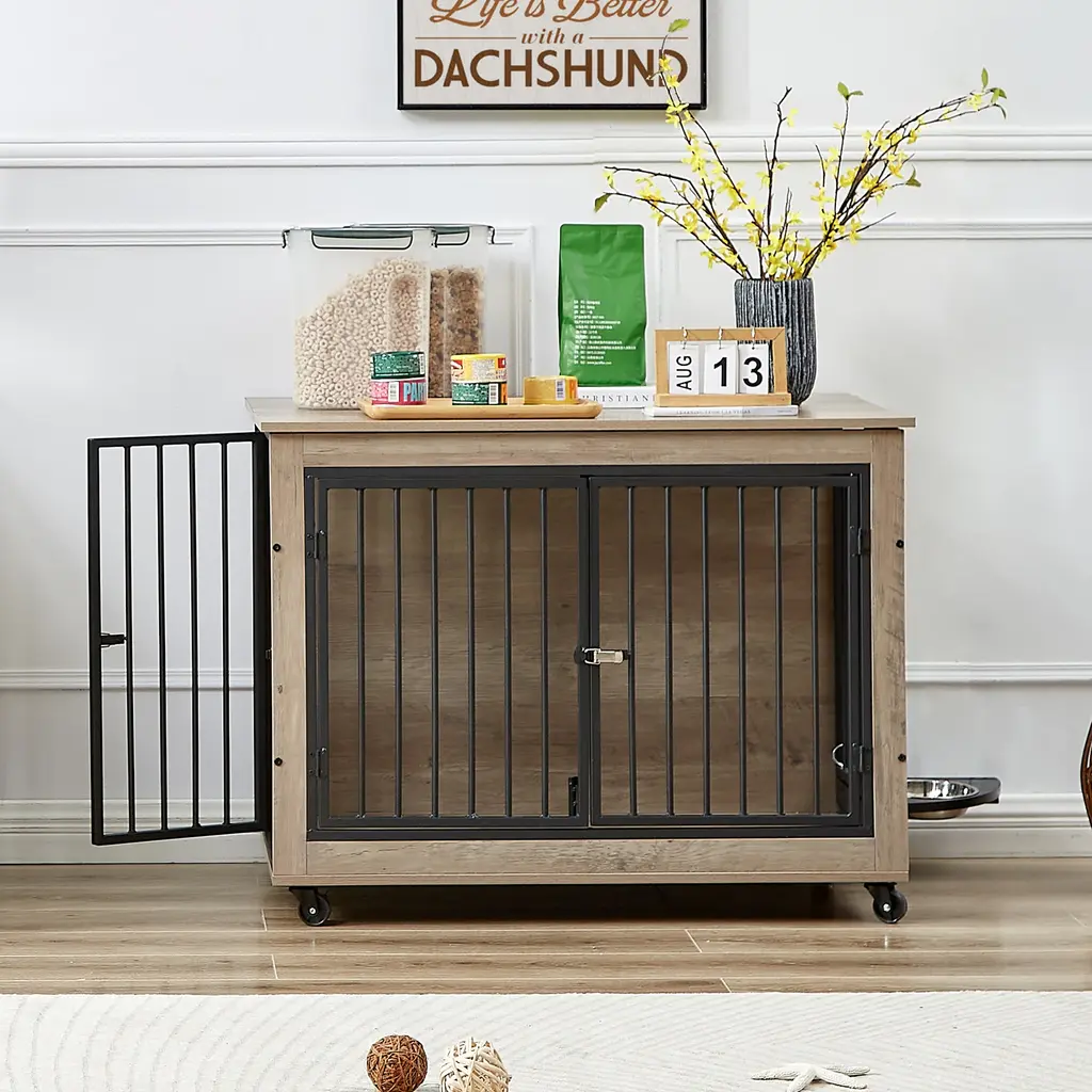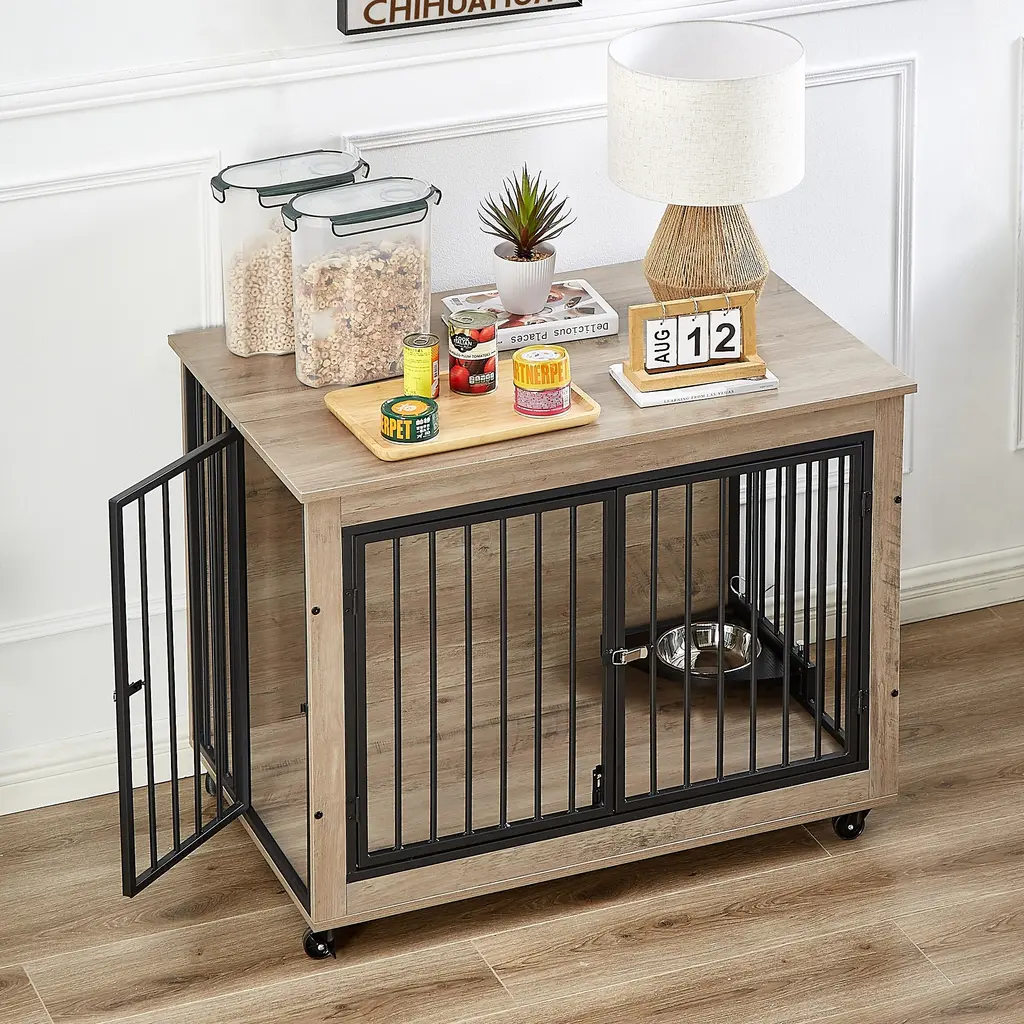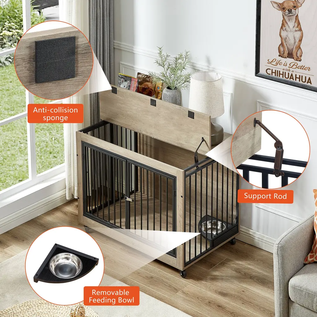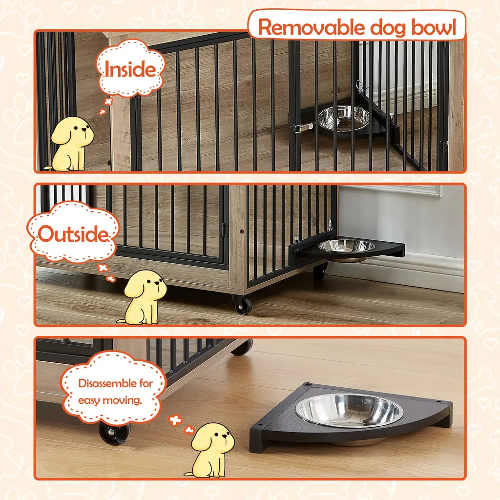 Adjustable BowlAdjustable raised dog feeder with 1 stainless steel 7-inch dog food bowls and easy 180-degree rotation, allowing the feeding bowl to stay on the inside or outside of the crate. Daily feeding can be carried out without opening the door.Durable MaterialDesigned with durable particleboard and metal enclosure bars, offering a lasting, stable, and safe retreat.Flip-Up Top OpeningThe top door can be opened for you interacting with your dog with toys, and increase your bond.Support RodSupport, with damping, you don't have to worry about the top plate falling suddenly.All-Around ProtectionDual secure latch lock prevent dog opening the door from inside. The quality is strong enough and the solid lock doesn't make a lot of noise.Side doorEasily accessible, this furniture-style dog crate is perfect for active dogs who like to come and go as they please.Bottom WheelsYou can effortlessly push this crate to any corner of your home, then lock the wheels to secure the dog crate.