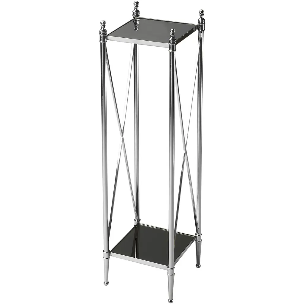 The Doheny nickel accent table is a timeless classic for any room. Used as pairs in the living on each end of the sofa, or nested as bunching tables. We also love to use the table in the master bath with thick towels stacked on the bottom shelf and the top surface used for a lamp. The trim and bamboo supports are made of steel and finished in an aged brass finish. The mdf insert shelves secure to the metal shelf frame and are finished in gloss black. Ever so chic! Measurements: 25"H x 20"W x 18"D Also available in brass. Free shipping in the U.S.