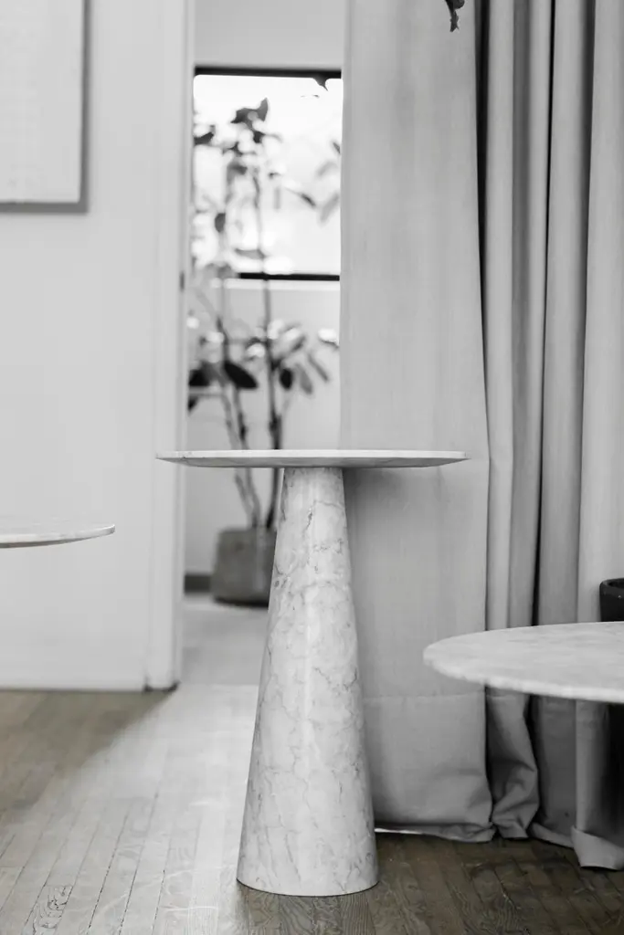 Side table in carved Veneciano white marble. Available on request in Monterrey black marble. Production time: 6-8 weeks for items without marble / 13-14 weeks for marble pieces. Shipping +10 additional business days. Casa Quieta uses natural materials such as woods, stones, fabrics etc. These materials may vary in tone, veining, and cavities due to their natural origin. This is part of the inherent beauty of materials and is not considered a flaw. Due to the artisan nature of our production process, there is a +/- 3mm measurement tolerance.