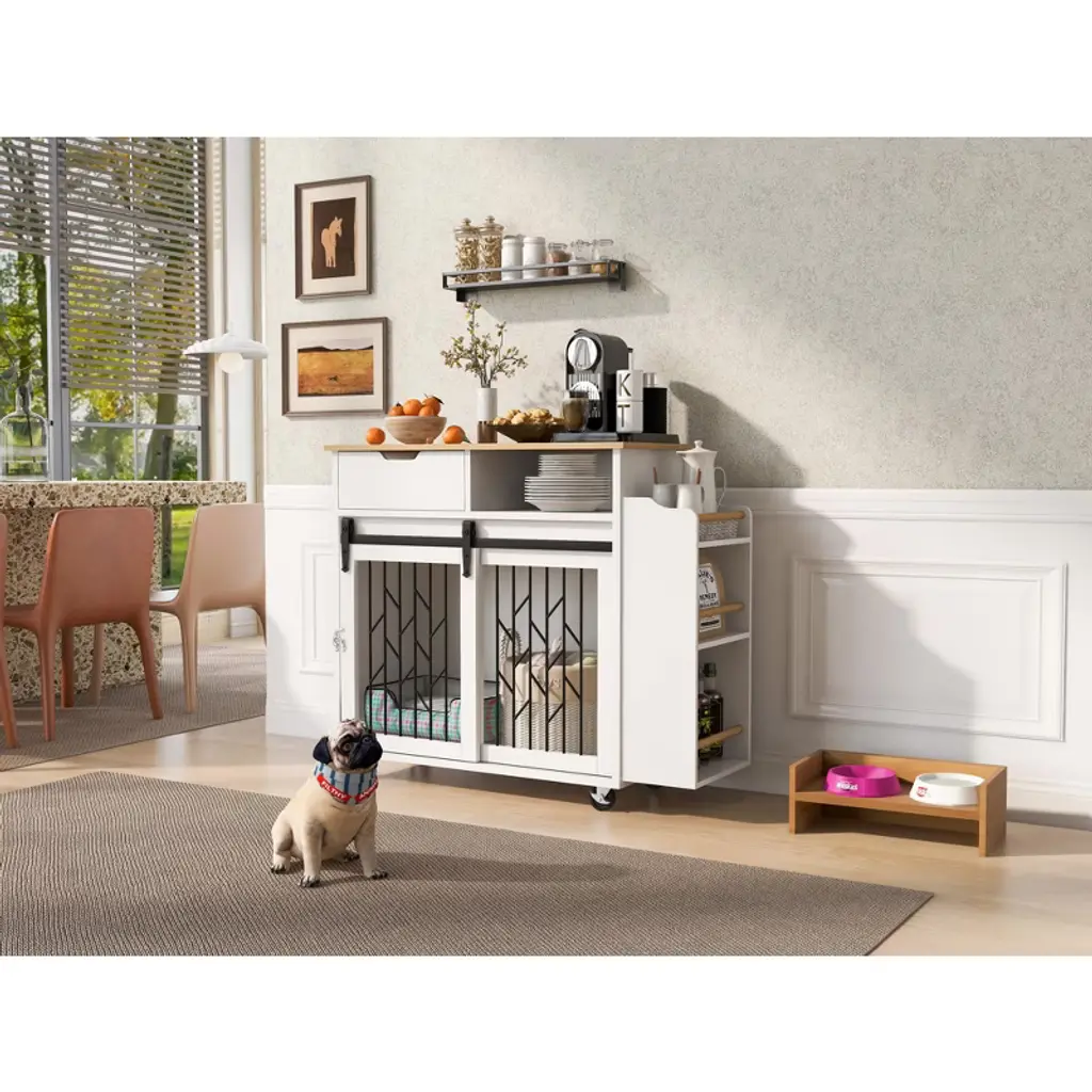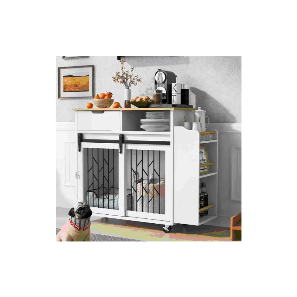 This stylish furniture piece combines functionality and elegance, serving as a dog crate, kitchen island, and end table. Perfect for pet-friendly homes, it seamlessly integrates into any decor while providing a cozy space for your furry friend. Its versatile design includes ample storage and a sturdy surface for kitchen essentials or decorative items.
