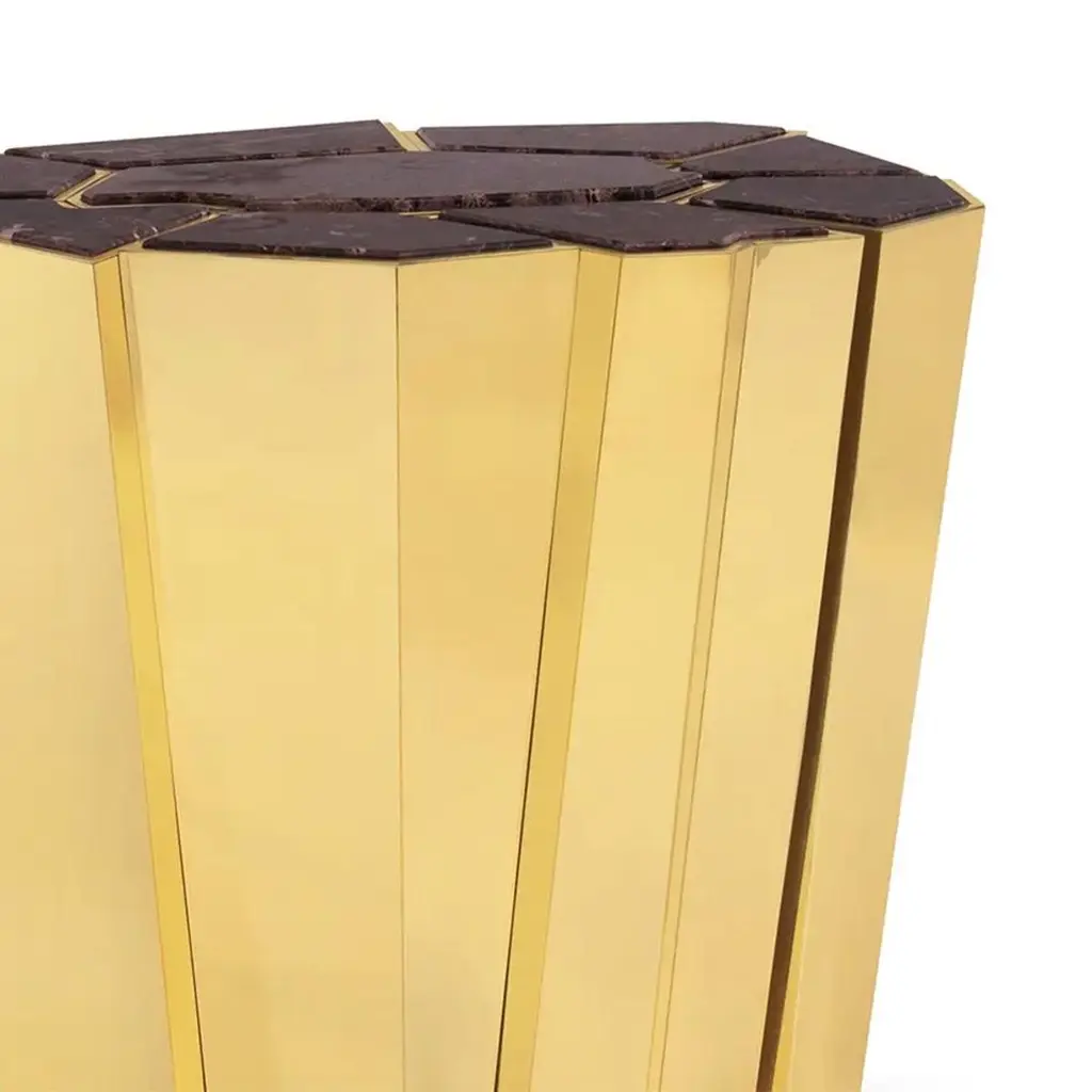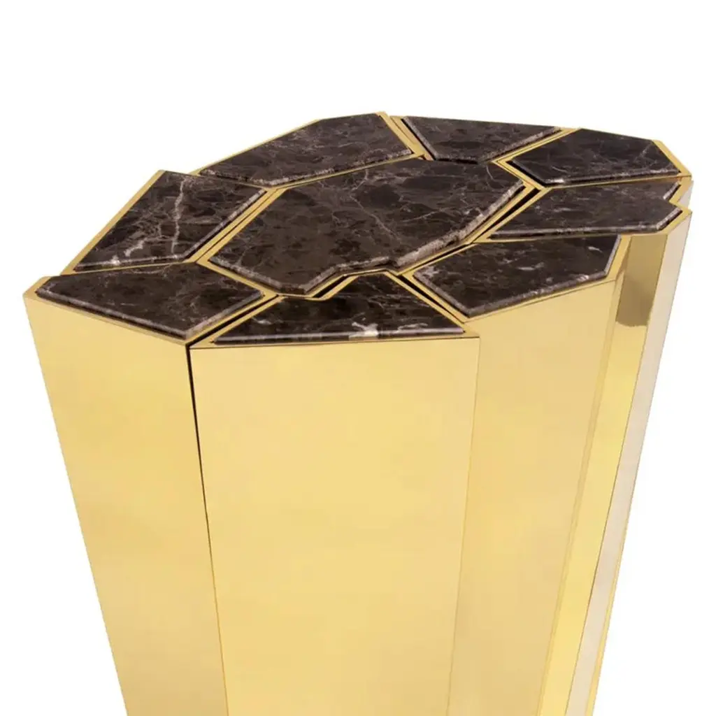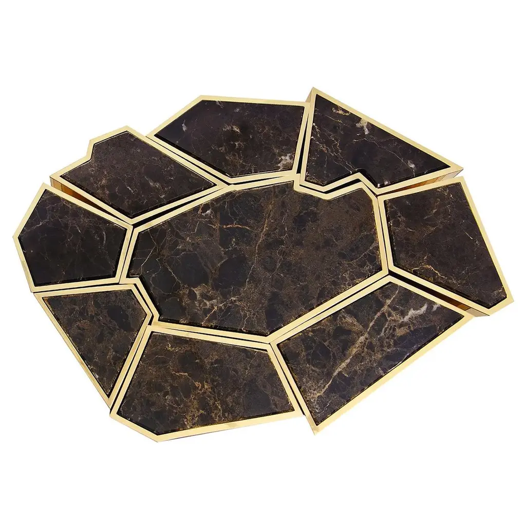 Side Table Domy with structure in solid brass in polishedfinish, with emperador marble top with 9 parts surroundedby polished brass trims. Wooden base in black lacqueredfinish.