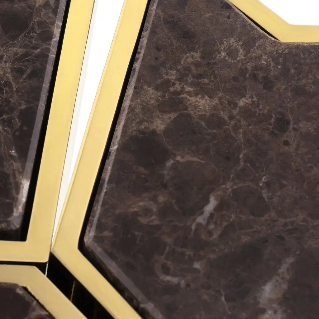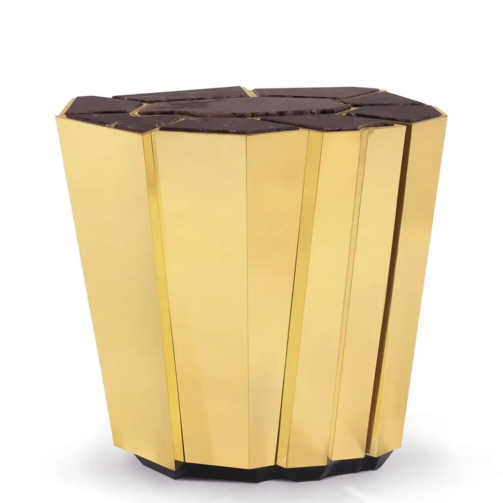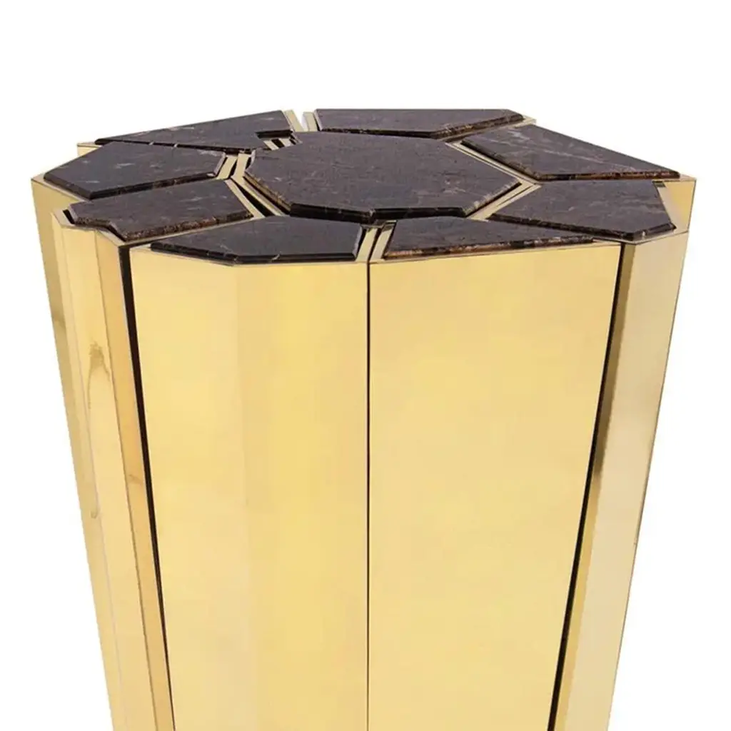 Side Table Domy with structure in solid brass in polishedfinish, with emperador marble top with 9 parts surroundedby polished brass trims. Wooden base in black lacqueredfinish.