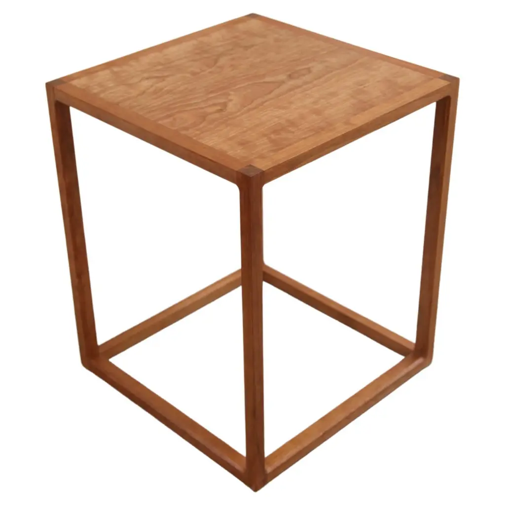 This Donald Judd Inspired side table in cherry was designed for a client who wanted a clean shape and didn't need a drawer by their bed. It references Donald Judd’s clean geometric shapes but also incorporates some softness in the interior edge treatment. We cut a large chamfer on the interior edge that creates a pleasing gentle curve where the vertices of the cubes meet the cut (see detail photo). We don't cut the chamfer on any of the external faces so that the uninterrupted geometry of the shape remains. We bring the ‘legs’ of the table all the way to the plane of the top so that you have the contrasting endgrain visible. The field of the top is made with a shop-made cherry veneer on a stable substrate cut much thicker than conventional veneers, so that it will last a lifetime. The rest of the table is solid cherry and it can be made in a variety of domestic hardwoods. The finish is a durable low sheen spray finish to avoid marks from mugs but could be finished in an oil and wax if desired.