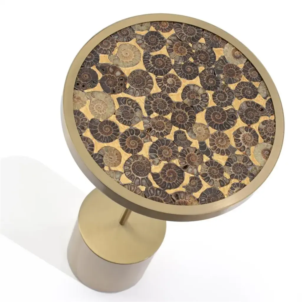 The Donatello is an innovative marriage of natural motifs and contemporary design. Crafted from metal in a bronzed finish, the table features a rounded cylindrical base. The tabletop features an assortment of intricate seashell patterns, creating a visually stunning juxtaposition between organic shapes and metallic tones.