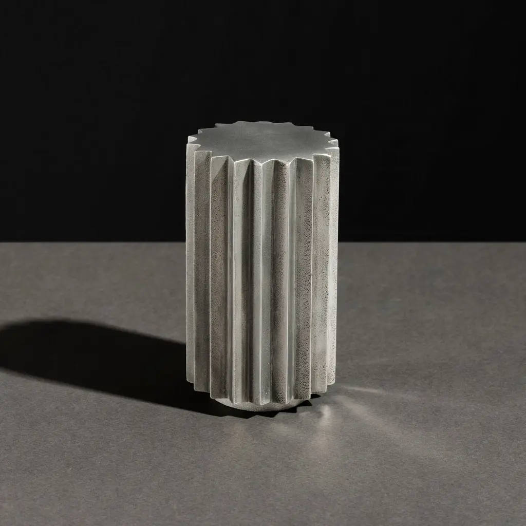 Side tables in cast bronze, blackened bronze or aluminum of different diameters and heights that can be combined to create a coffee table. Inspired by Doric columns in archaic architecture, the extruded multi-point stars have a different finish on each vertical face: the cast metal is polished on one side but left raw on the other. The shading is amplified by the different finishes resulting in a dramatic effect. Similar to gears, the tables can be meshed together to form a center table set, possibly using tables of different heights and even materials.Crafted in Tuscany, Italy, in a foundry specialized in bronze sculptures, serving artists among the most renowned in the world.Standard materials: oxidized bronze, blackened bronze and aluminum (polished and coarse).Standard sizes:D 33.0” x H 11.8” (L)D 23.6” x H 16.5” (M)D 14.2” x H 23.6” (S)This listing is for a single small table in aluminum. For other dimensions and finishes or sets please see the dedicated listings or contact Fred&Juul. About Fred&Juul:Fred&Juul renew traditions by making customs and techniques reappear from the past while applying fine Italian craftsmanship to contemporary design. Founded by Italian-Dutch architects’ duo Federico Minarelli and Julie Janssen, the brand explores the possibilities of producing designs that are versatile and elegant while being exclusively handcrafted by local artisans from traditional materials like brass and solid wood. Fred&Juul’s design philosophy is aimed at sustainability and contrasting the throw-away society by creating pieces that will last, both for their exceptional quality and for their timeless appearance.Every piece is manufactured in small specialized workshops scattered around Tuscany. The designers manage the entire production process and have a direct relationship with the craftsmen and women, who are involved in the design process from the early stages. The result is contemporary collection that conjures up the refined artistry of centuries old craftsmanship.