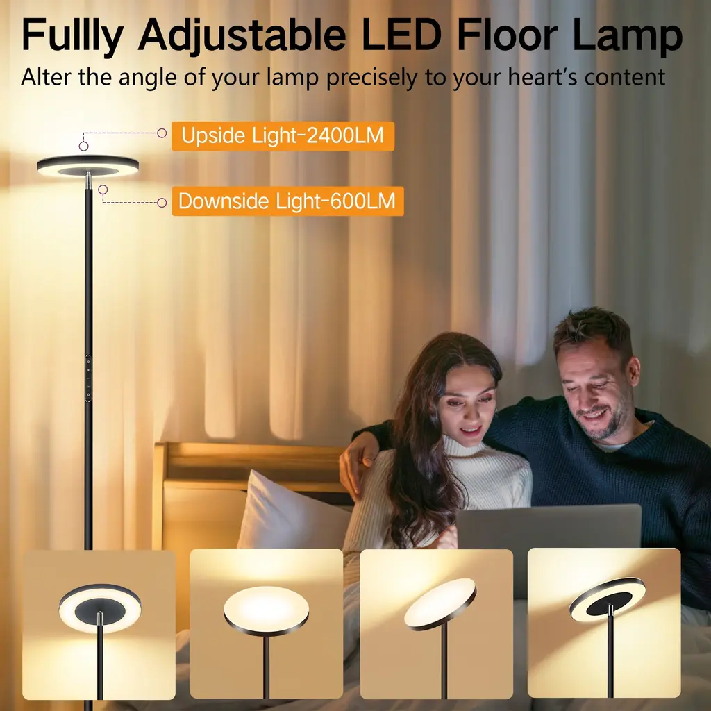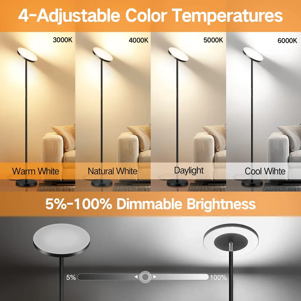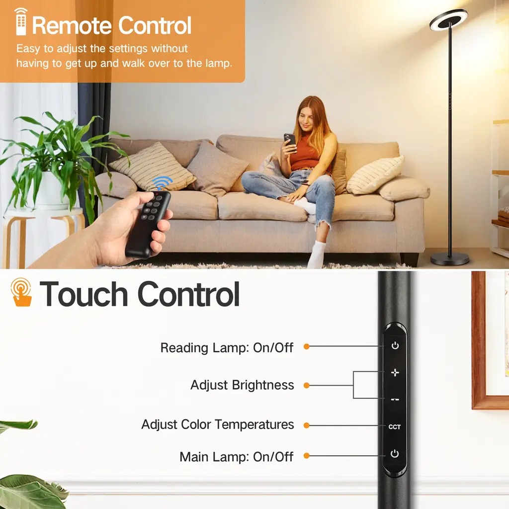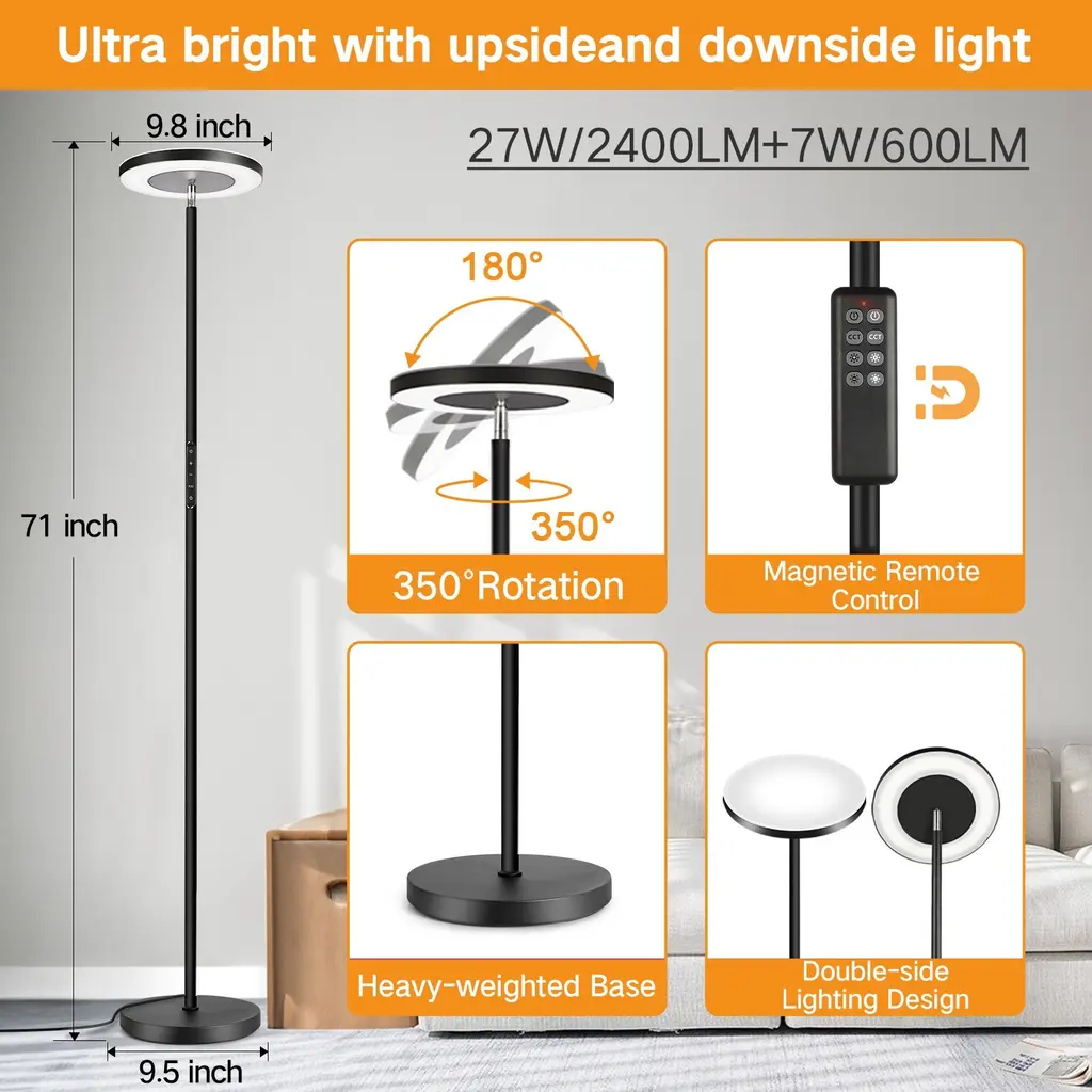 This Floor Lamp features a unique two-sided design with super bright up and down lighting as well as adjustable color and brightness. The standing lamp is designed to provide a bright, even light without creating any black spots or shadows. This makes it perfect for reading, studying, working or just relaxing in your favorite chair. It is stable and secure, with a heavy base that can be easily controlled via remote and touch options. It offers a range of color temperatures, from warm yellow to cool white and daylight. This allows you to create the perfect lighting environment for any activity, whether you're reading, relaxing or working on a project; the freestanding floor lamp is bright enough to illuminate all areas of the room. Features 🌟