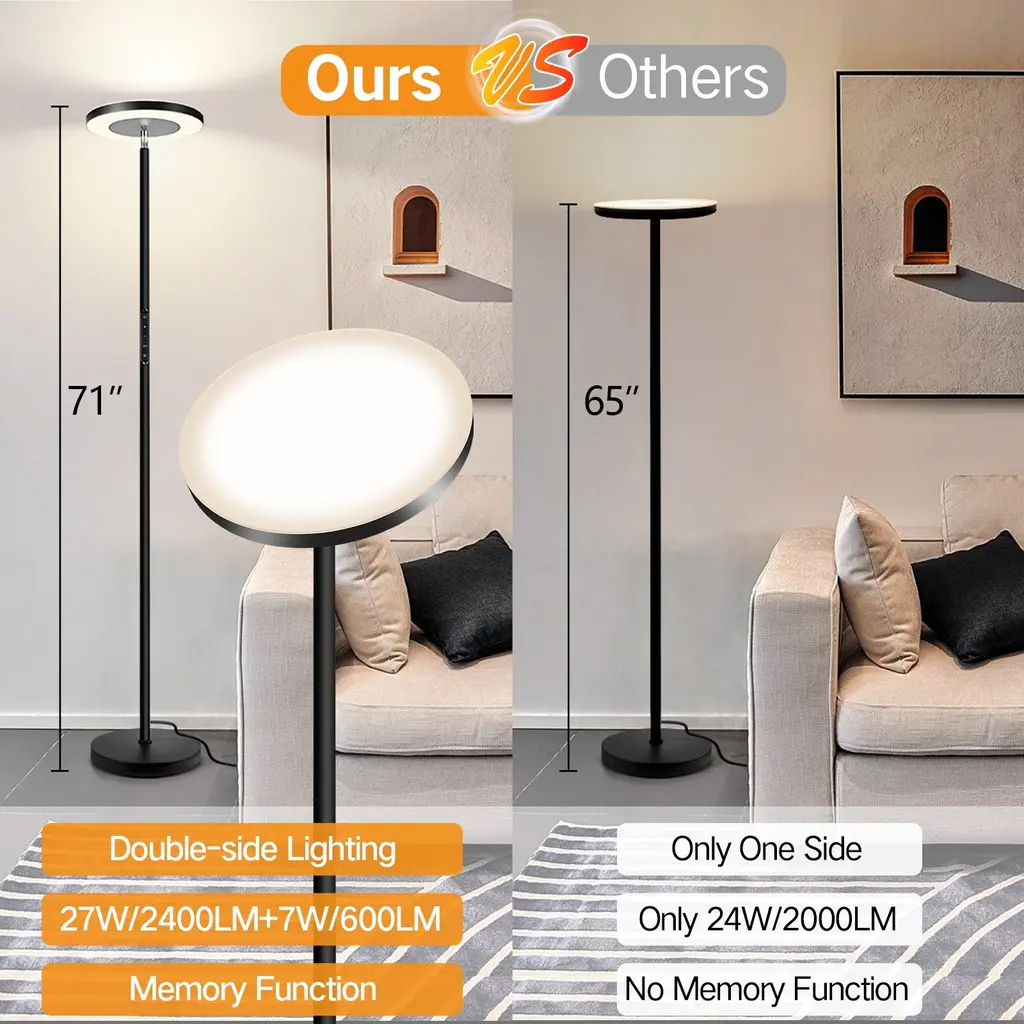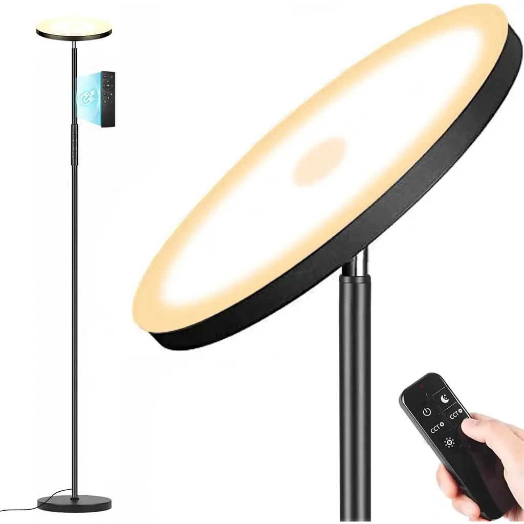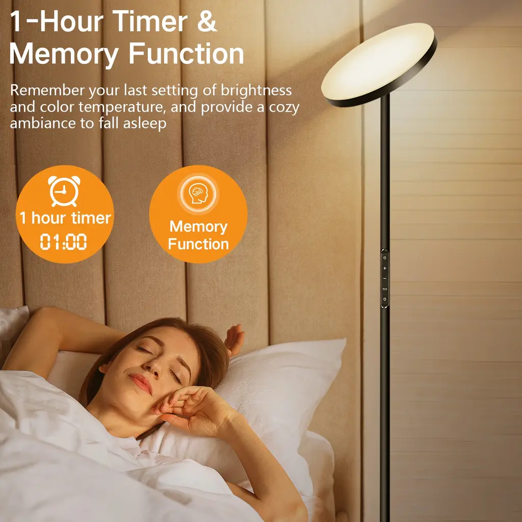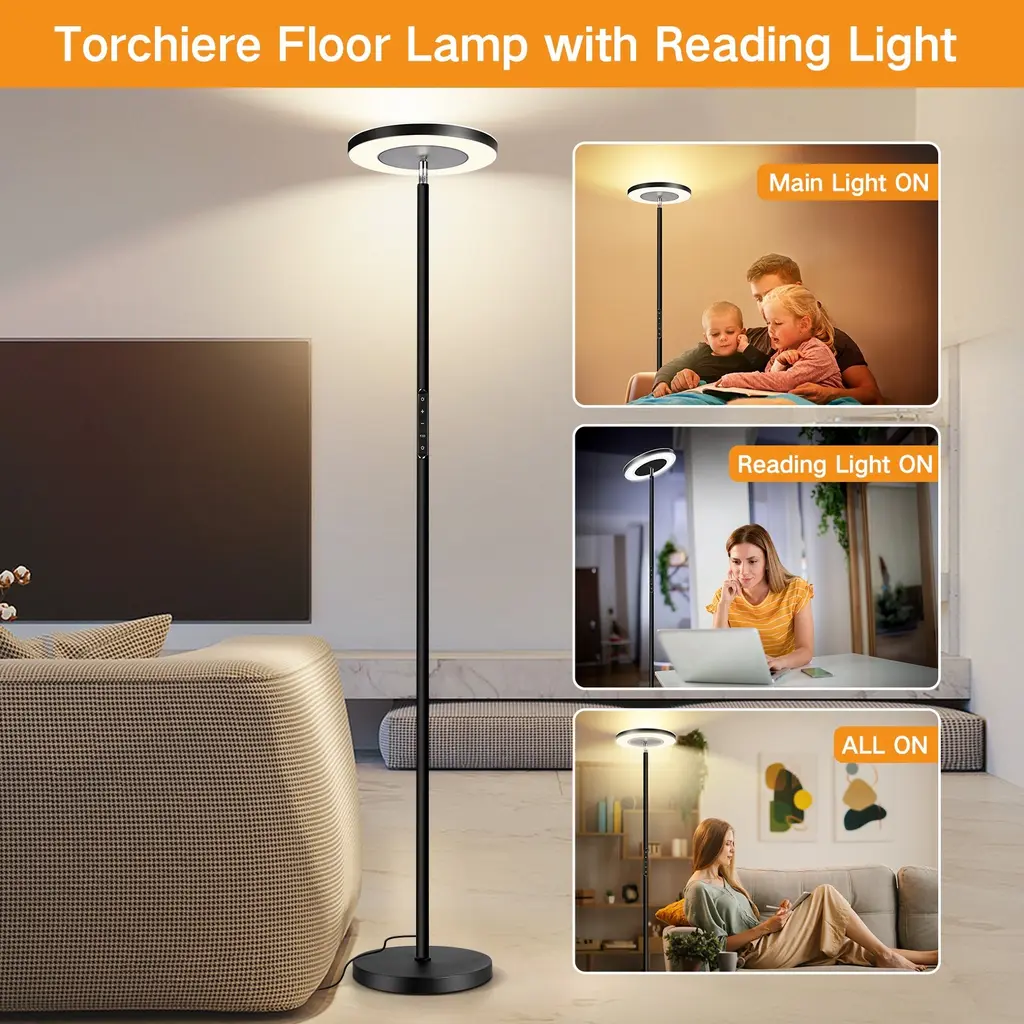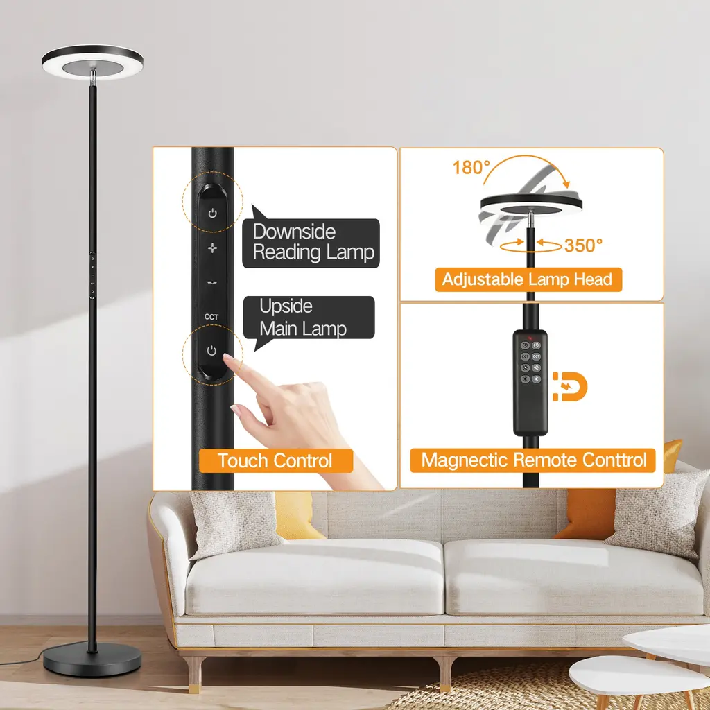 This Floor Lamp features a unique two-sided design with super bright up and down lighting as well as adjustable color and brightness. The standing lamp is designed to provide a bright, even light without creating any black spots or shadows. This makes it perfect for reading, studying, working or just relaxing in your favorite chair. It is stable and secure, with a heavy base that can be easily controlled via remote and touch options. It offers a range of color temperatures, from warm yellow to cool white and daylight. This allows you to create the perfect lighting environment for any activity, whether you're reading, relaxing or working on a project; the freestanding floor lamp is bright enough to illuminate all areas of the room. Features 🌟