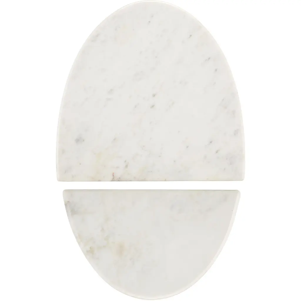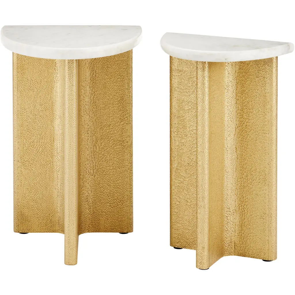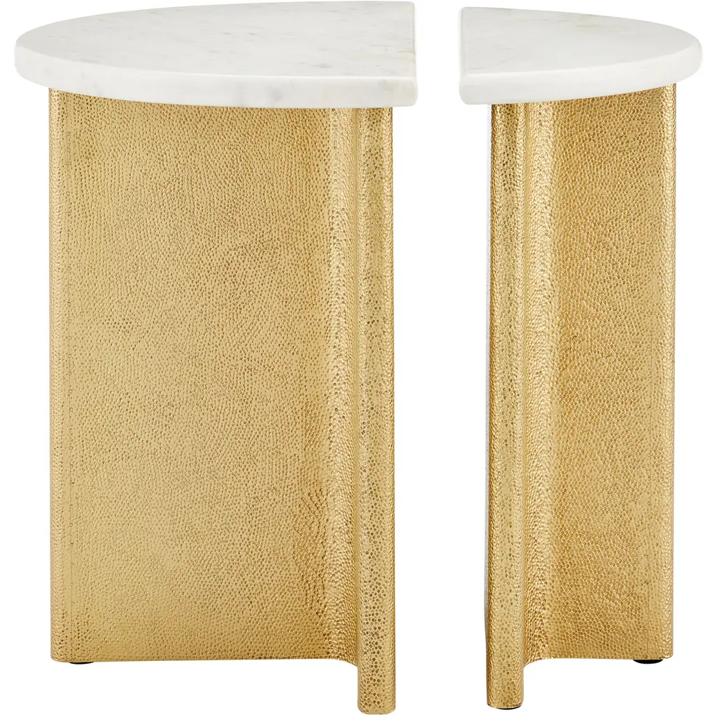 The Doublet Marble Accent Table Set includes two small tables that can stand alone as individual accents or be placed back-to-back to create a seamless oblong tabletop. The bases are adorned with hand-hammered brass sheeting in an intricate swirling pattern that evokes a serpentine elegance. Finished in antique brass, the textured bases are perfectly complemented by the cool contrast of the white Banswara marble tops.