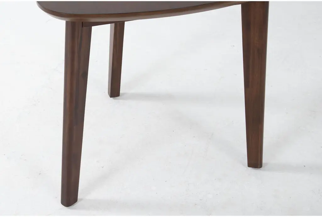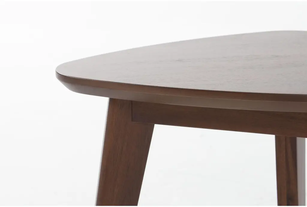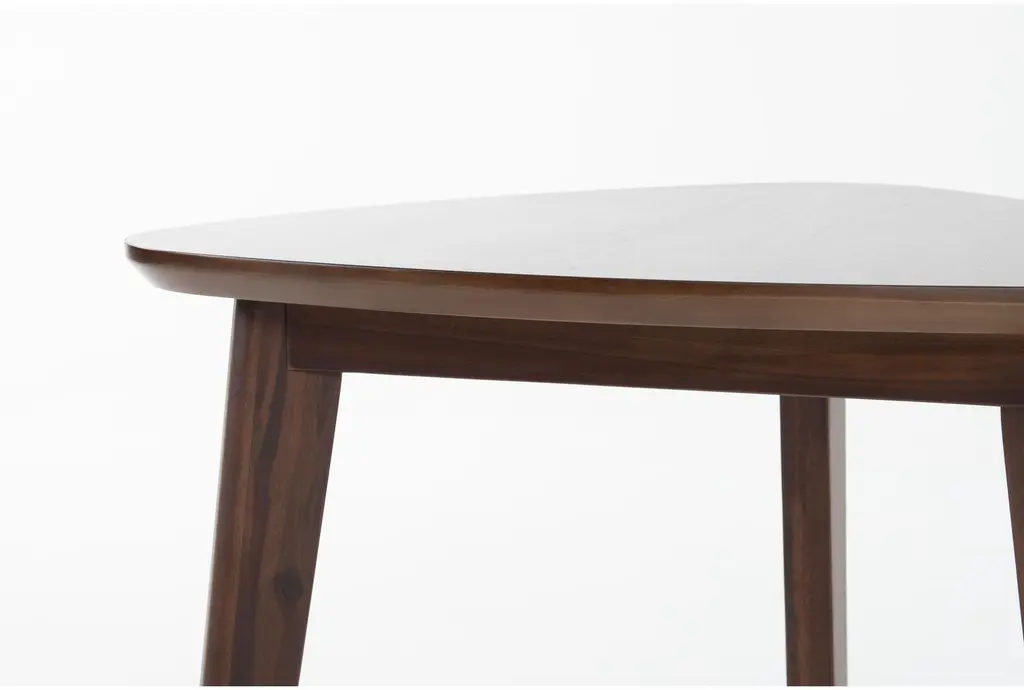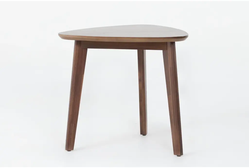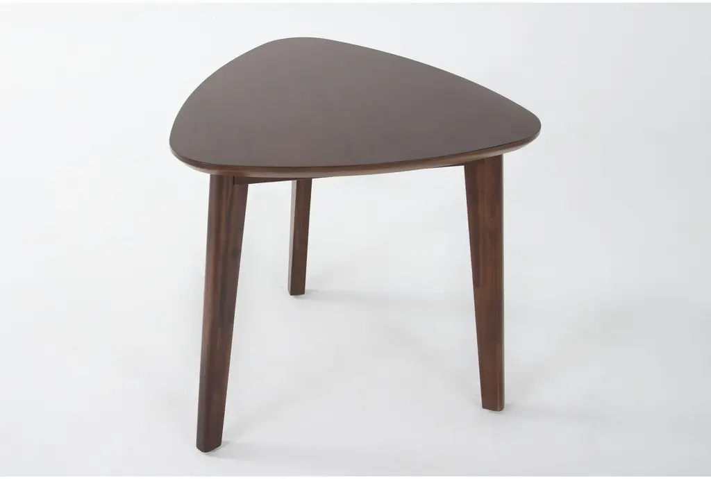 Introducing the Draper Brown 24" High Triangle Wood Nesting Side Table, a perfect addition to your living room. This mid-century modern piece features a unique triangle shape and a rich walnut finish that complements any decor. Made from acacia veneers and solid acacia, this table is both stylish and durable.