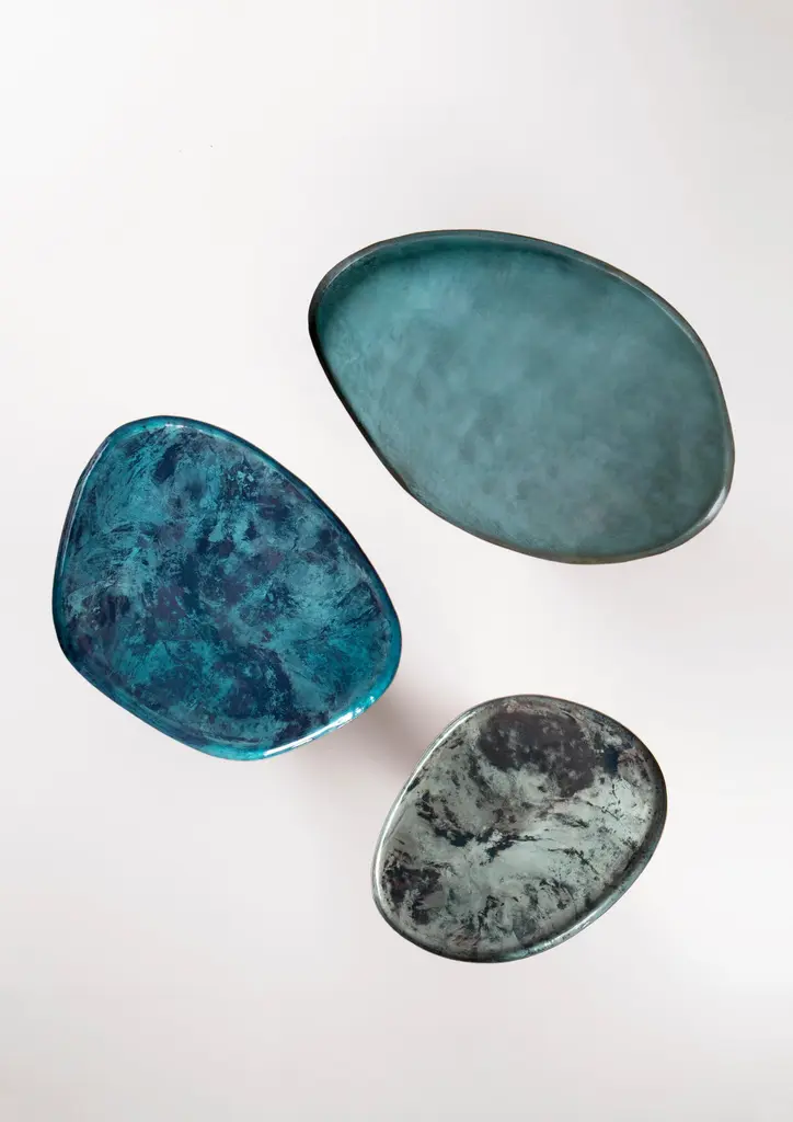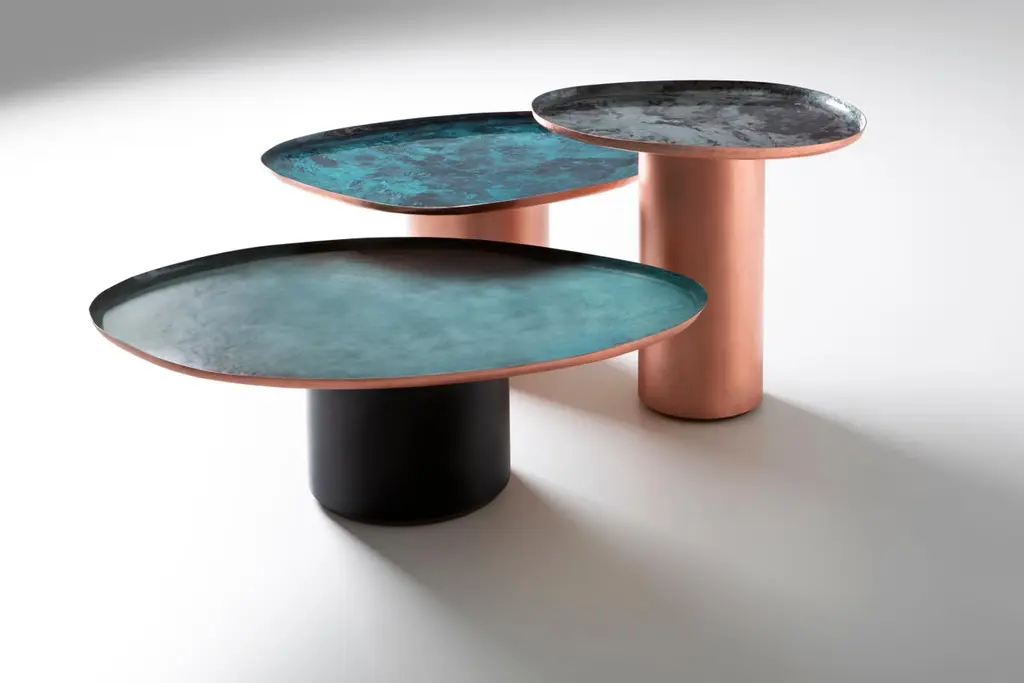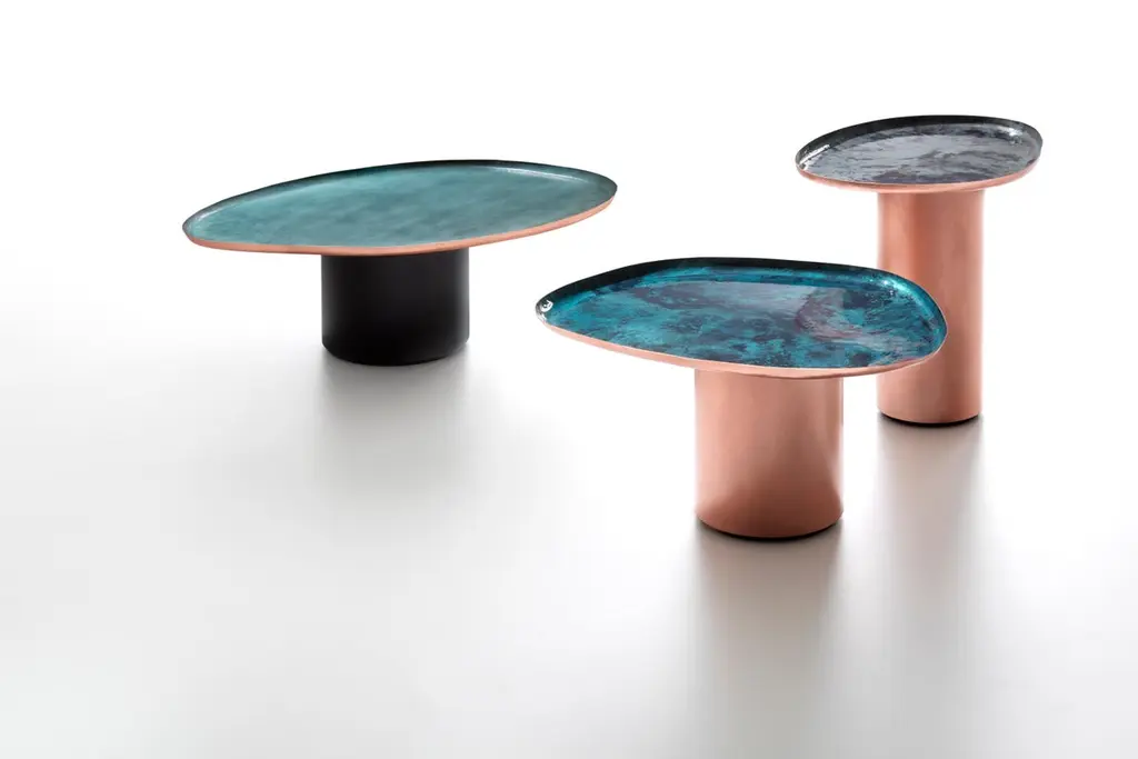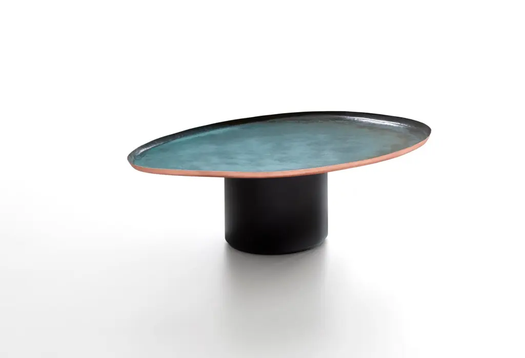 Drop 52 Side Table by De CastelliDimensions: W 42 x D 54 x H 52 cmMaterials: Copper, OtherOther versions are available, please contact us for any request.Drops is a family of coffee tables in three different sizes, inspired by the unexpected, irregular shapes of water droplets on a surface. Their soft, familiar lines embody the skilled craftsmanship and artisan know-how of De Castelli, which has revived the traditional technique of manually hammering and shaping copper. The tables are thus a nod to a tradition that, given a contemporary interpretation, is manifested in products that harmoniously integrate with everyday settings. The new DeNuance finish from De Castelli further enhances the copper tops, giving each piece an organic, natural look through the combination of fire, oxidation and pigments. DeNuance and Verderame breathe life into a fresh combination of tones inspired by water and the way it moves. De Castelli metals now have a new look, rich in depth and an infinite range of hues.DE CASTELLI“HARD COUTURE”Faithful to its decision to reinstate the special role of metal in design and experimentation, De Castelli infuses artisan ideas and workmanship into industrial processes, leading to entirely original results. The encounter with design inspires an approach to materials founded upon respect for their potential, be it hidden or obvious, which emerges slowly in a collection of pieces that, despite being part of a series, remain unique.Unique not only for the hand that has created them, but also for the singular cultural path that focuses on the aesthetic (and not just practical) value of the primordial material with which De Castelli shapes living spaces.A BESPOKE APPROACHEach object, even in the repetition of form, is a creative act in and of itself, one that incorporates a heritage of constantly-evolving expertise and research. The equation that relegates ‘cold’ metals to the margins of furnishing projects is thus overturned, bringing iron, brass and copper, in their infinite variations and finishes, to the centre of an entirely renewed stage, allowing them to finally shine with their own light.SUSTAINABILITYDe Castelli has always been committed to making the entire production cycle increasingly sustainable, aware that metal, the material with which its business identifies itself, is precious and must be treated with care, without waste.PEOPLE FIRSTThe wide spaces of the De Castelli headquarters in Crocetta del Montello (TV) allow those who work to enjoy environments where order, cleanliness and safety are always maintained and guaranteed. An attitude of attention and respect for people that has led to the shared ethical code.