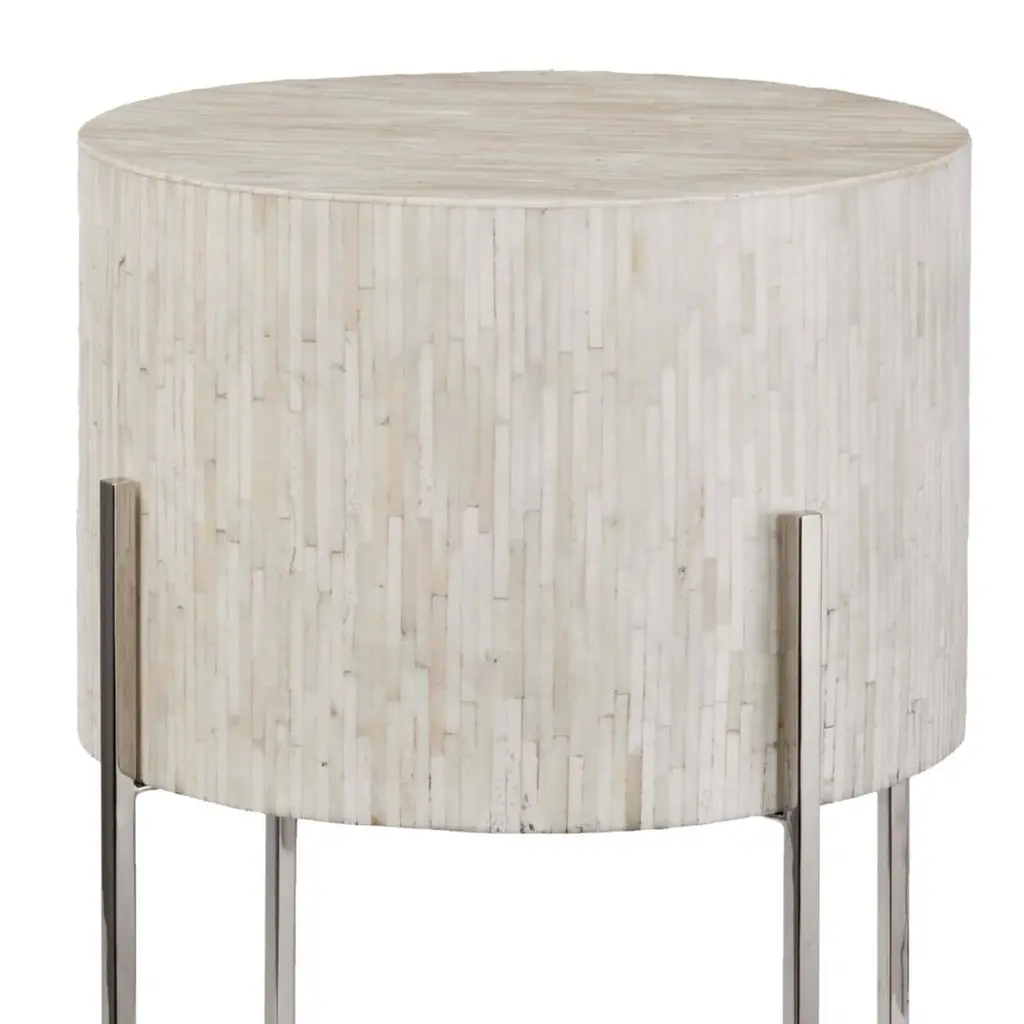 All the elements of this unique table come together perfectly: the intricate inlaid bone, the soft shape, and nickel legs, blending old-world style with a modern, mixed material sensibility. Use it to round out a contemporary arrangement in sophisticated style or to accent a modern ensemble.
