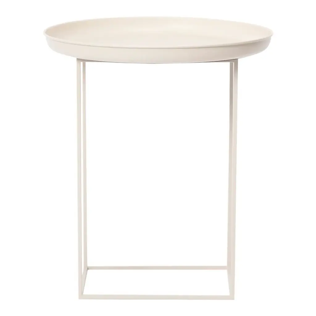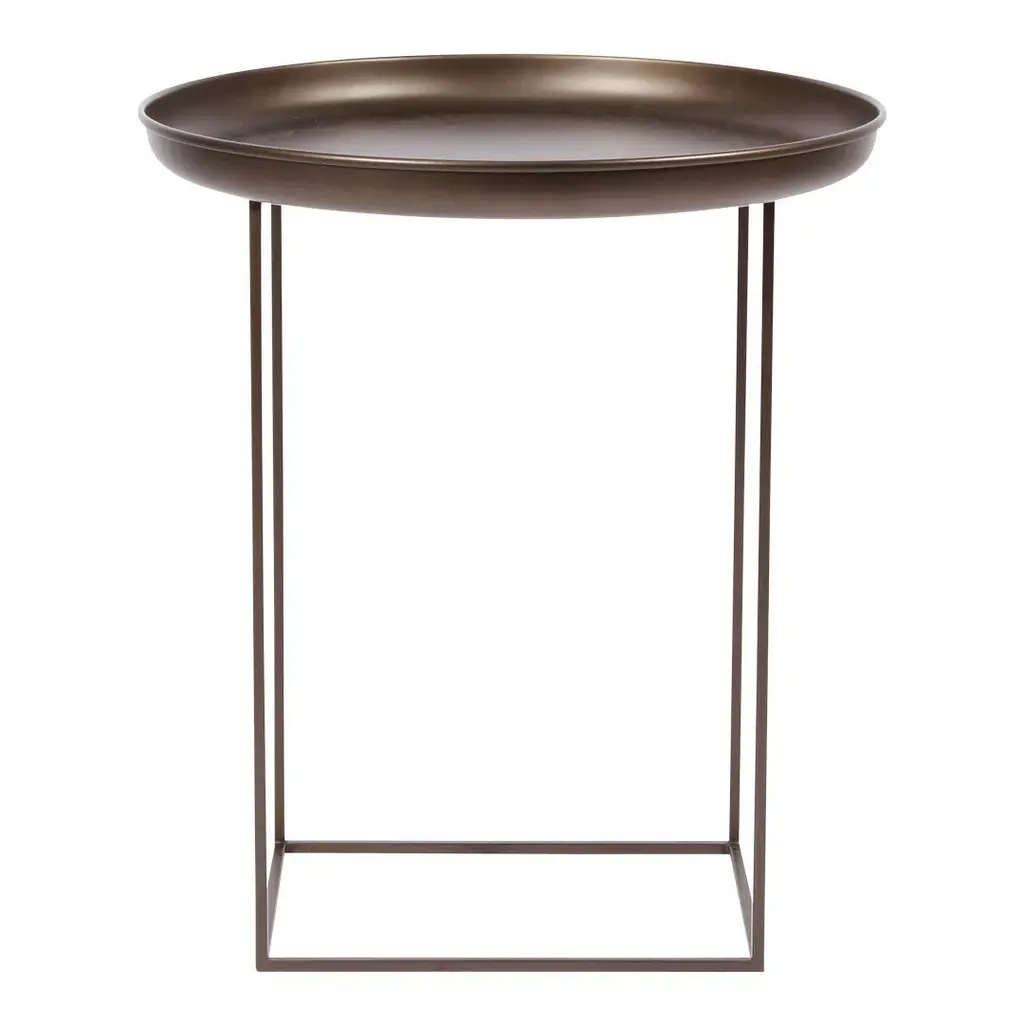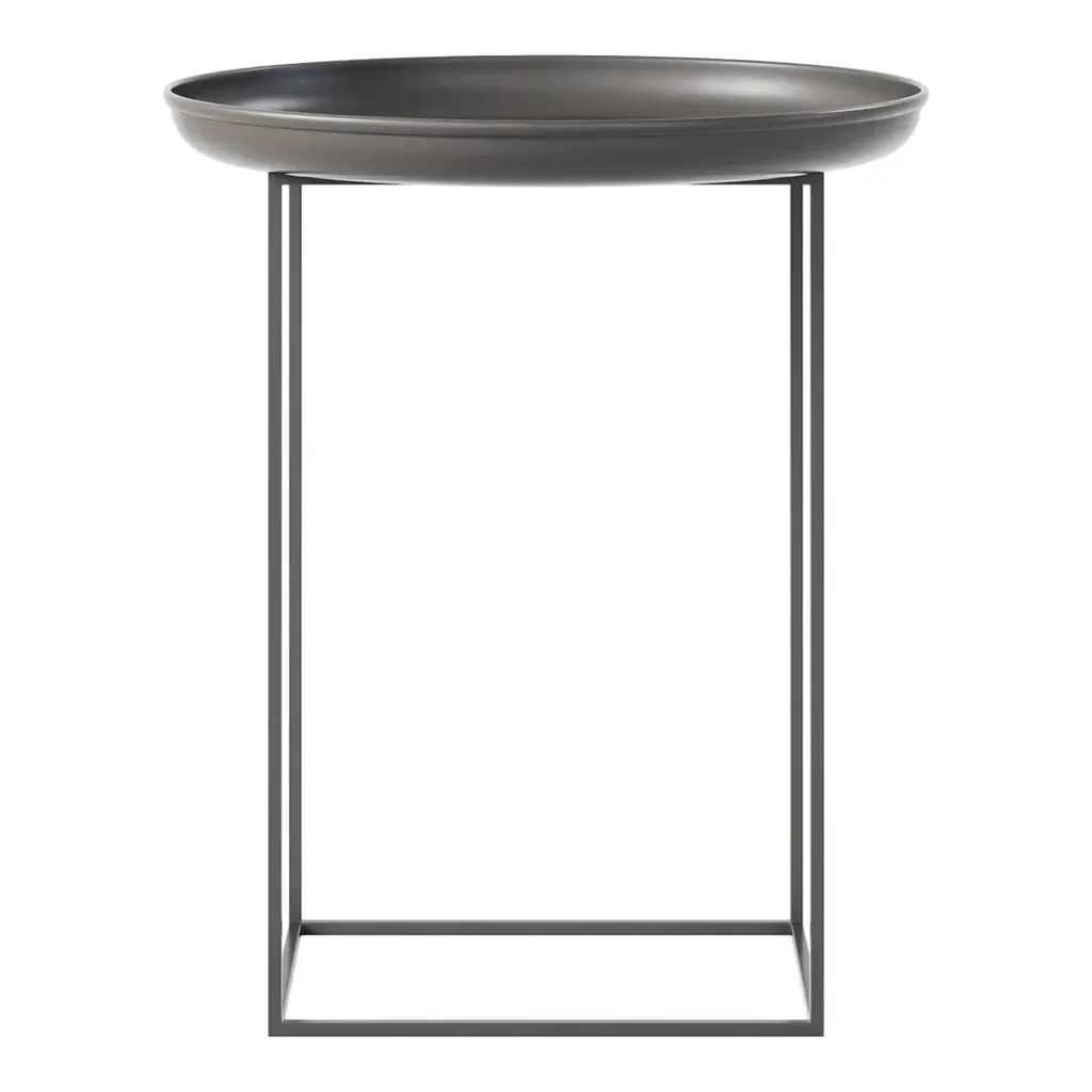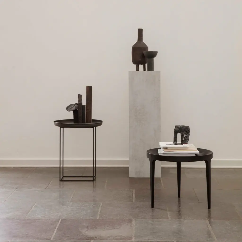 The Duke tables are a series of multi-functional side and coffee tables with a spun metal tray loosely placed on top of a metal frame. The tables come in small, medium and large and can easily be adapted to fit your needs, with the medium size particularly functional. The base can be rotated onto its different faces to create three different table heights, making them suitable to fit any height of sofa or to be used as a bedside table. When all three sizes are placed together they create a nice landscape that compliments any sofa.