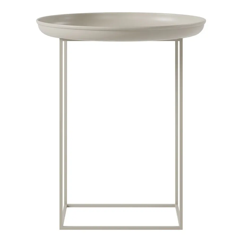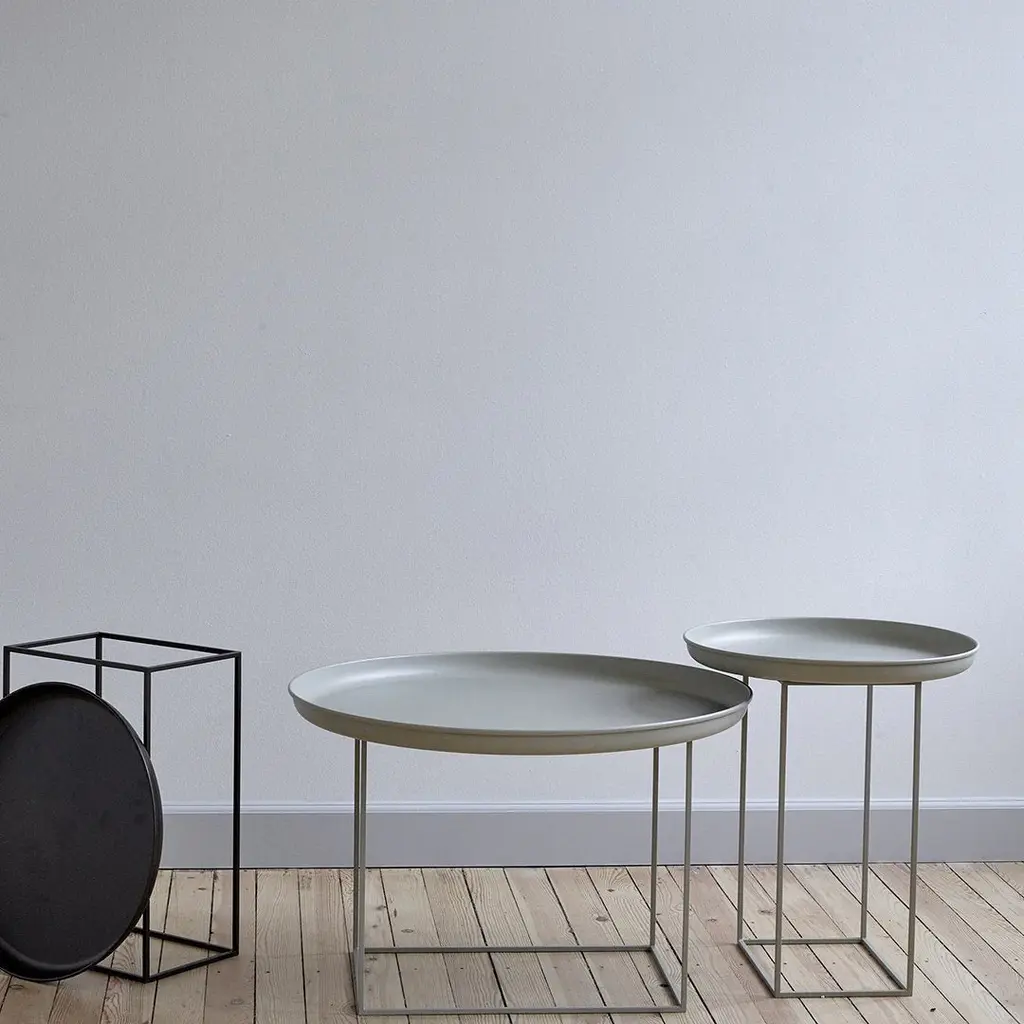 The Duke tables are a series of multi-functional side and coffee tables with a spun metal tray loosely placed on top of a metal frame. The tables come in small, medium and large and can easily be adapted to fit your needs, with the medium size particularly functional. The base can be rotated onto its different faces to create three different table heights, making them suitable to fit any height of sofa or to be used as a bedside table. When all three sizes are placed together they create a nice landscape that compliments any sofa.