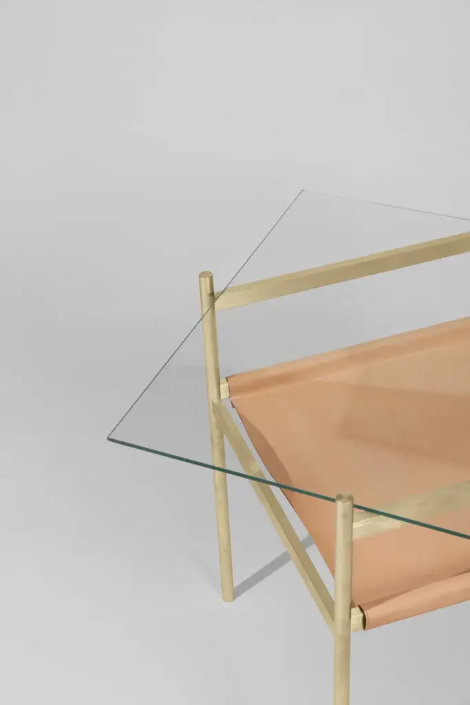 The Duotone Furniture series is based on a modular hardware system that pairs sturdy construction with visual lightness and a range of potential configurations. Each piece is made in Saint Augustine, Florida and is able to flat pack for efficient shipping. The piece assembles simply with snap-in hardware that is tightened with hidden set screws. Suitable for commercial or residential uses. 24” L x 24" W x 24" H This listing is for the Diamond table featuring a brass frame, clear glass, and a natural leather base. Other combinations are available. Email hello@ivyhome.com for custom orders and a price quote with your choice of materials. Please allow 6 weeks for production. Options