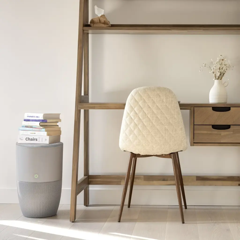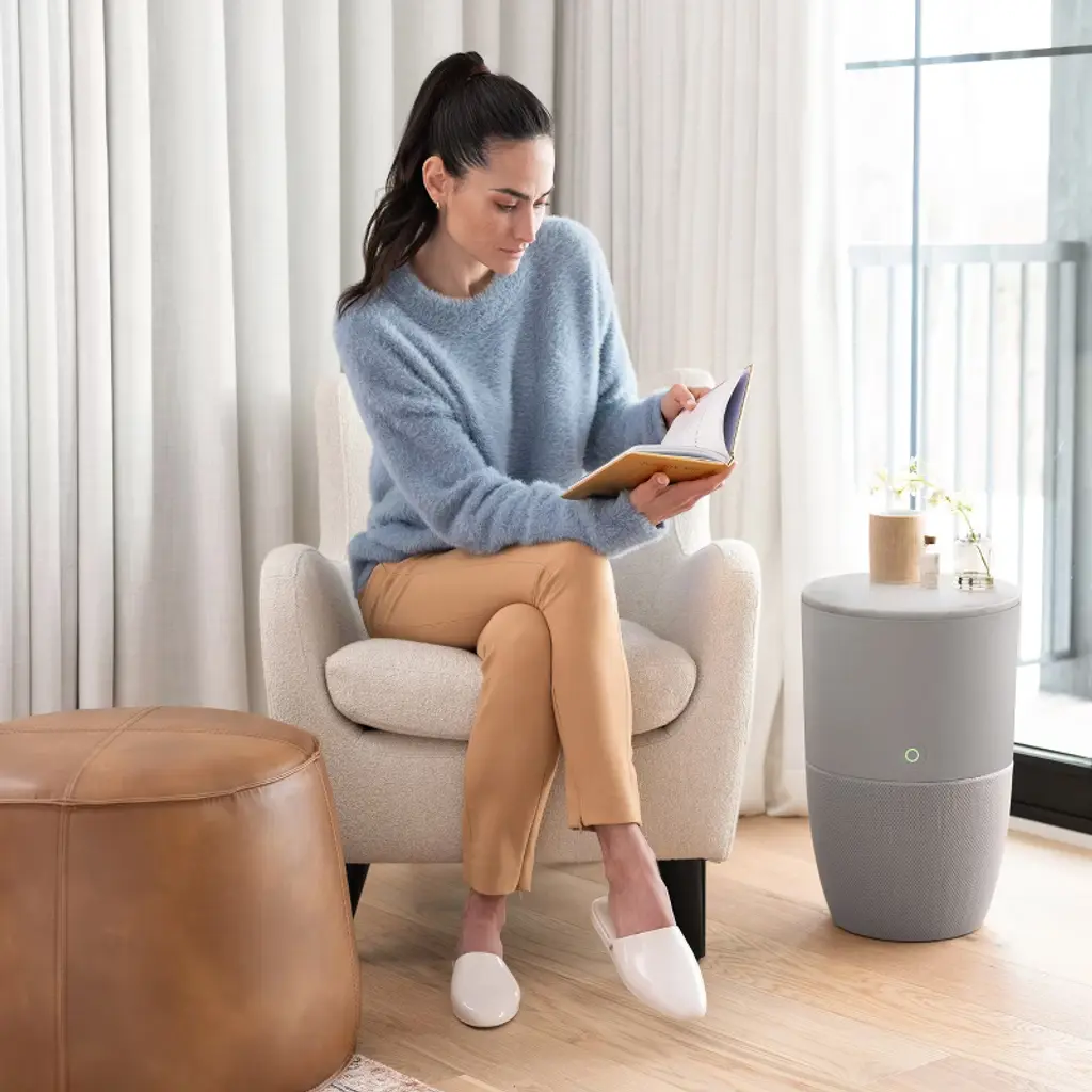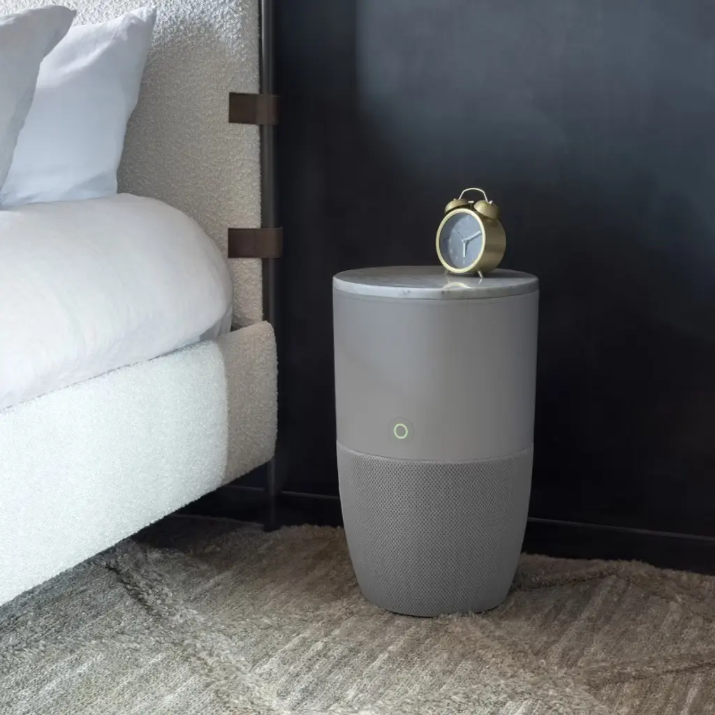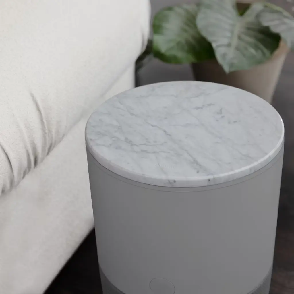 A medical-grade HEPA-13 air purifier with a sleek grey body and Carrara marble top that doubles as a stylish accent table with storage. It captures 99.97% of airborne particles, combining health benefits with elegant, functional design for any room.