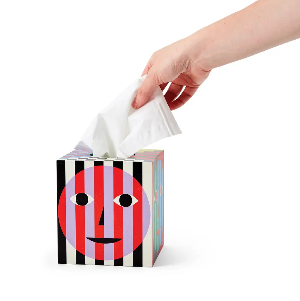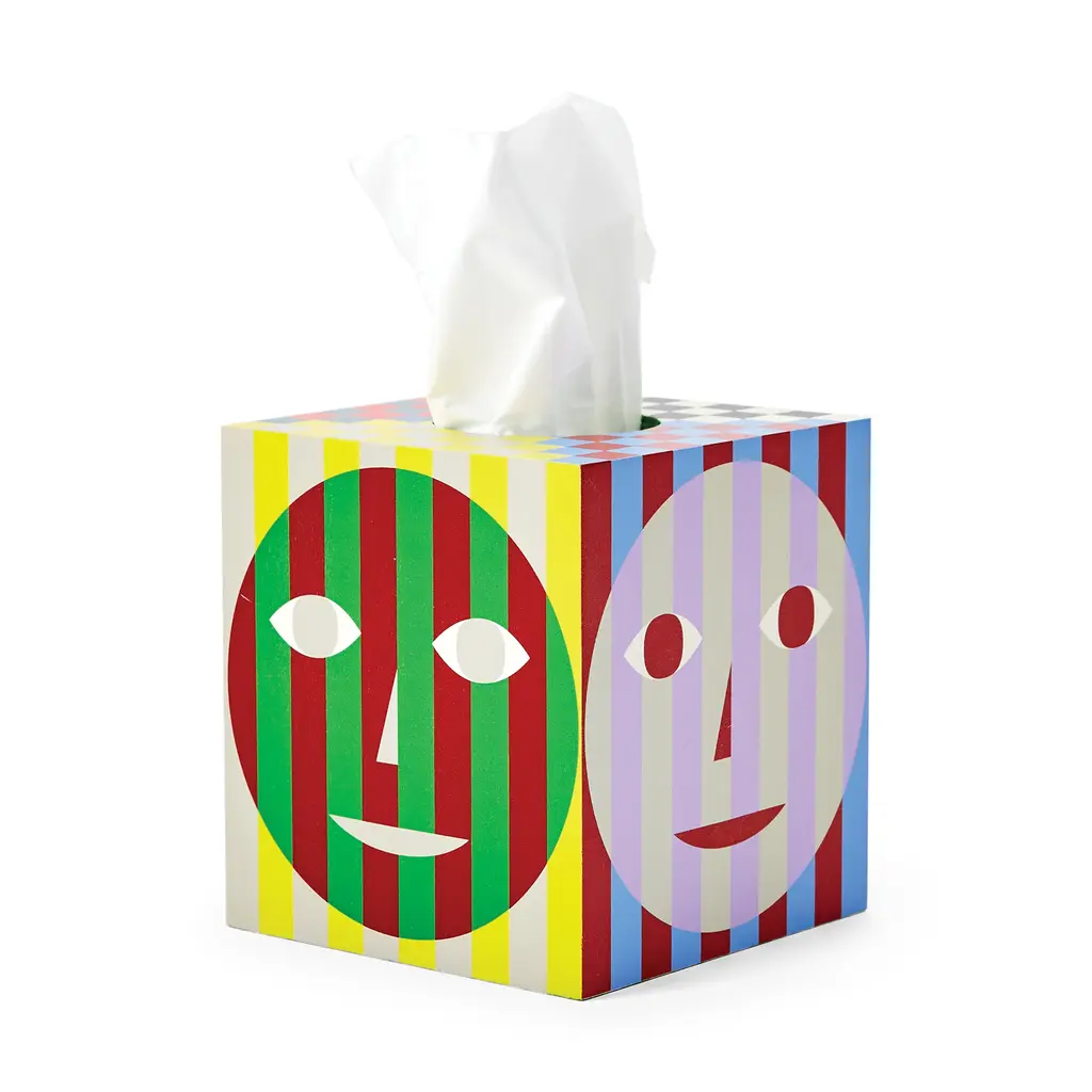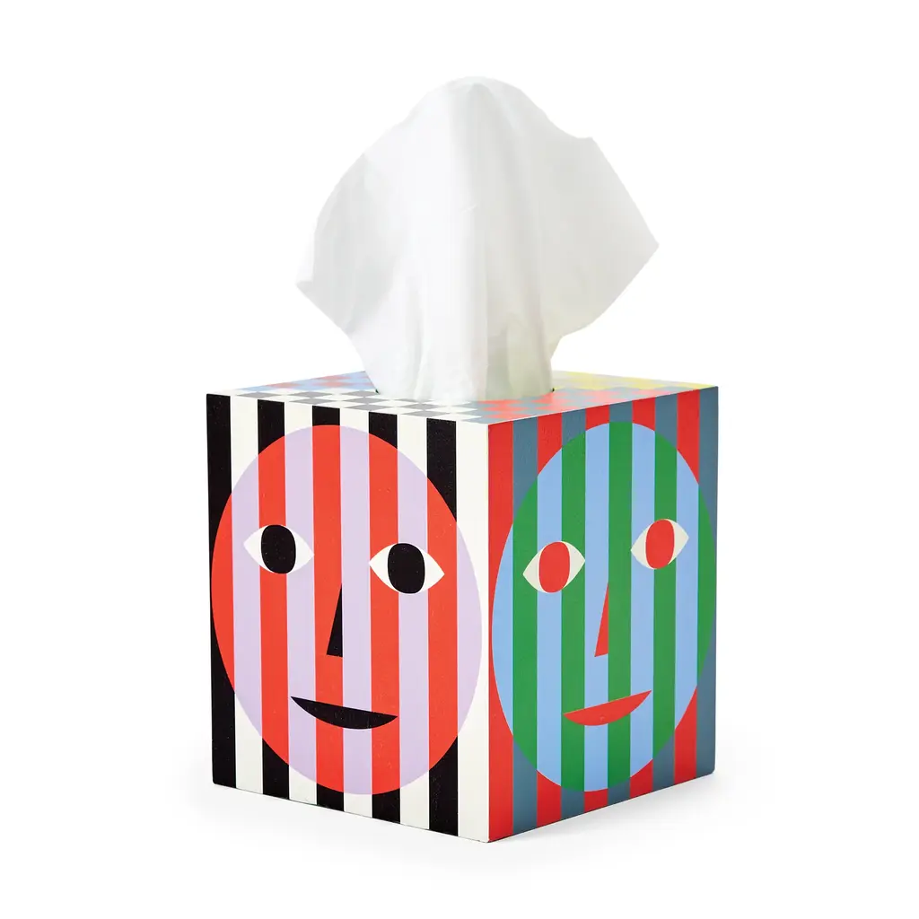 MoMA Exclusive. Everybody needs a tissue sometimes. Take comfort—and company—from this fact whenever you see the cheerful, colorful graphic faces on this Dusen Dusen box, designed to fit over the top of a standard box of tissues. Designed in her signature style by Ellen Van Dusen, the Everybody Tissue Box is based on the design of a limited-edition, hand-painted tissue box she created for the Faces show held at Fredericks & Mae in the fall of 2018. Placed on your vanity, in the bathroom or on a side table, the Everybody Tissue Box adds color and surprising artistry to the sight of an everyday necessity.