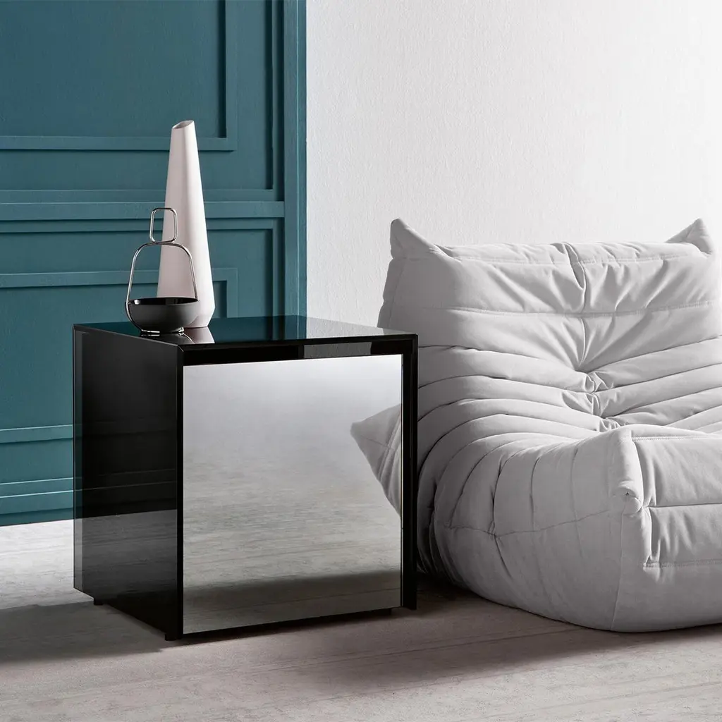 Side Table Dusk with all structure in smocked glass, with 1 drawer with easy glide system. Drawer structure in black wood with smocked mirror glass front.