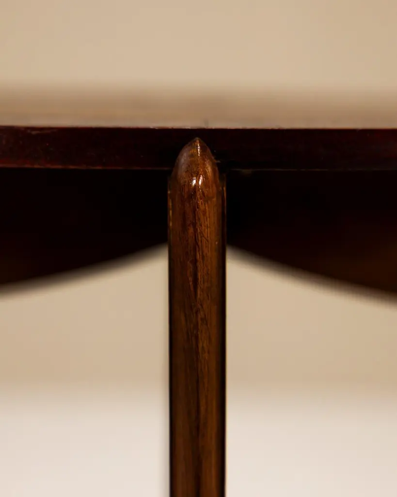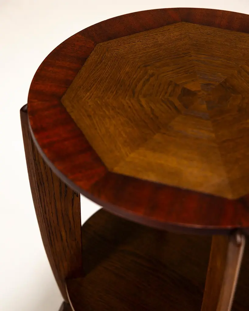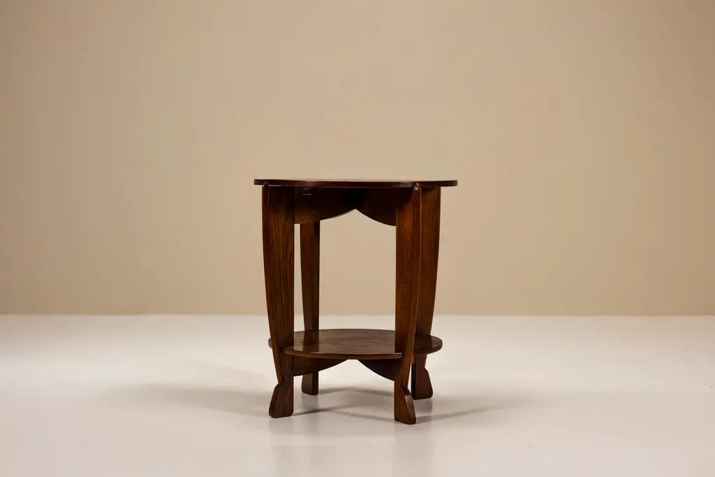 Design that moves quietly often resonates the longest. This Dutch Art Deco side table, model 258 by P.E.L. Izeren, was produced for Genneper Molen in the 1920s and combines proportion, craftsmanship, and rhythm in one composed gesture.DesignThe table features a compact, circular form resting on four slightly curved legs that taper gently toward the floor. These legs are subtly faceted, softening the line without losing clarity. Between them sits a functional lower shelf, also round, adding weight and structure to the silhouette. The top surface holds the eye—a finely inlaid starburst of different wood types creates a geometric pattern that centers the piece. Contrasts in tone and grain create quiet movement across the tabletop, while the warm hues ground the piece. The proportions are tight, neither decorative nor austere. Everything feels measured. Izeren’s work for Genneper Molen always balanced precision and material warmth. This piece is no exception—compact, clear in function, but never dry.A well-composed piece from the Dutch interwar years. It speaks softly, but with presence.ConditionThe overall condition of the this table is very good as it has been professionally restored without losing its original vibe.