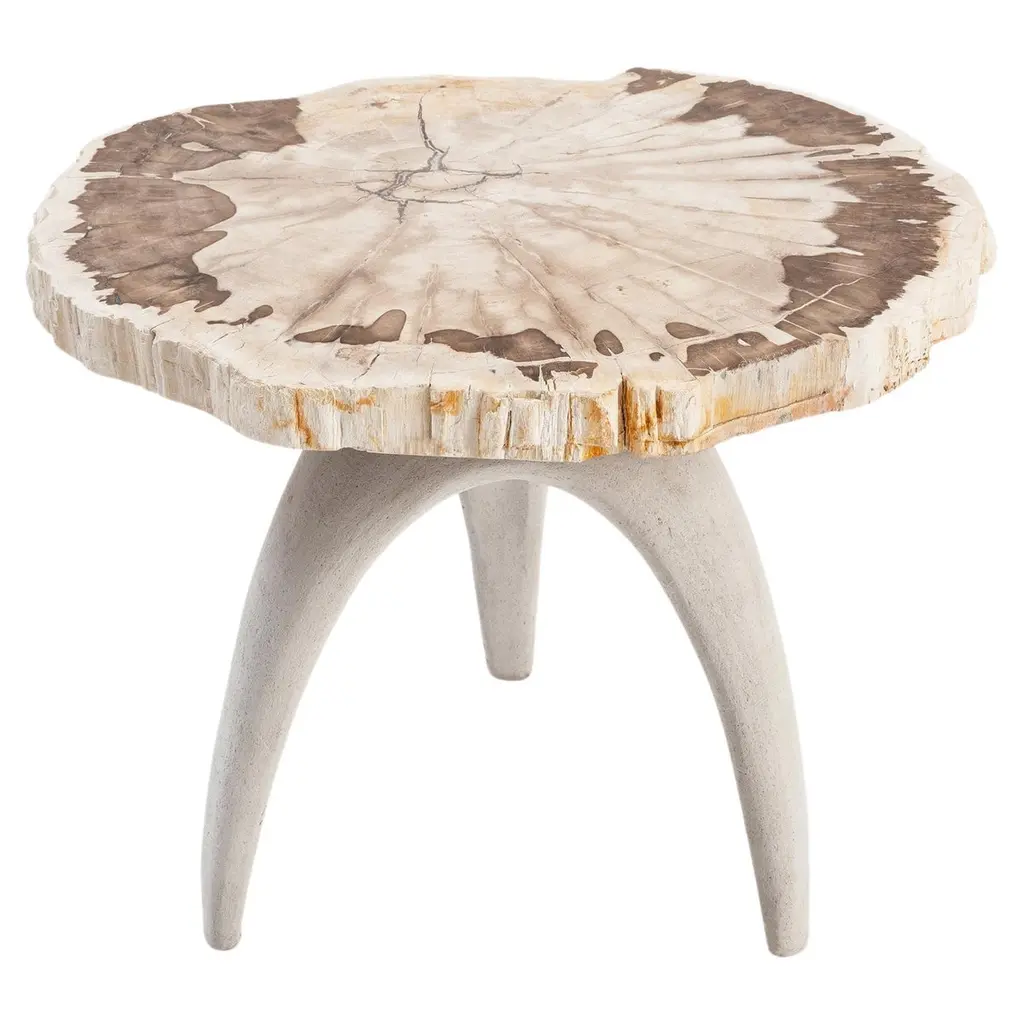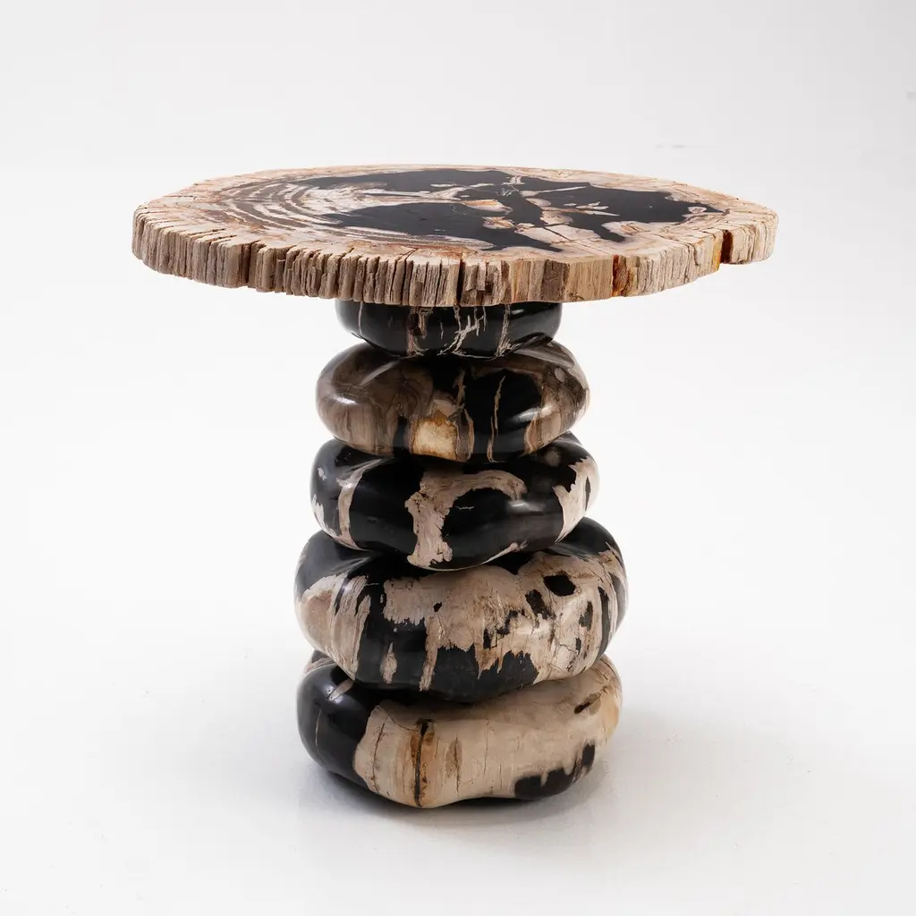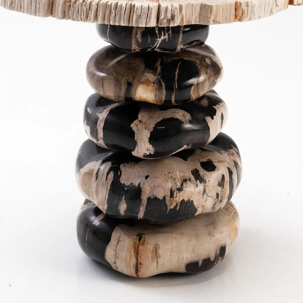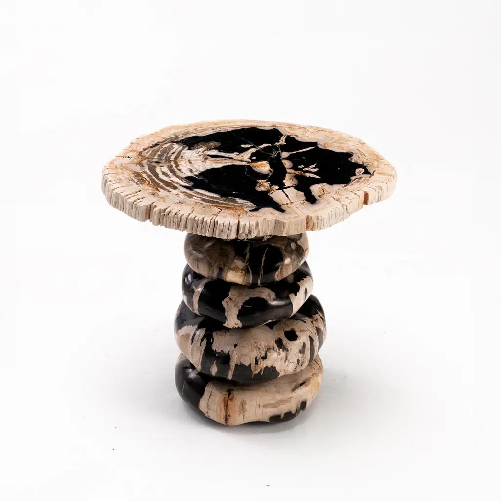 Born from our lifelong obsession with stacking rocks, this totem-like side table features hand-sculpted, organic shaped petrified wood forms, adorned with a striking raw Petrified wood slice.This is a meticulously hand sculptured product. Each object will have its own unique presence and feature interesting variations in the natural materials and forms created during the artisanal process.Petrified wood is created from fossilized trees transformed into stone by a mineralization process that occurs underground, over hundreds of millions of years. This rare material features striking colors and motifs created by the mineral formation process, comprized of semi-precious minerals such as quartz, chalendony and jasper. Handmade to order unless listed in stock.Any natural blemishes or irregularities should not be misconstrued as flaws; these perfectly imperfect details are what make each piece unique. Petrified wood is a natural material and each piece is hand-sculpted by artisans. Variations in size (+/- 3cm) may occur.----------Odditi takes a curious look at the relationship between nature and humanity, exploring our inner and outer landscapes and creating objects that live between the worlds of art and design.