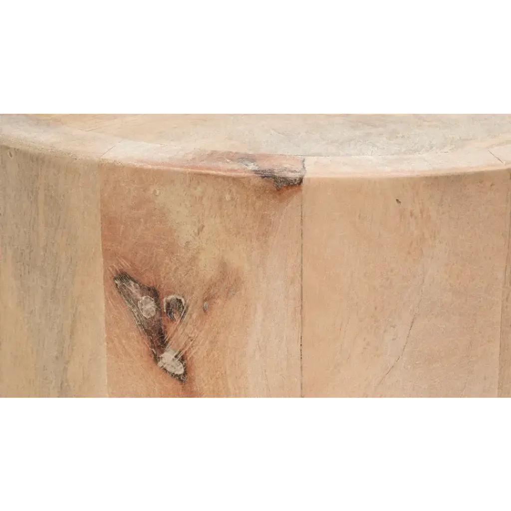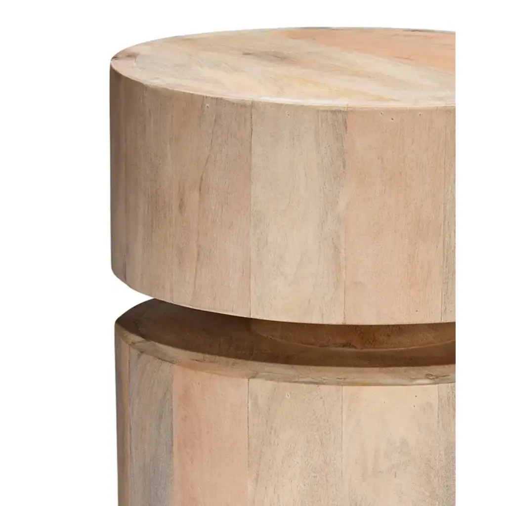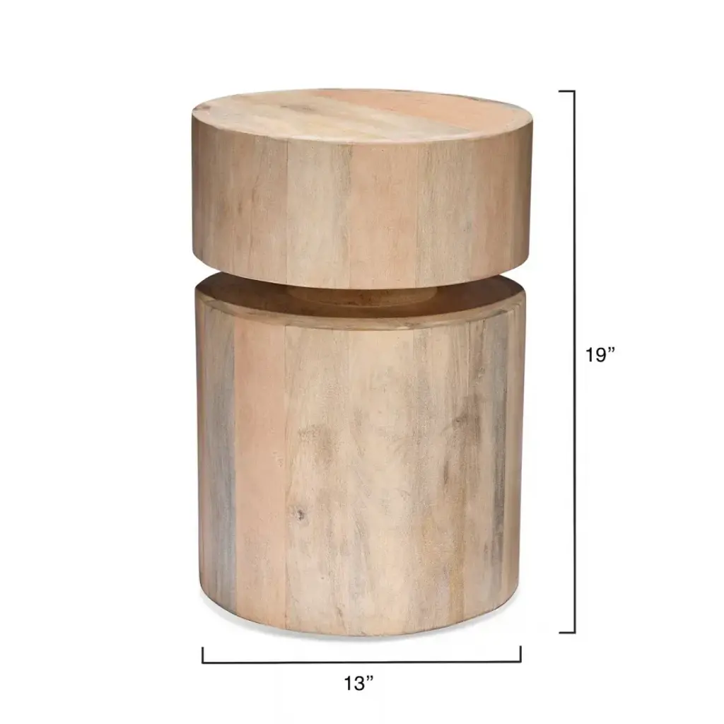 Spare and almost sculptural in its simplicity, this geometrically inspired accent table is formed of three stacked cylinders. It has been expertly handcrafted of wood and finished by hand in a neutral stain that highlights the veining and knots that are inherent to the wood, ensuring that no two are identical. With a small footprint to make placement easy, the side table can enhance any modern décor.