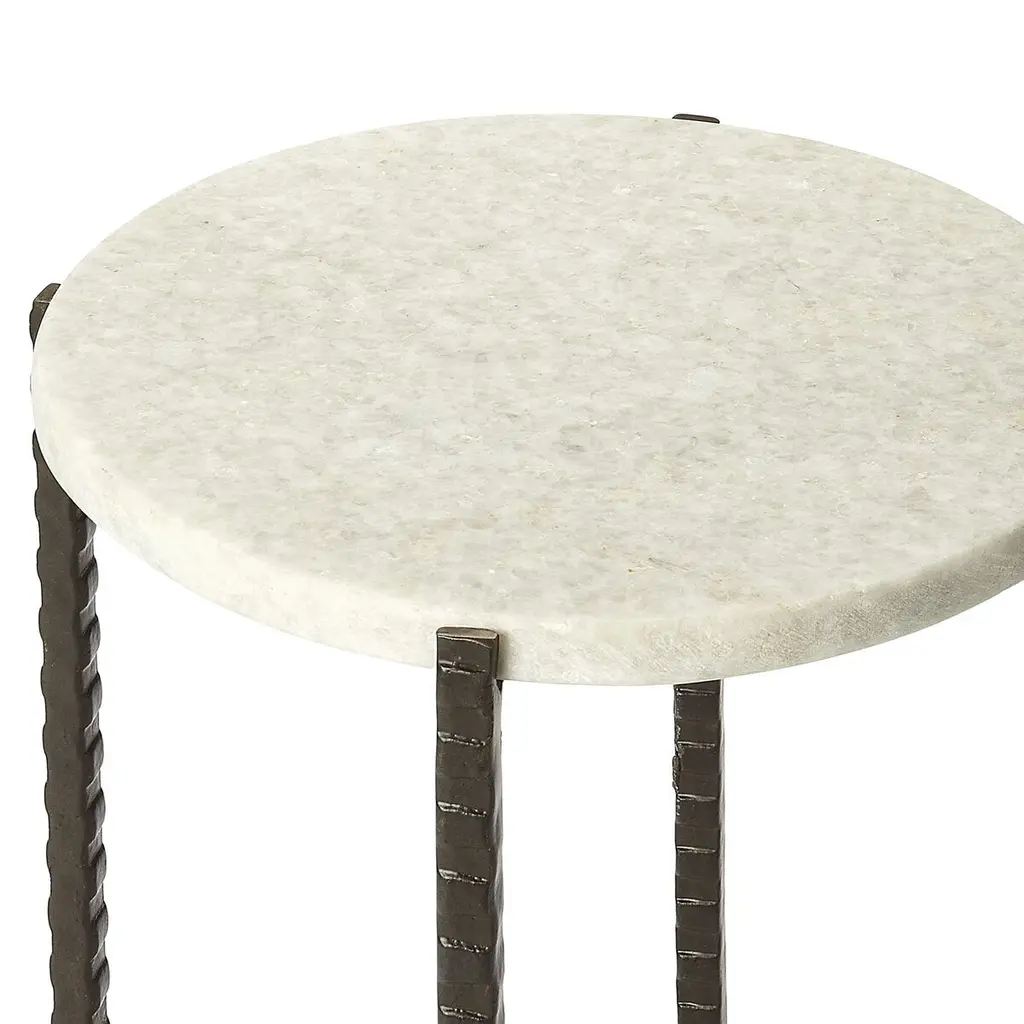 This plain and simple round accent table is nothing less than fashionable. The twisted iron legs gracefully support a smooth marble slab, creating a harmonious blend of elegance and functionality. This table caters to your needs in both style and space, making it a versatile addition to any room. Use it in pairs as petite end tables flanking your modern sofa, or place it in the entryway with a basket atop to catch your keys. Its understated charm and timeless design make it a perfect companion for your home, inviting admiration and adding a touch of romance to your living space.