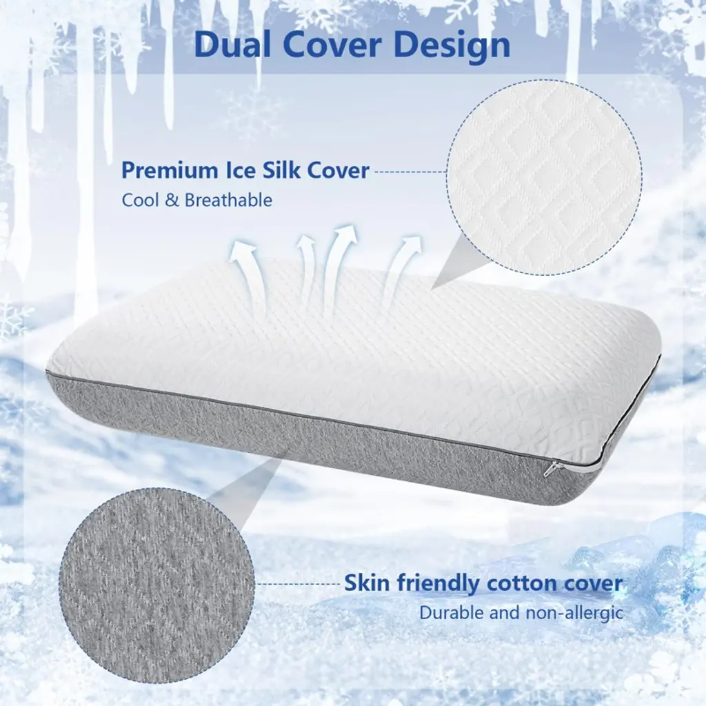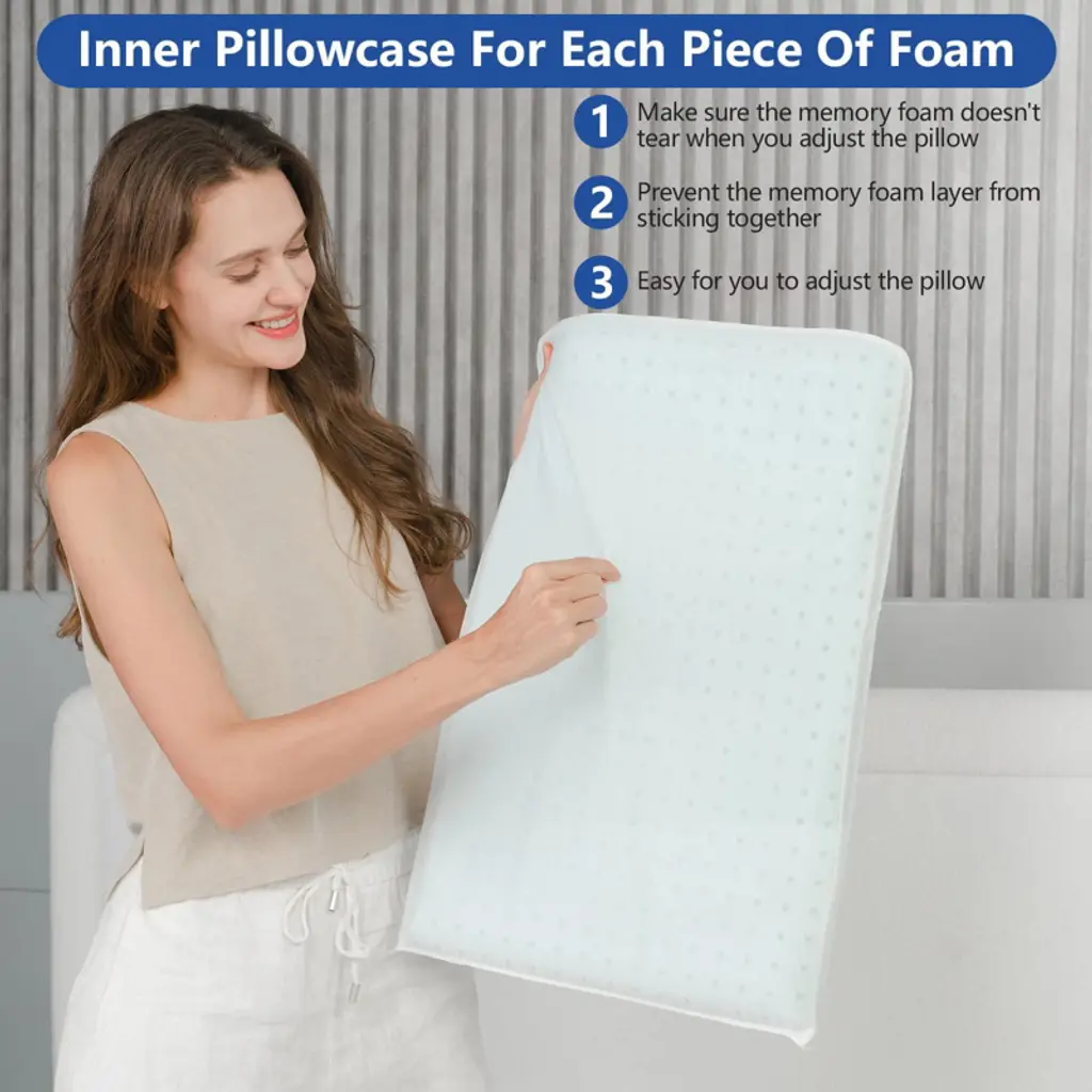 Experience the ultimate customizable sleep with our upgraded adjustable pillow, expertly engineered with three CertiPUR-US certified memory foam layers that you can arrange to achieve your ideal height and firmness for unparalleled support.Designed for all sleepers, it features a innovative air circulation system and cooling gel-infused foam to keep you refreshingly cool all night long.Enjoy year-round comfort with its double-sided cover—a cooling ice silk side for hot nights and a soft cotton side for daily use—all while resting assured that it's fiberglass-free and built with durable, inner-cased layers for long-lasting use.
