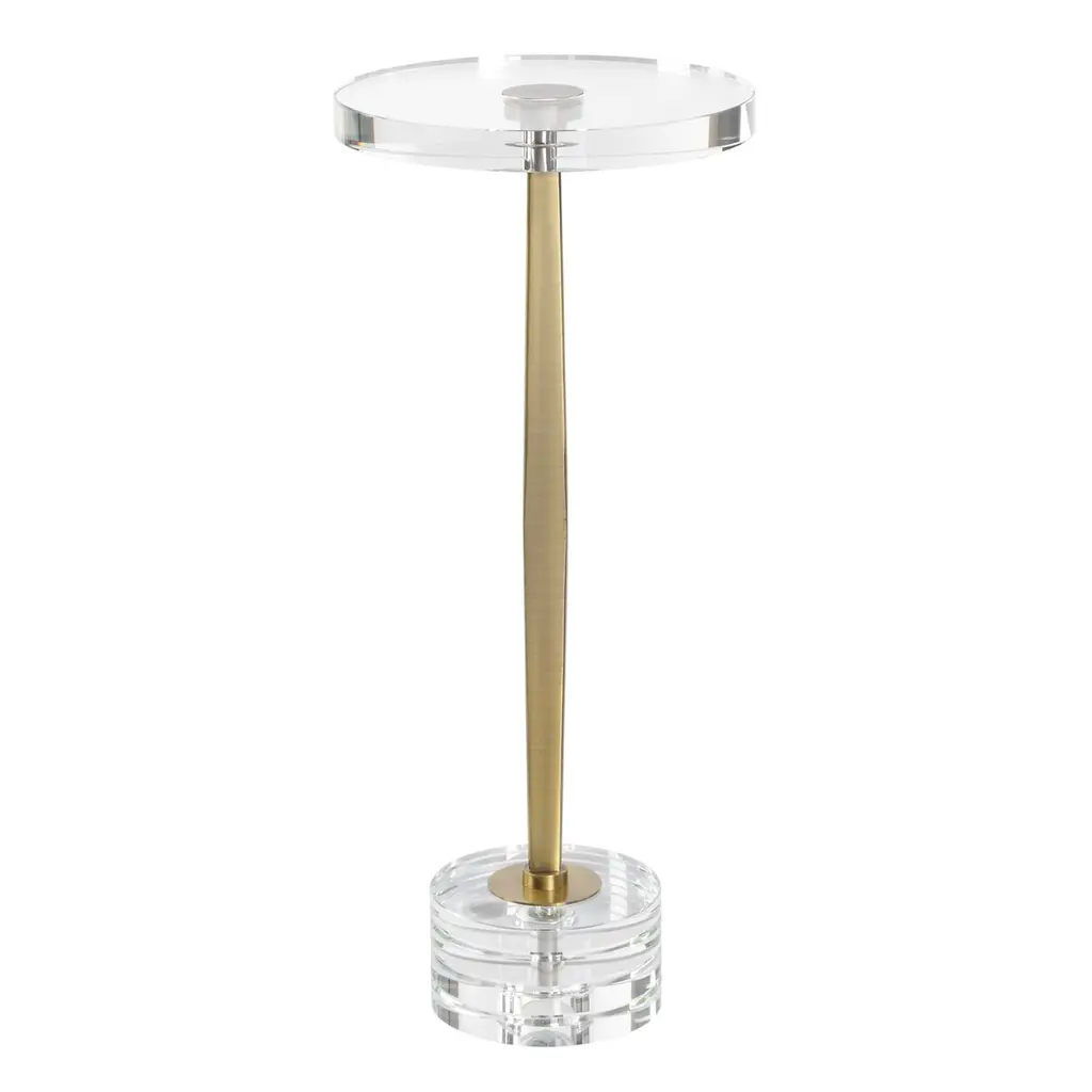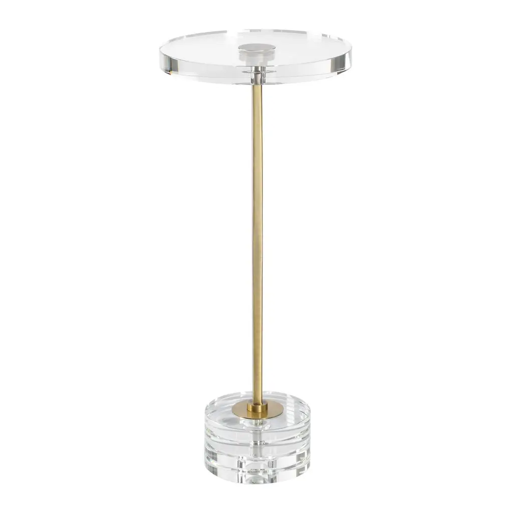 The Eamon Drink Table is a testament to timeless elegance and refined craftsmanship. Its sophisticated ribbed crystal base exudes an air of luxury, perfectly complemented by the coordinating thick crystal top that gleams with every reflection of light. The iron stem, finished in a classic brushed gold, adds a touch of warmth and opulence, creating a harmonious Silvan between modern design and classic allure. This exquisite piece is more than just a table; it's a statement of style and a centerpiece that invites admiration and conversation. Let the Eamon Drink Table be the heart of your living space, where elegance meets functionality in perfect harmony.
