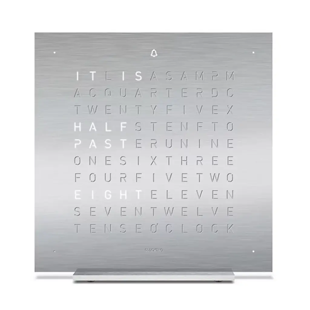 The EARTH 13.5 METAL Table Alarm Clock by QLOCKTWO is a compact and unique timepiece that illuminates a matrix of letters, spelling out the time of day to you. Crafted to complement your bedside table, this precision clock offers an alarm and a light sensor that automatically adjusts the LED brightness of this piece to match the surrounding environment. Sleep in peace with night touch technology, allowing the display to illuminate only for a few seconds when touched or opt for the nightlight function to keep your space softly illuminated.
