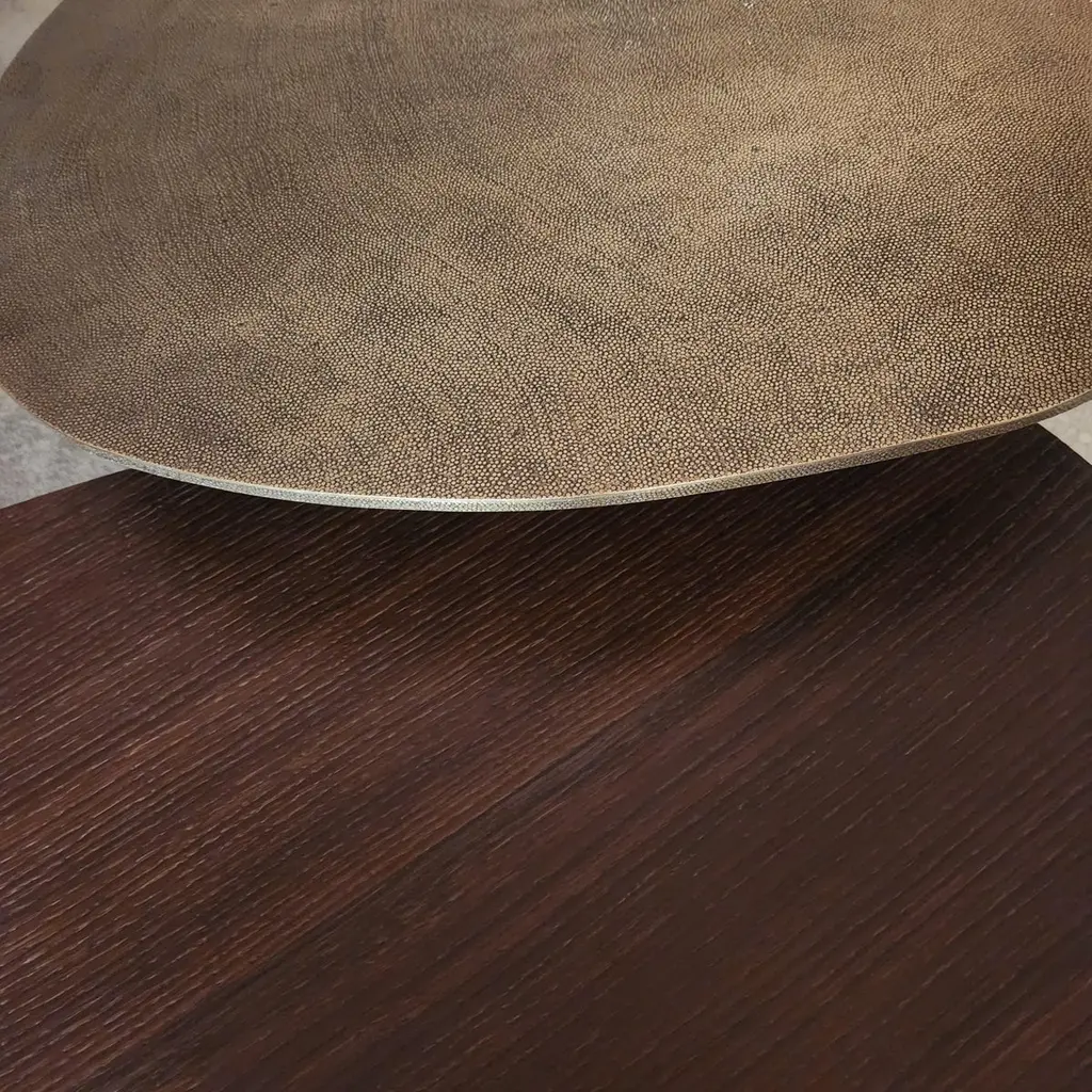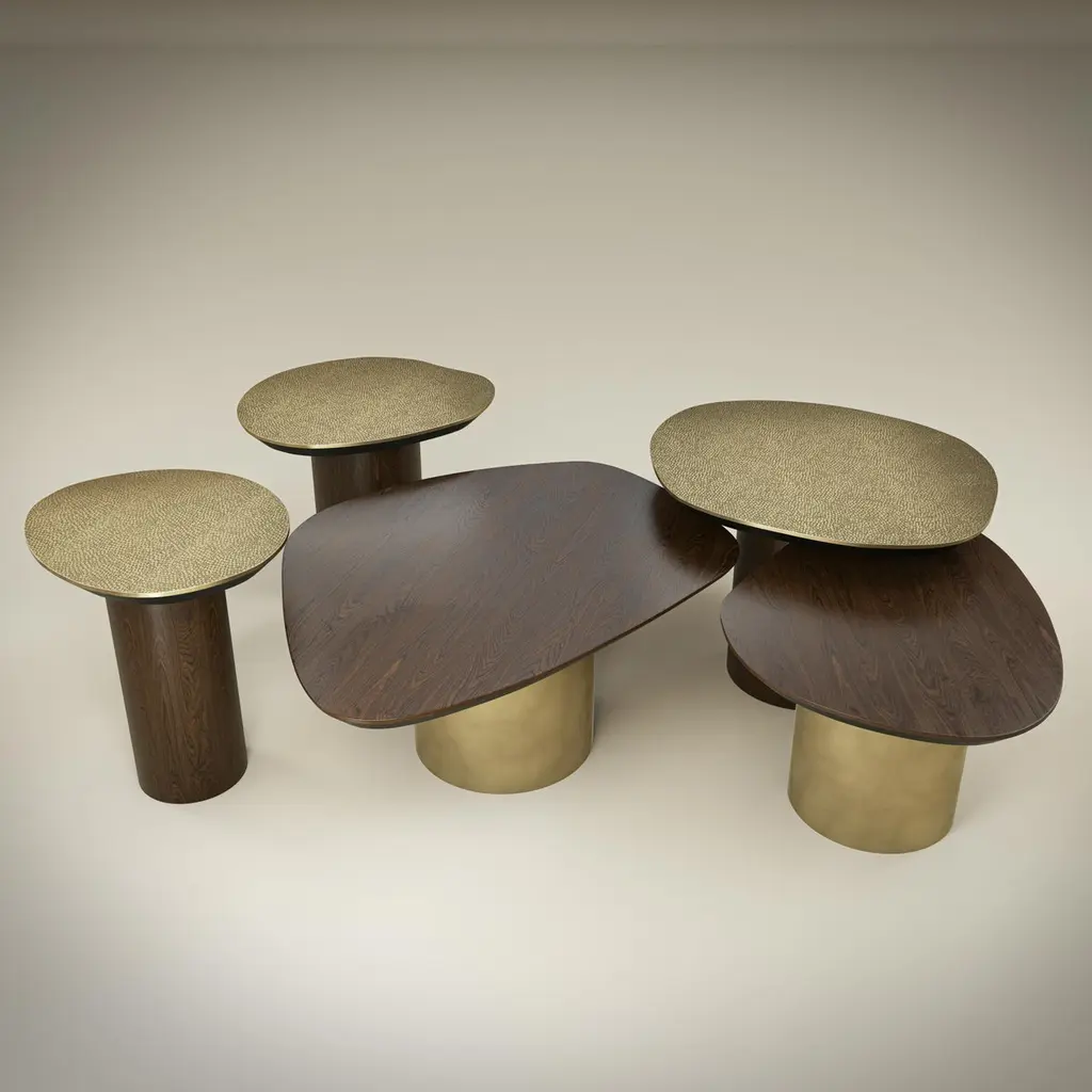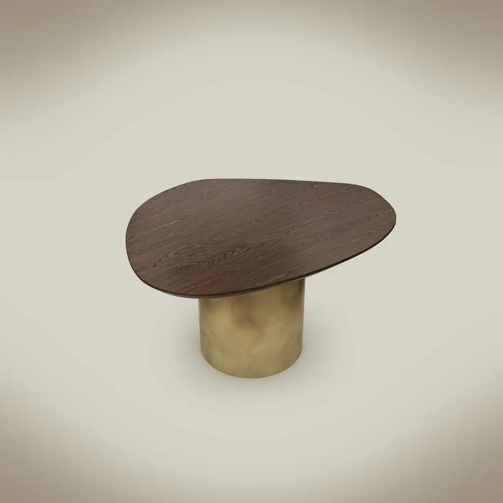 The Earth Prints 2 side table features a dark oak veneer top with free-form contours, resting on a cylindrical base in brass with an aged gold patina. The contrast between wood and metal highlights a balanced and understated design.Handcrafted with meticulous attention to detail, each table in the Earth Prints collection is unique. The carefully finished oak top reveals a subtle, deep grain that reflects the authenticity of the wood. The hand-patinated brass base adds a touch of timeless elegance and ensures overall stability. This piece emphasizes irregular lines and a deliberately asymmetrical composition.With a length of 75 cm, width of 55 cm, and height of 40 cm, it offers a generous surface while maintaining proportions suited to a side or coffee table.This model can also be combined with the four other tables in the Earth Prints series—each with its own shape and height—to create a cohesive and rhythmic ensemble.