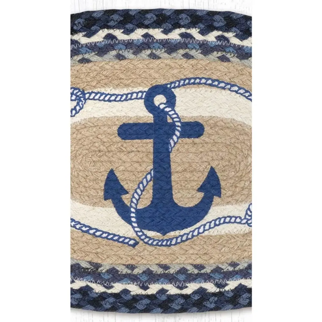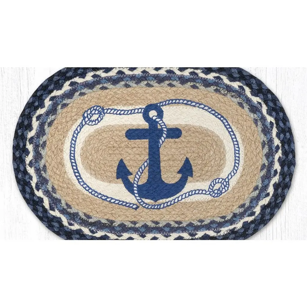 Elevate your dining experience with the Earth Rugs Anchor Oval Placemat in navy. Measuring 13"x19", this nautical-themed accent adds a refined touch to any table setting. Crafted for durability and style, its rich navy tone and anchor design create a coastal ambiance while protecting surfaces from spills and scratches. Ideal for both everyday meals and special occasions, this placemat blends functionality with classic nautical charm. Key Features: Design: Classic navy anchor print that adds a nautical, seaside touch Size: 13” x 19” oval placemat, perfect for dining tables, buffets, or serving areas Style: Complements nautical, coastal, beach house, seaside cottage, or rustic lodge decor Material: Durable braided construction with detailed printed anchor design Care Instructions: Spot clean with mild soap and water; air dry for best results Versatile Use: Ideal for everyday meals, coastal dining settings, or decorative beach house accents