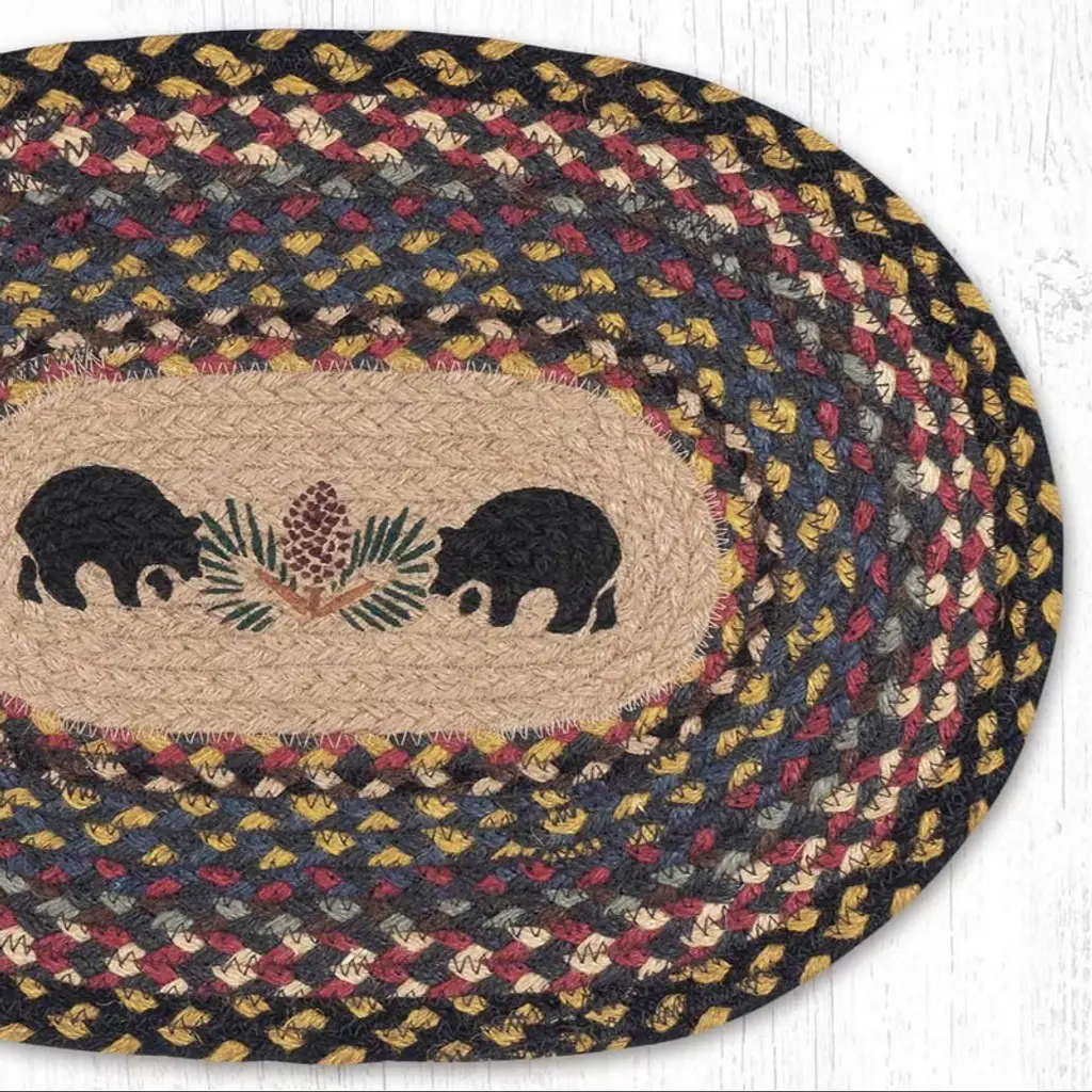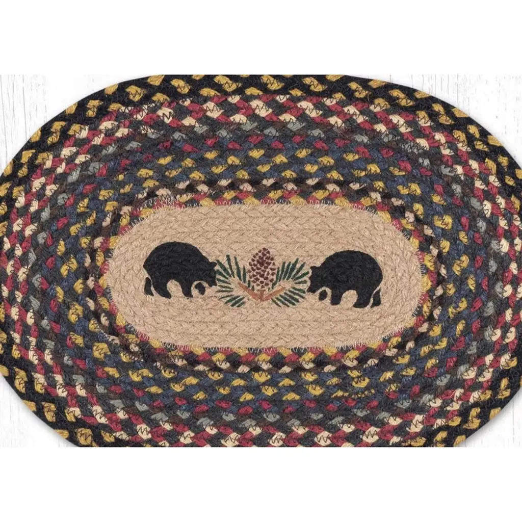 Earth Rugs Black Bears Oval Braided Jute Placemat – 13"x19" Hand-stenciled Rustic Cabin Table Accent