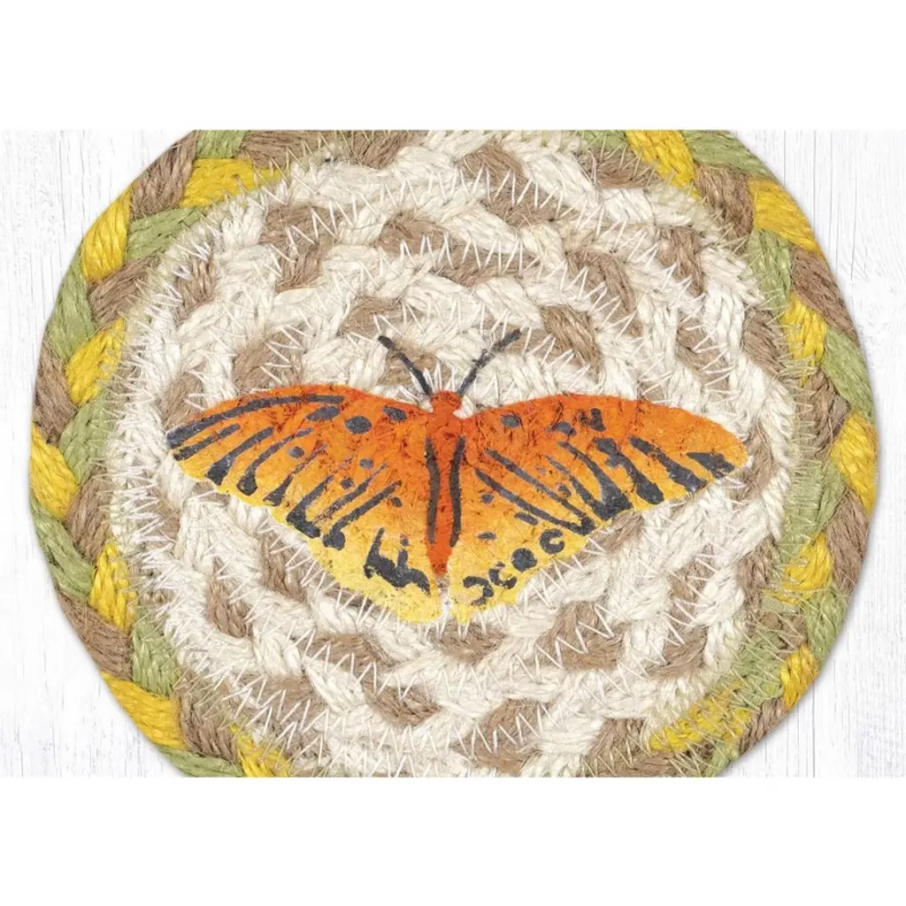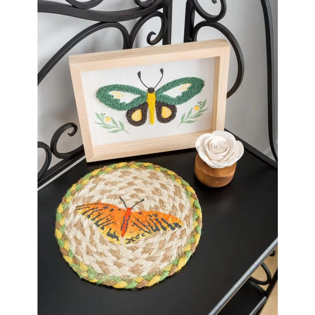 Enhance your tabletop with the Earth Rugs IC-654 Butterfly Printed Coaster, a 5"x5" handcrafted jute table mat designed for rustic charm and everyday practicality. Made from natural braided jute fibers, this square coaster features a beautifully detailed butterfly print that adds a touch of nature-inspired artistry to any dining or coffee table. The durable, heat-resistant jute construction protects surfaces from spills and scratches while blending seamlessly with farmhouse, cottage, or country-style interiors. Perfect for mugs, cups, or decorative displays, this eco-friendly coaster brings handcrafted texture and timeless appeal to your home. Protects tabletops from heat, stains, and scratches (5"x5") Eco-friendly jute material for sustainable home stylingNature-inspired butterfly design enhances rustic decor appeal Compact and lightweight for versatile use on tables, desks, and countertopsHand-braided construction offers unique artisanal texture