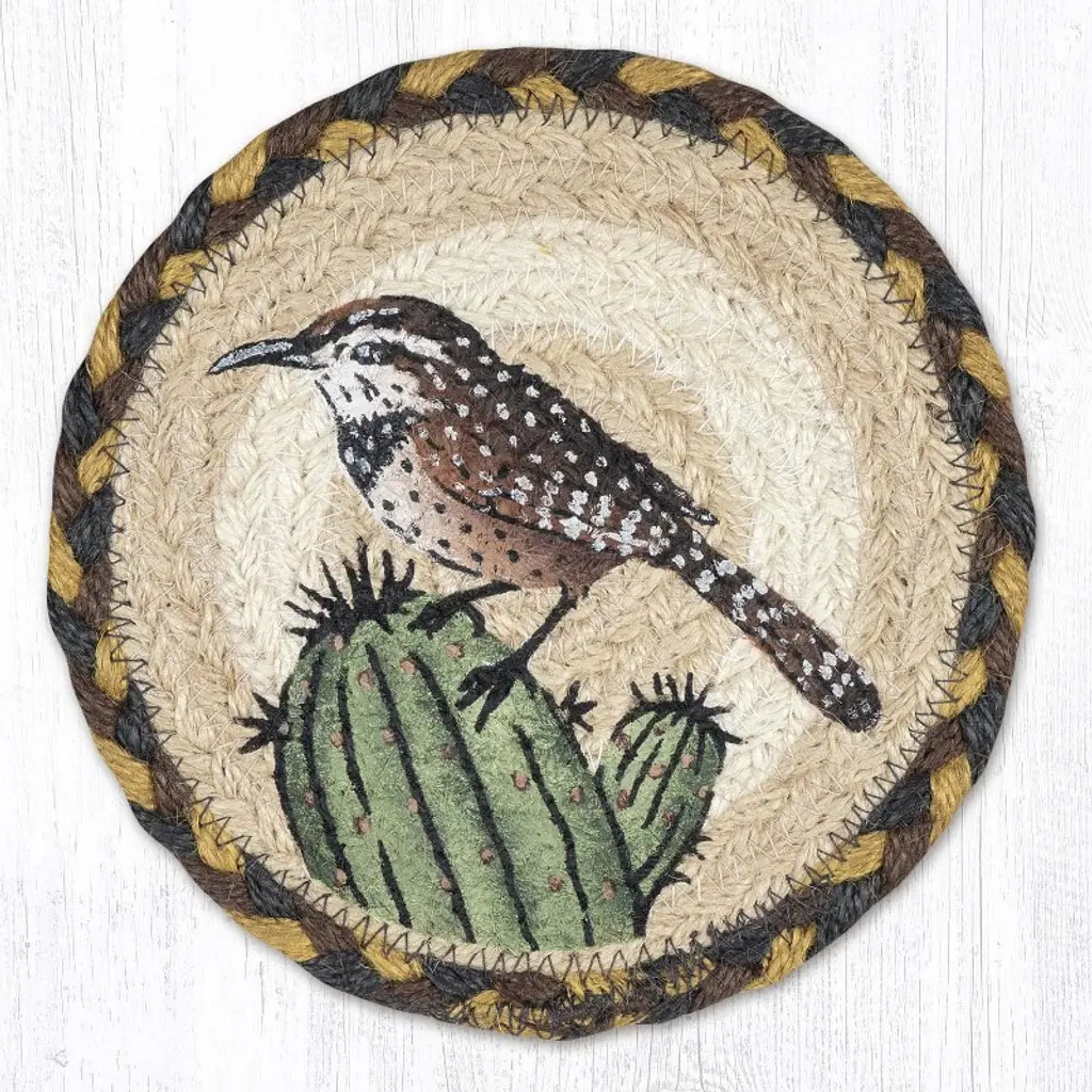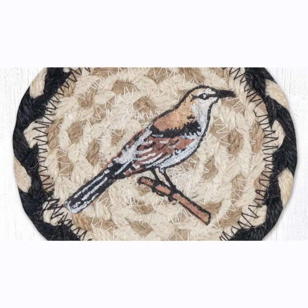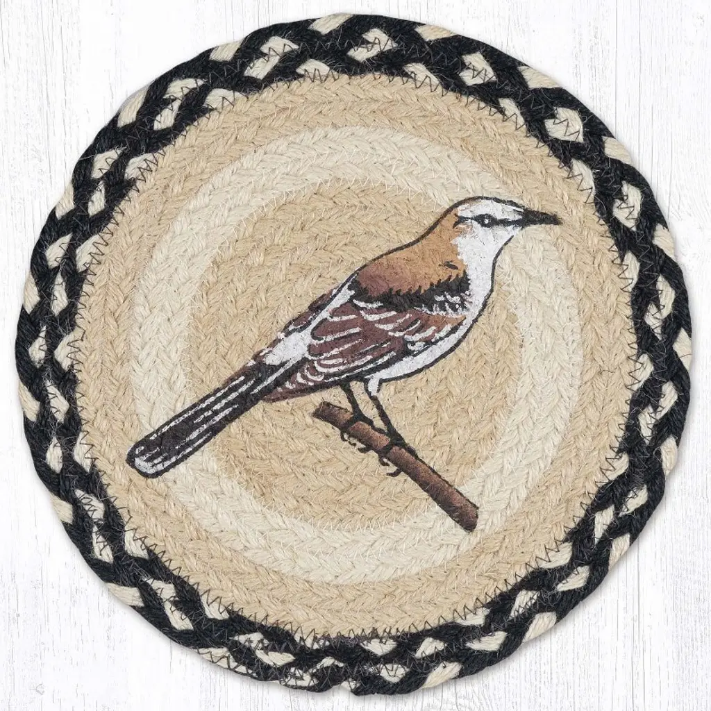 Earth Rugs Mockingbird Printed Coaster – 5"x5" Braided Jute, Nature-inspired Rustic Bird Table Accent