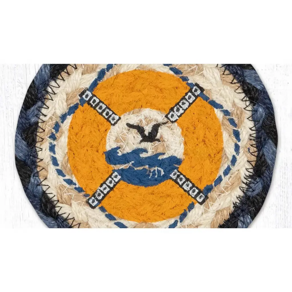 Infuse your home with a breezy, nautical vibe using the Earth Rugs Nautical Lifebuoy Printed Coaster. This 5" x 5" square coaster is handcrafted from natural braided jute and features a red and navy lifebuoy design—perfect for beach houses, coastal kitchens, or lake cabins. The soft, durable jute material provides a rustic texture that protects surfaces from heat and moisture while adding visual charm. Compact yet eye-catching, this coaster is reversible and flat, making it ideal for use on coffee tables, dining settings, or outdoor patios. Key Features: Material: Hand-braided 100% natural jute Color: Beige with red and navy lifebuoy print Frame: Frameless, braided edge finish Dimensions: 5" Height × 5" Width Style Match: Complements coastal, nautical, rustic, and cottage-style interiors