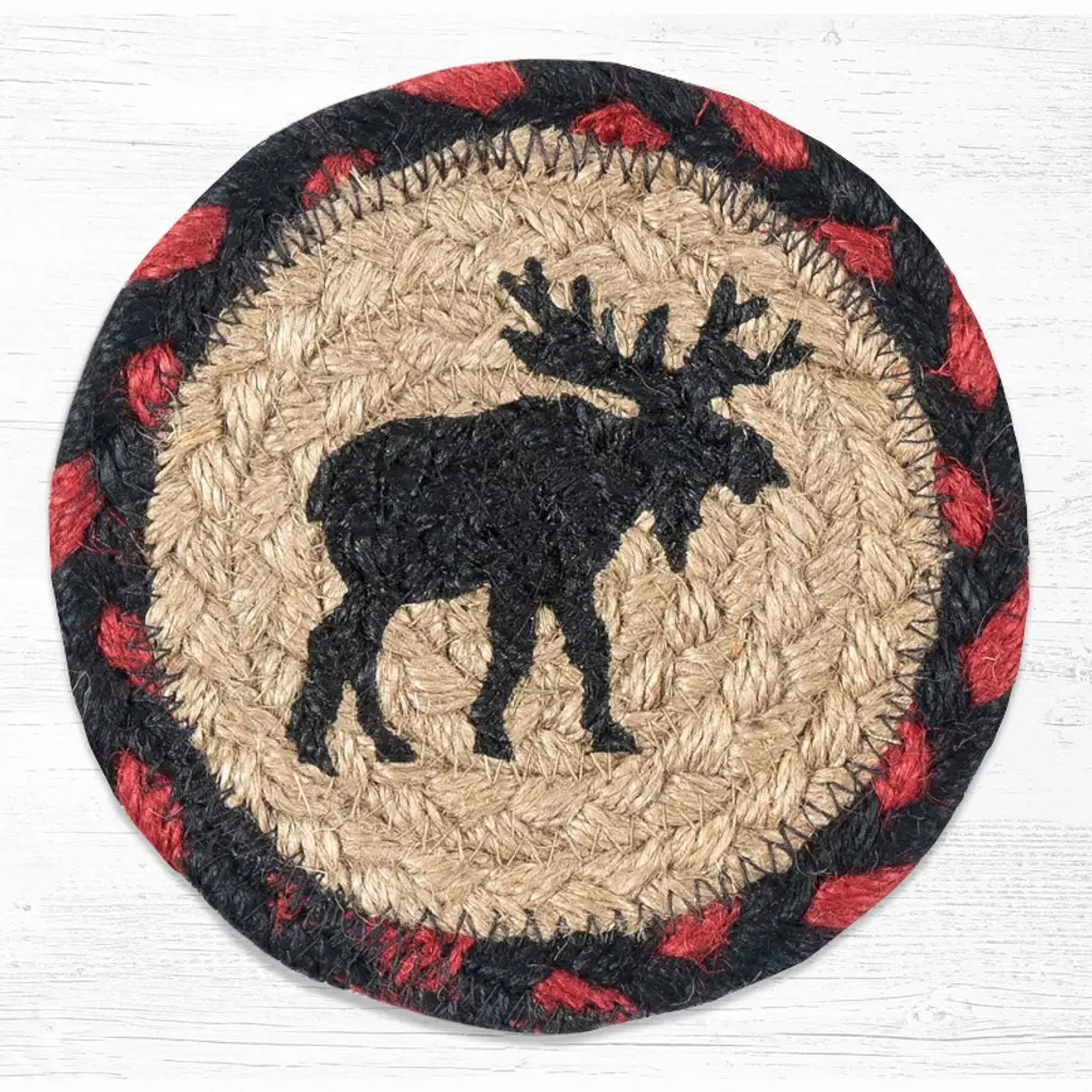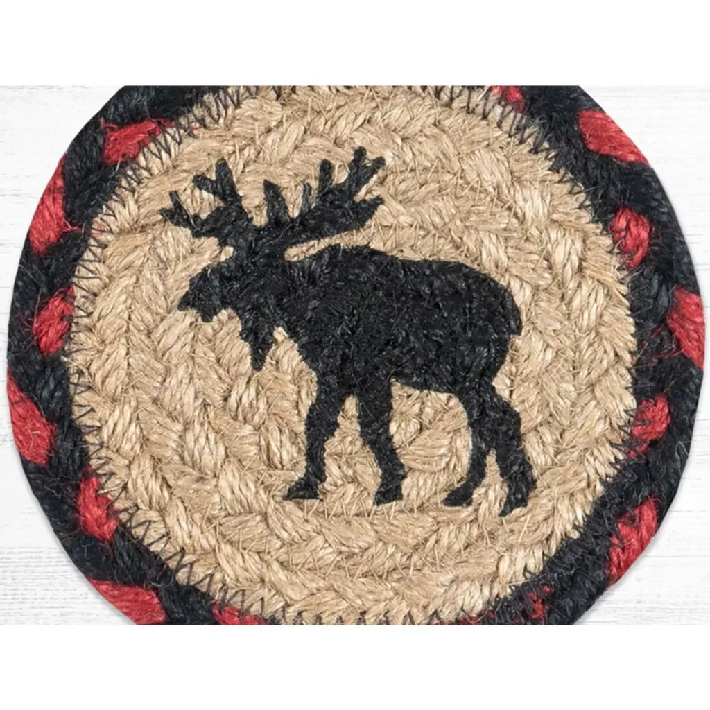 Earth Rugs Printed Coaster – Black Moose Design, Rustic Braided Jute Lodge Accent, Wildlife Cabin Table Decor, 5"x5"