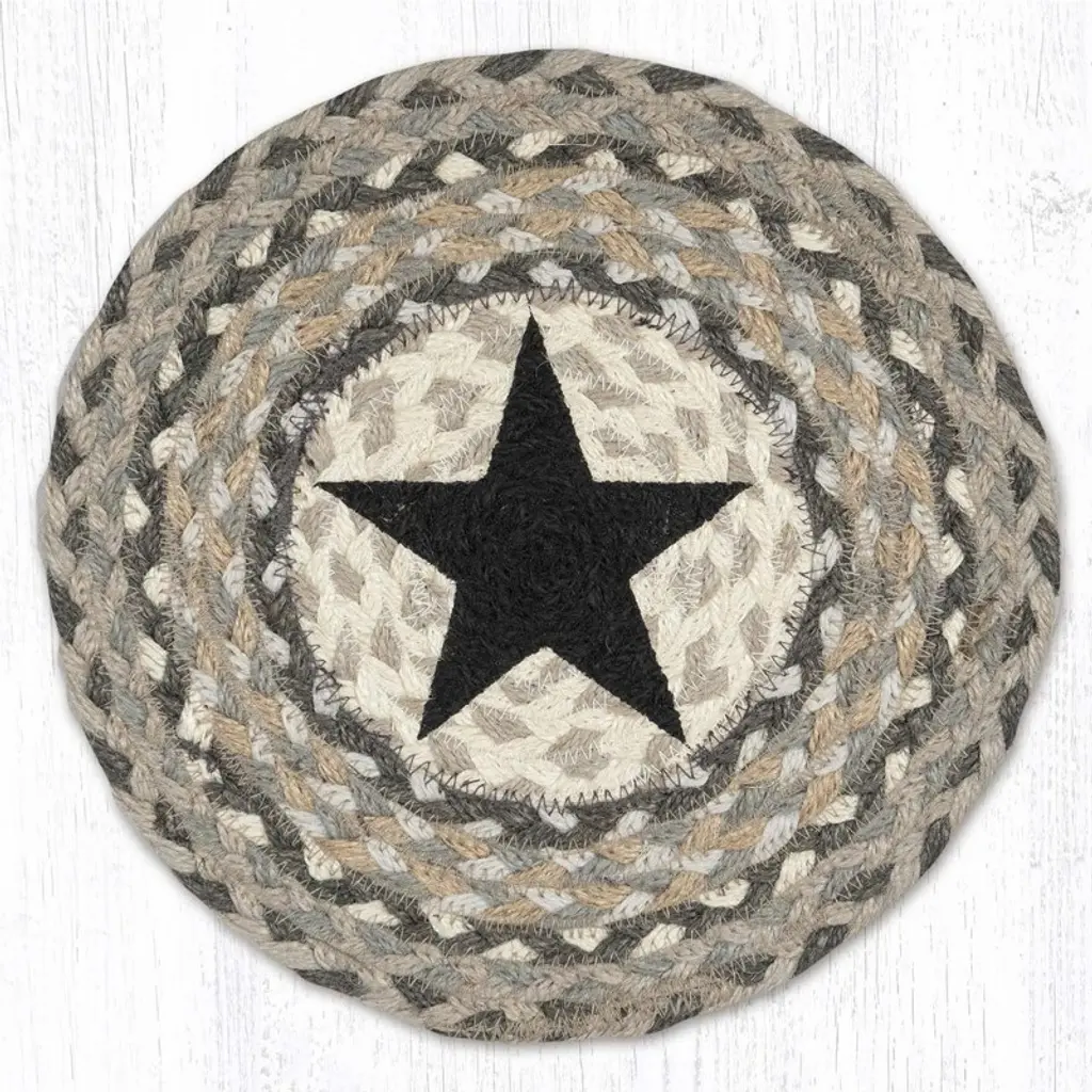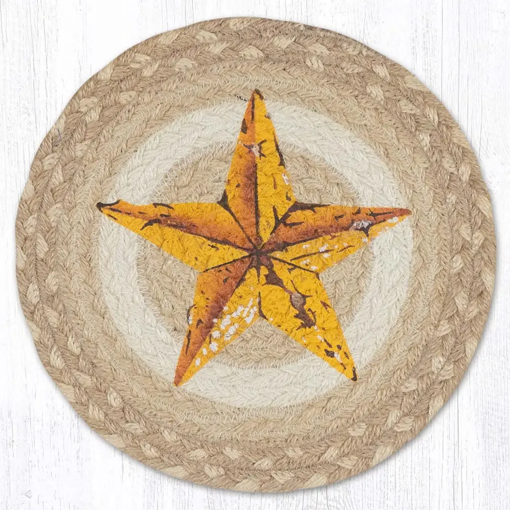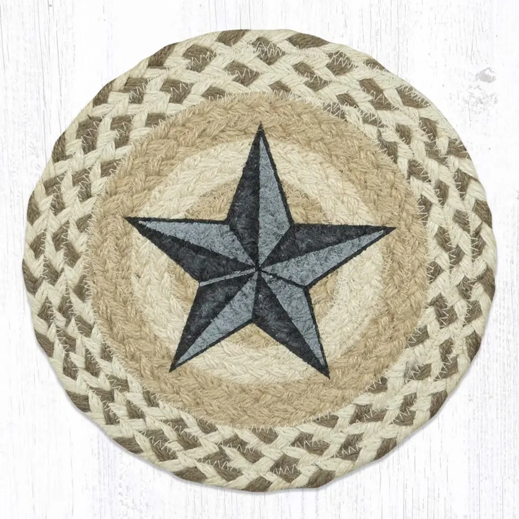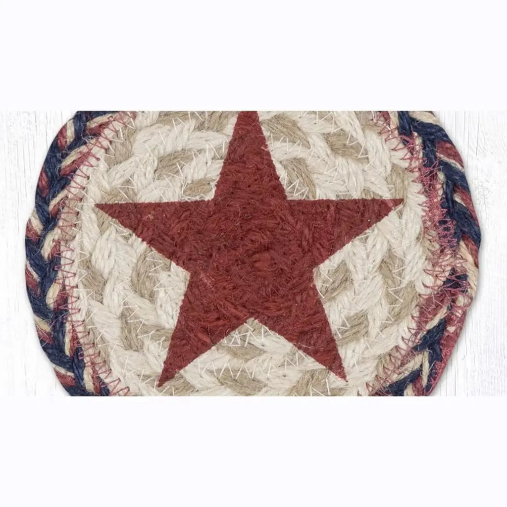 Add rustic warmth to your space with the Earth Rugs Red Star Printed Coaster, featuring a classic 5-inch round shape and bold primitive styling. The distressed red star design printed on a neutral background evokes a cozy Americana feel, making it a perfect fit for farmhouse kitchens, living room coffee tables, or seasonal patriotic displays. Crafted from durable fabric with a soft backing, this coaster protects surfaces from heat and moisture while adding decorative charm. Its compact round profile ensures easy storage and placement, blending function and design in one timeless accent. Key Features: Material: Durable printed fabric (commonly cotton or jute blend – confirm if needed) Color Theme: Rustic red star on beige-toned background Shape: Round for a soft, traditional appearance Dimensions: 5" Diameter Style Match: Ideal for primitive, farmhouse, country, and Americana-inspired decor