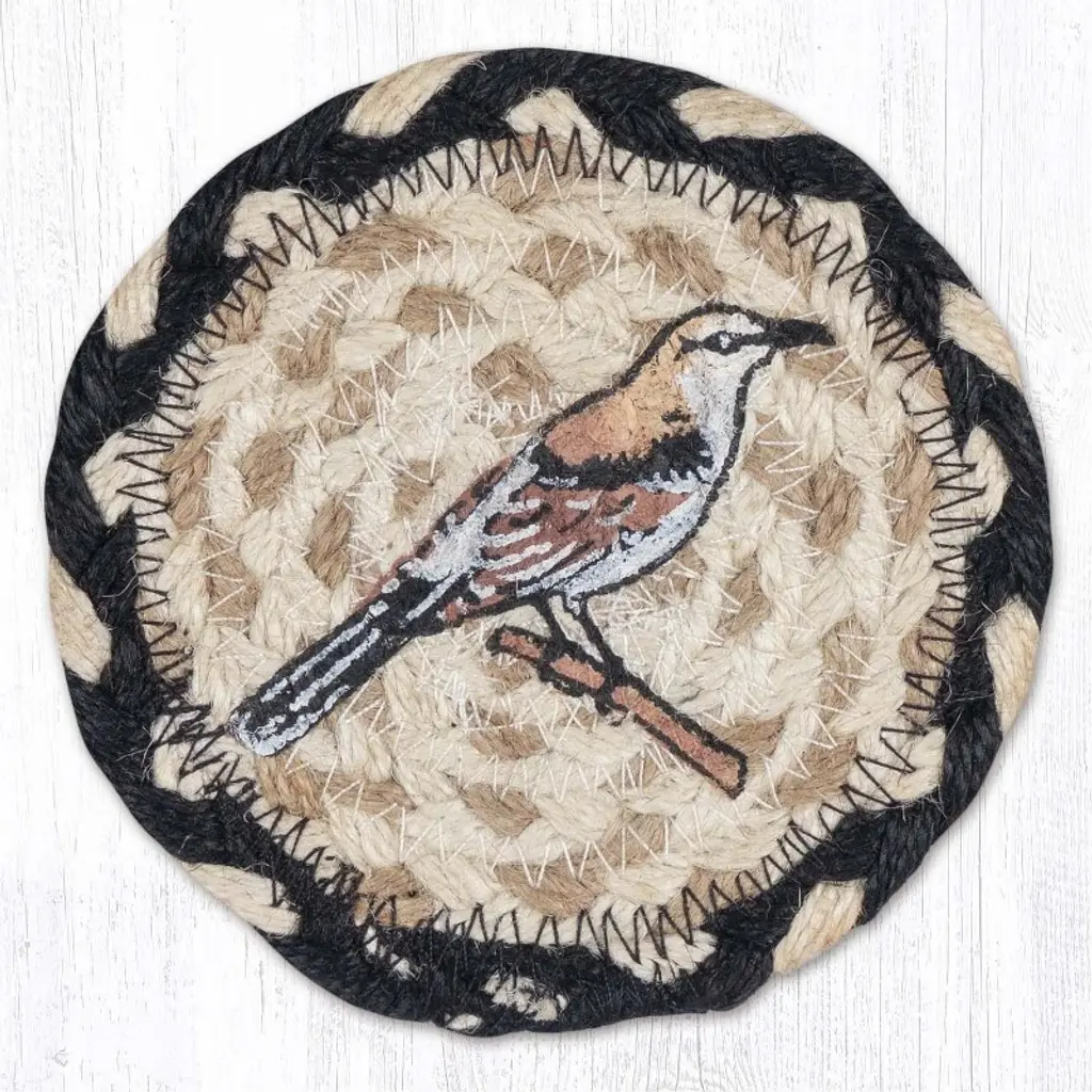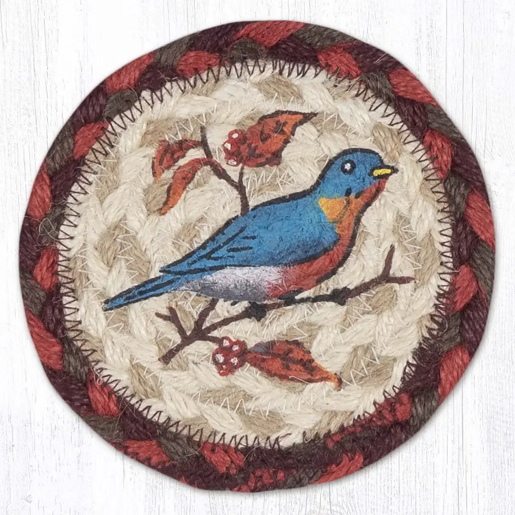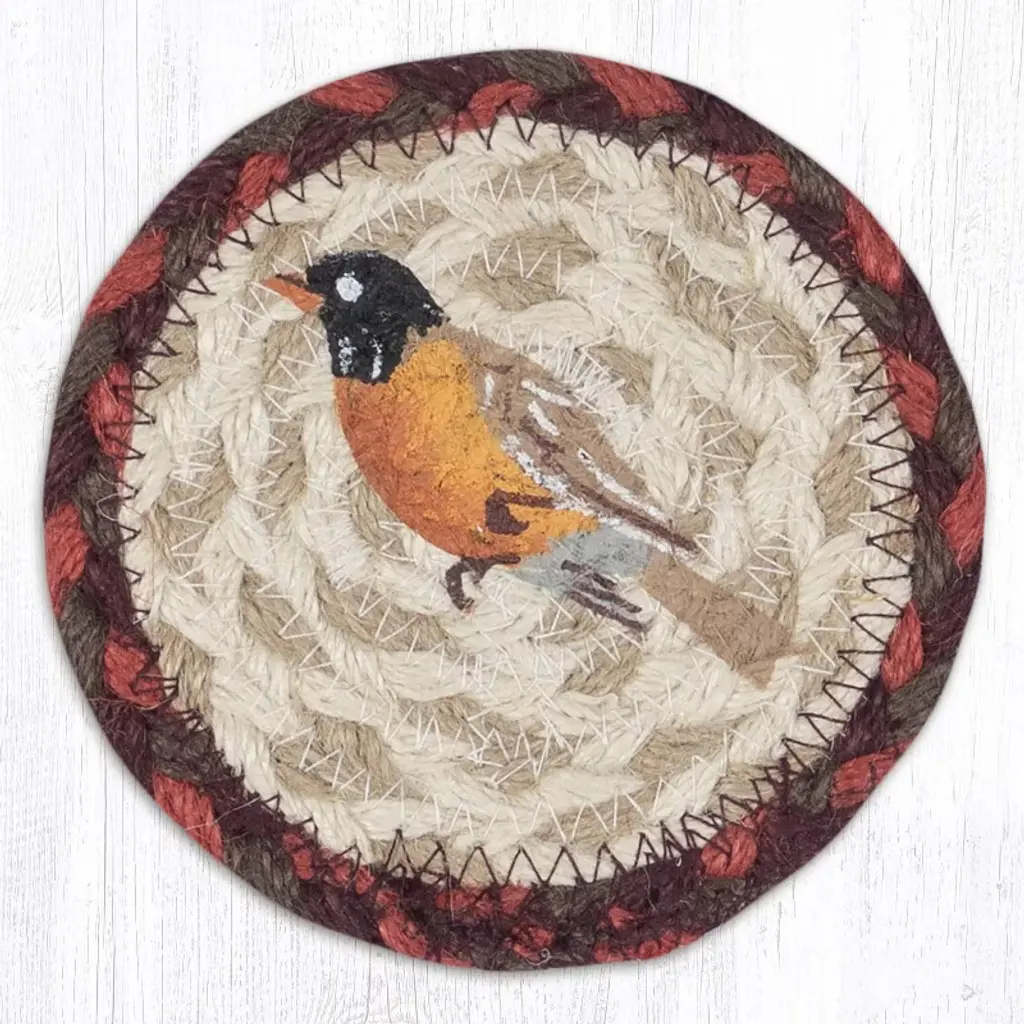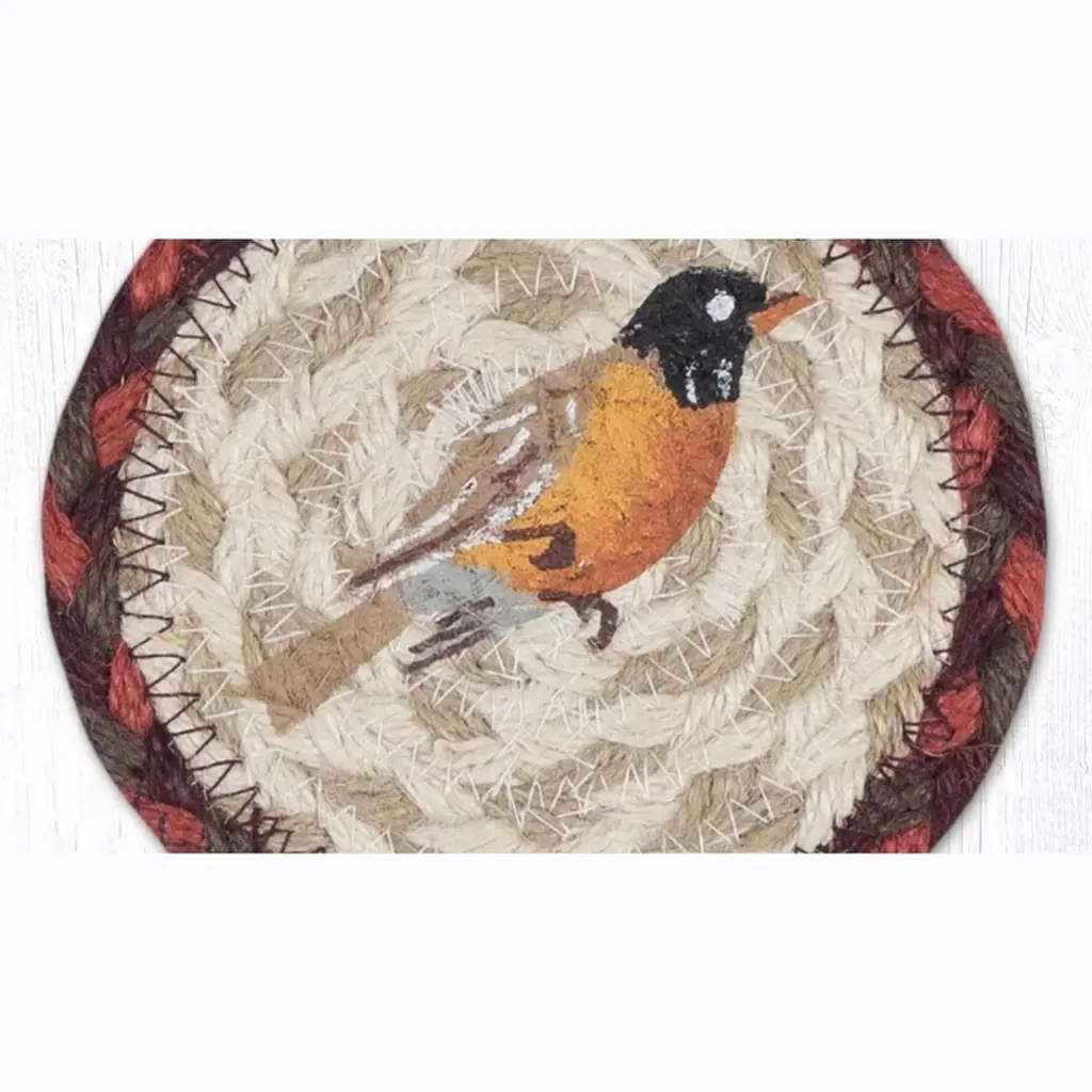 Earth Rugs Robin Printed Coaster – 5"x5" Braided Jute, Rustic Bird-themed Square Table Accent