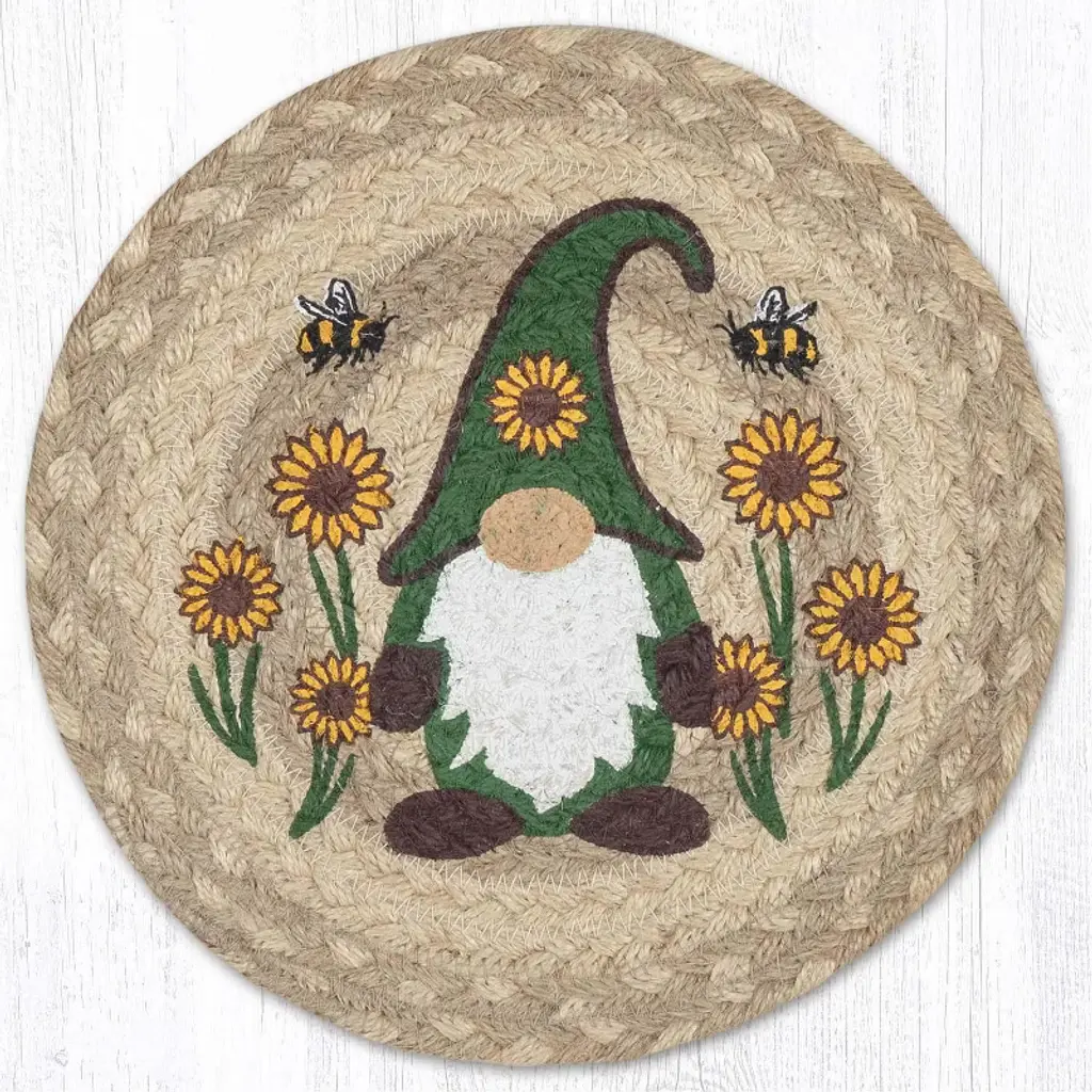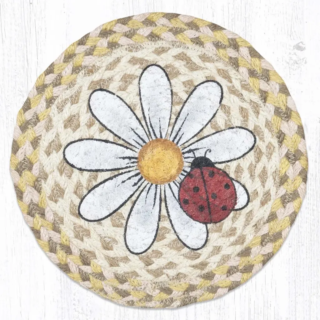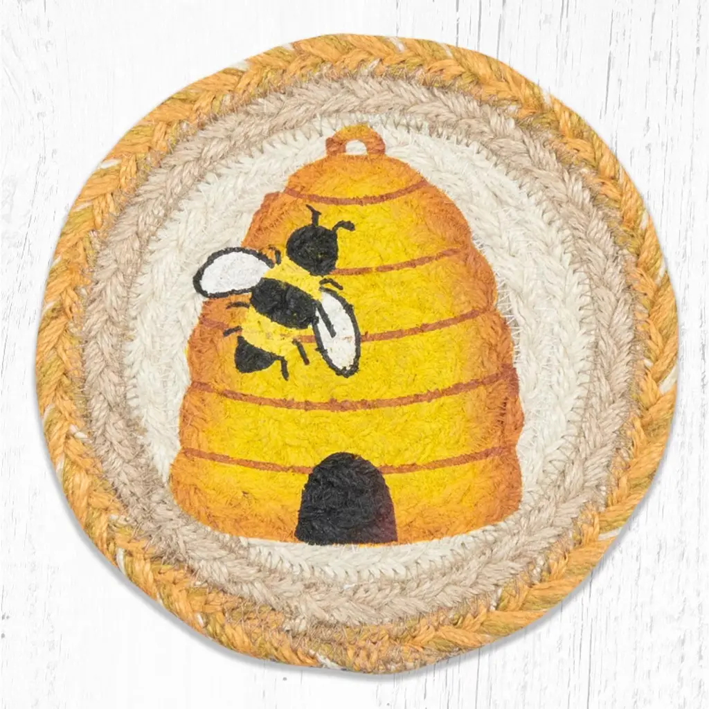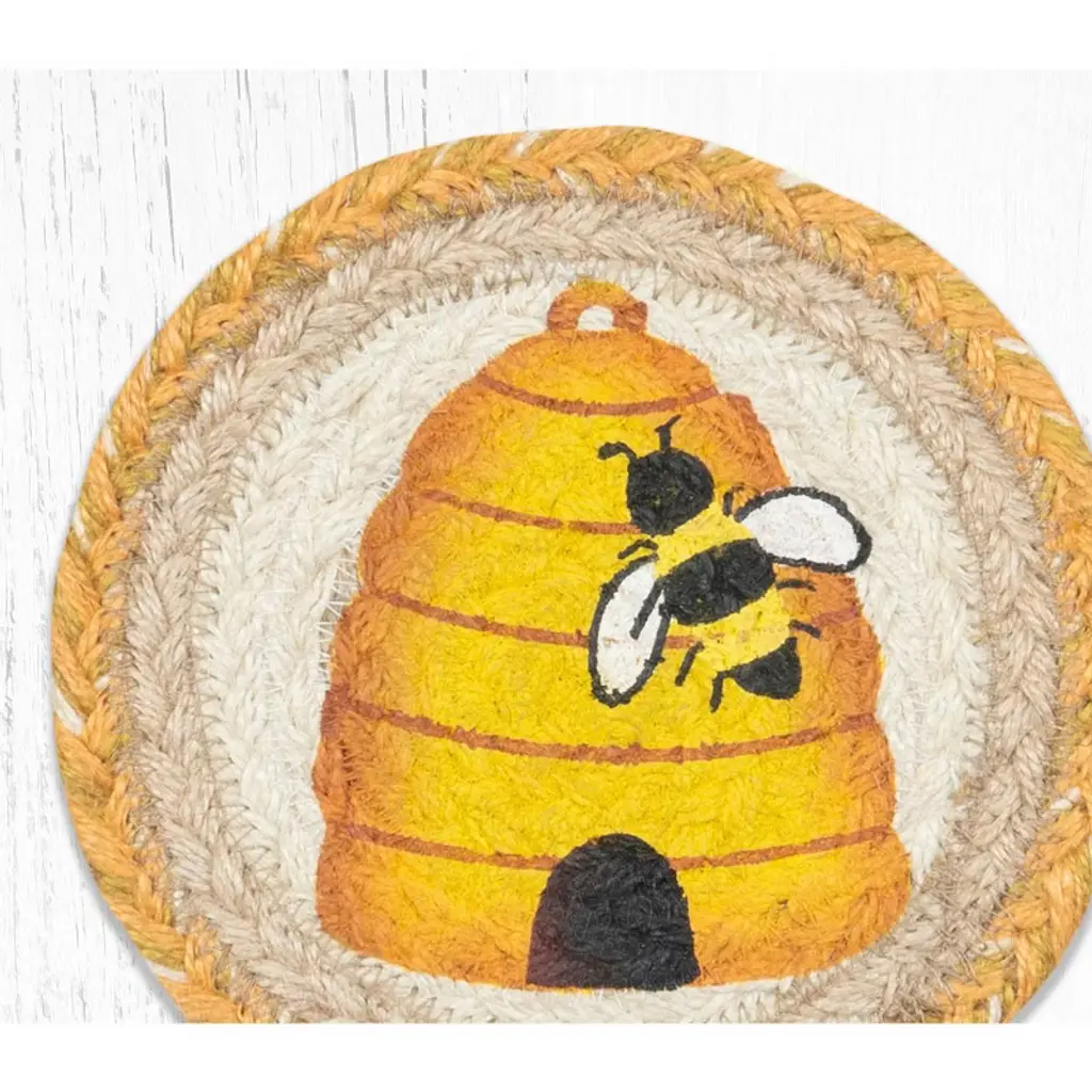 Earth Rugs Round Large Coaster – Beehive And Bees Design, Braided Jute, Rustic Nature-inspired Accent, 7"x7" Table Mat