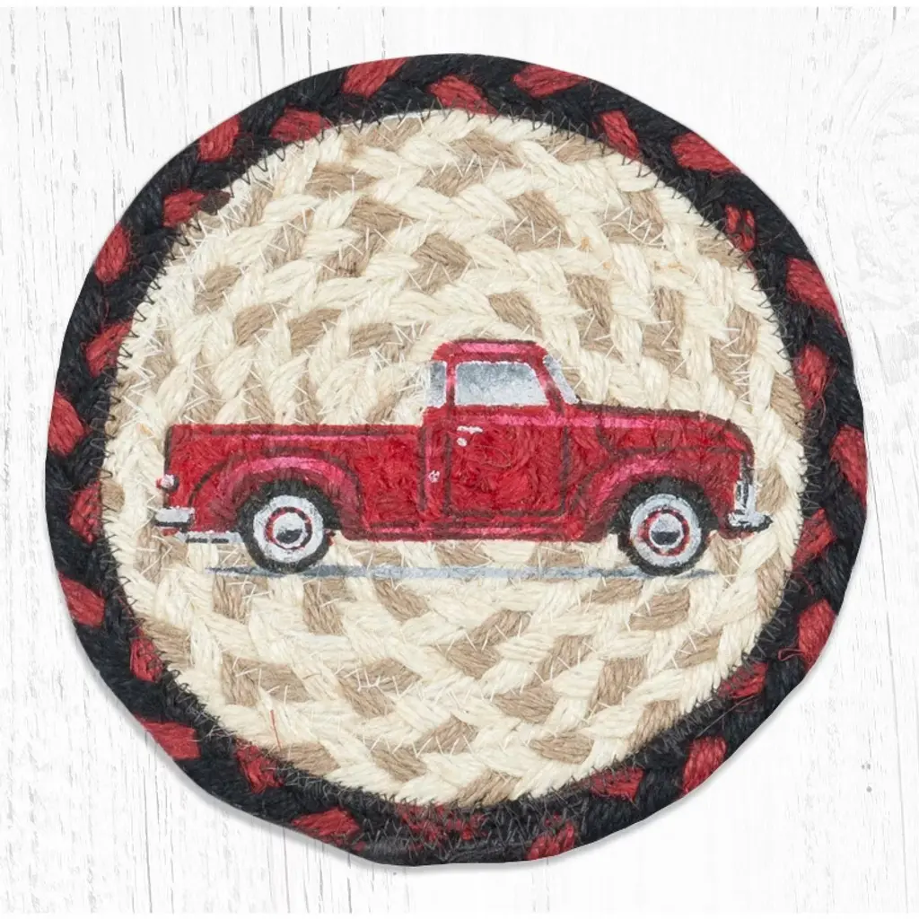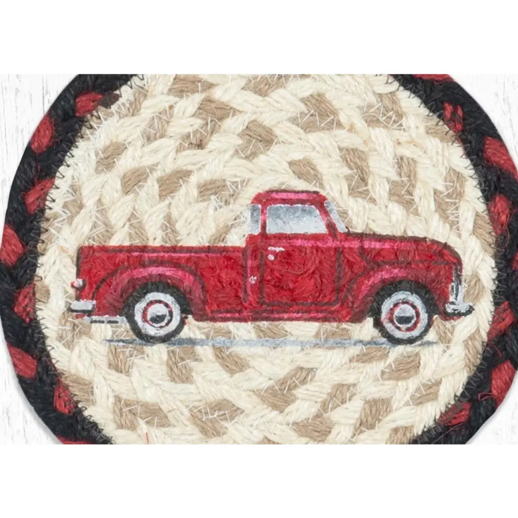Earth Rugs Vintage Red Truck Round Coaster – 7"x7" Hand-stenciled Jute, Rustic Tabletop Accent