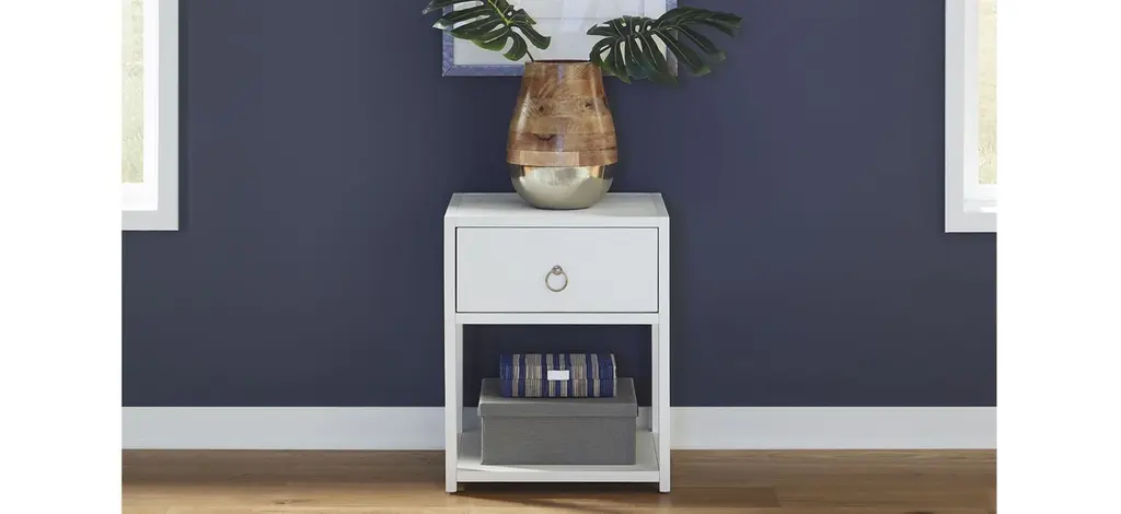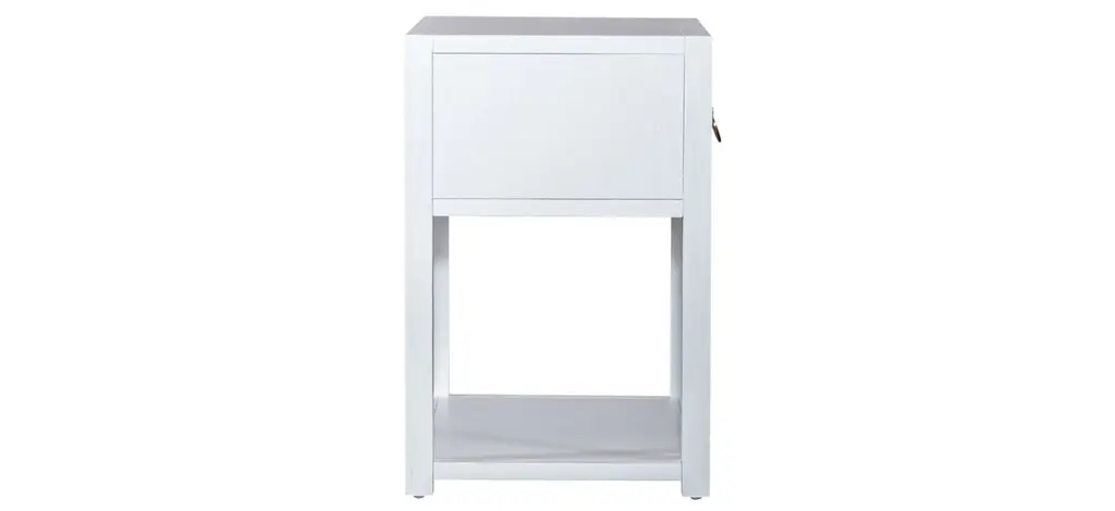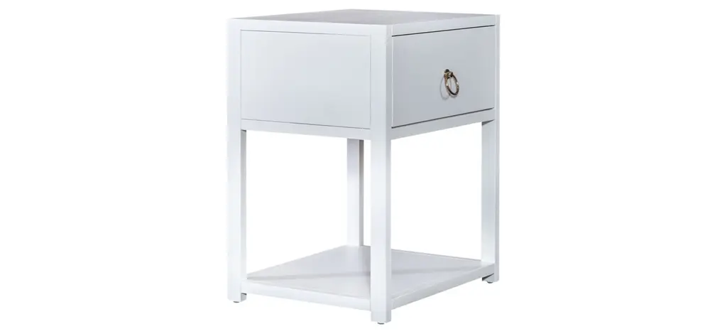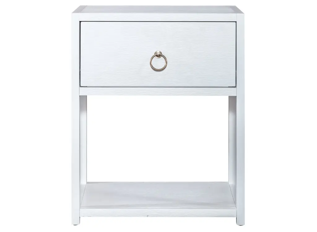 Turn your house into a home with the eclectic East End Accent Table. Crafted of Acacia Solids and veneers, this piece features a wire brushed white finish accented with brass ring hardware. This piece offers one full extension drawer and an open bottom shelf for additional storage. Versatile enough to work in any room from your living room to your bedroom. Unique and timeless, allow the East End Accent Table to bring inspirational design into your home.