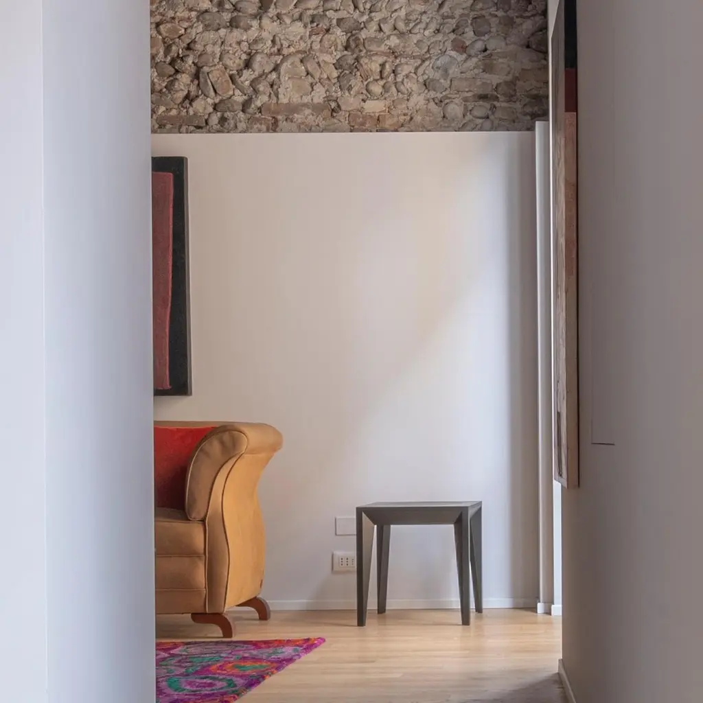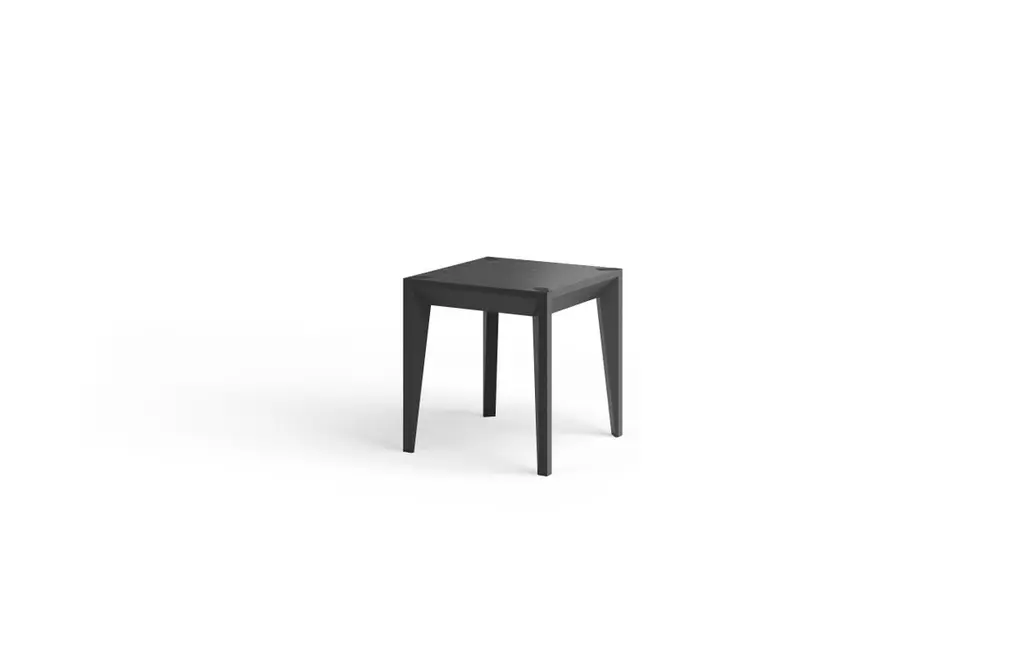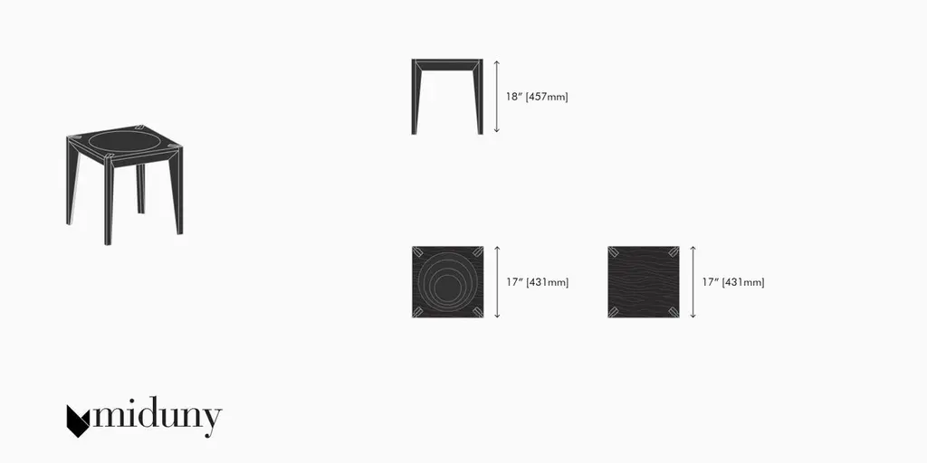 Part of the MiMi series, this Minimalist, versatile side table or stool accents the home and office. Clean, faceted geometry adds depth and sophistication while the square 17" wide flat top accommodates your preference for seating or display. These abstract and versatile pieces can be aggregated in clusters to form a coffee table or used as single elements when you need extra seating for your guests. Designed in Brooklyn by Italian-born architect Ale Preda for Miduny, this artisanal product is made in Italy by master craftsmen. The MiMi side table ebonized black model features a solid 13-ply furniture-grade beech plywood structure with a Sessile Oak veneer that undergoes an ebonizing process to create a gorgeous all-black matte finish with a slight 20% gloss finish.Each MiMi side table is hand-stamped with a unique serial number (on the underside) and comes with a signed certificate of authenticity. Like all our products, this item is efficiently packed for flat shipping inside a custom box and minimal assembly is required. Our custom joinery system allows legs to be pressure fitted in the notched top and secured with two bolts.