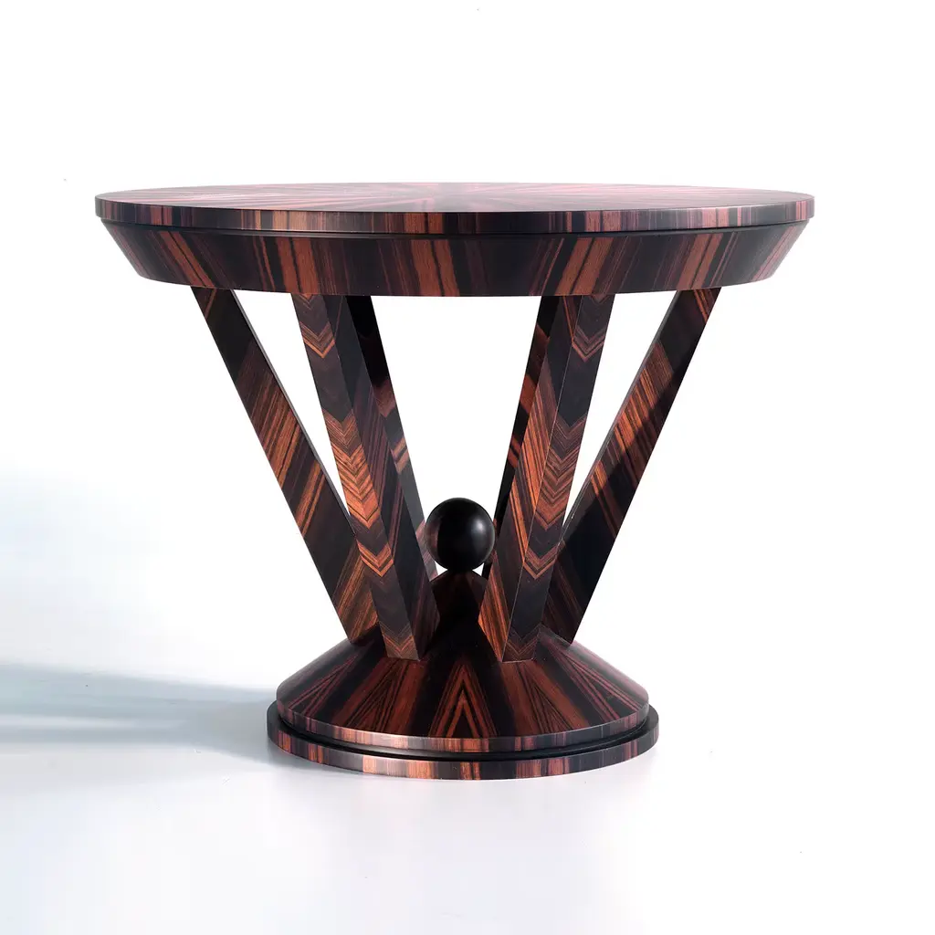 A striking design of sophisticated visual impact, this round side table flaunts a solid structure entirely crafted of prized Makassar ebony. Its bold silhouette comprises a conical base enlivened by a spherical finial and a round top connected by four imposing columns rising according to a centrifugal movement.
