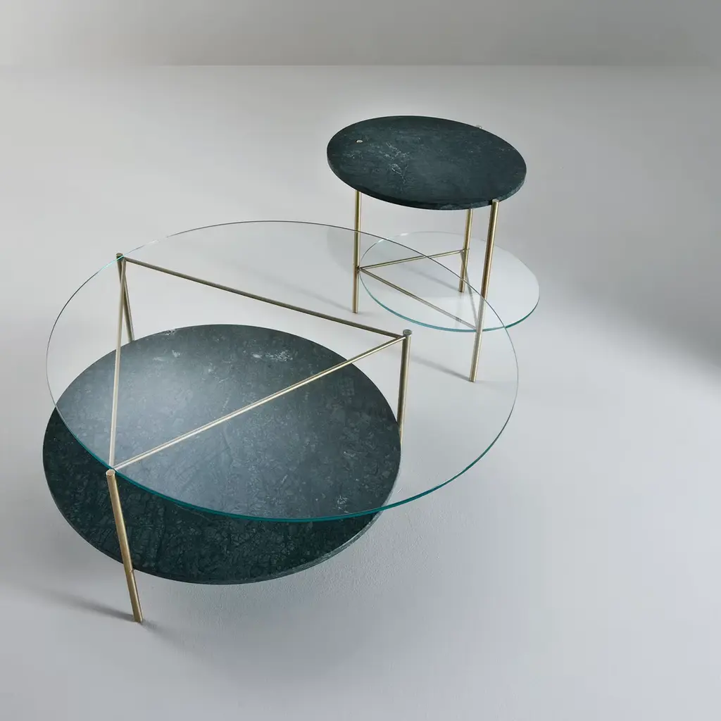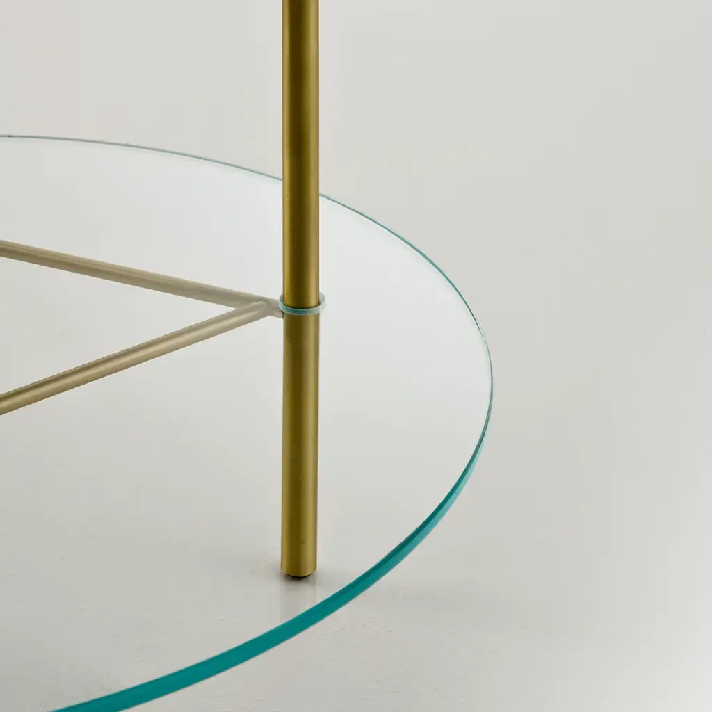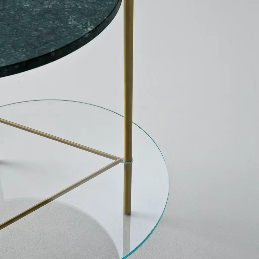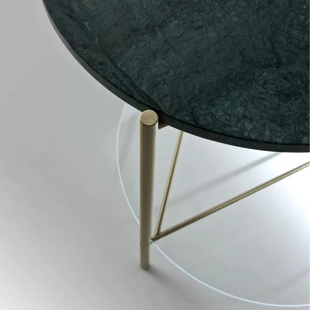 This simple and stylish Echo Side Table is crafted in satin brass with the lower shelf in extralight glass and table top in matt polished Guatamala green marble. Echo tables are available with one of two shelves in different marble varieties, allowing the customer to create unique combinations depending on their individual taste and creativity.