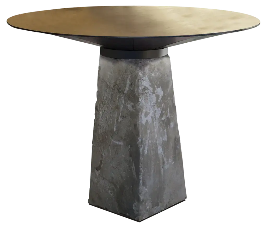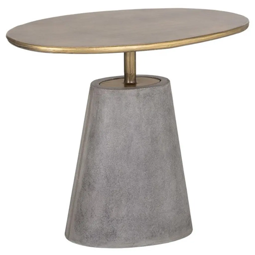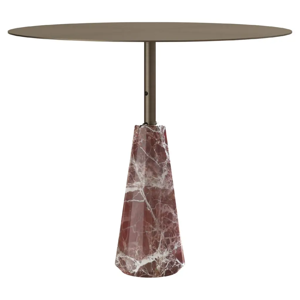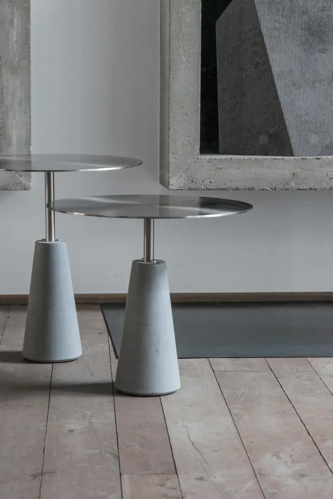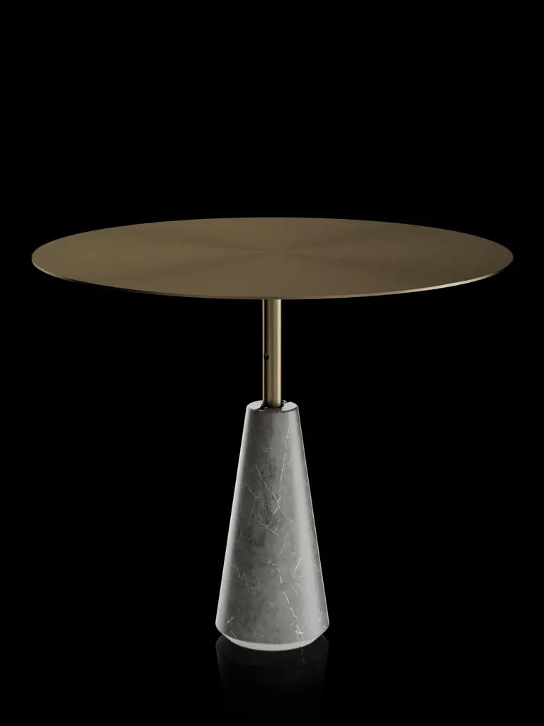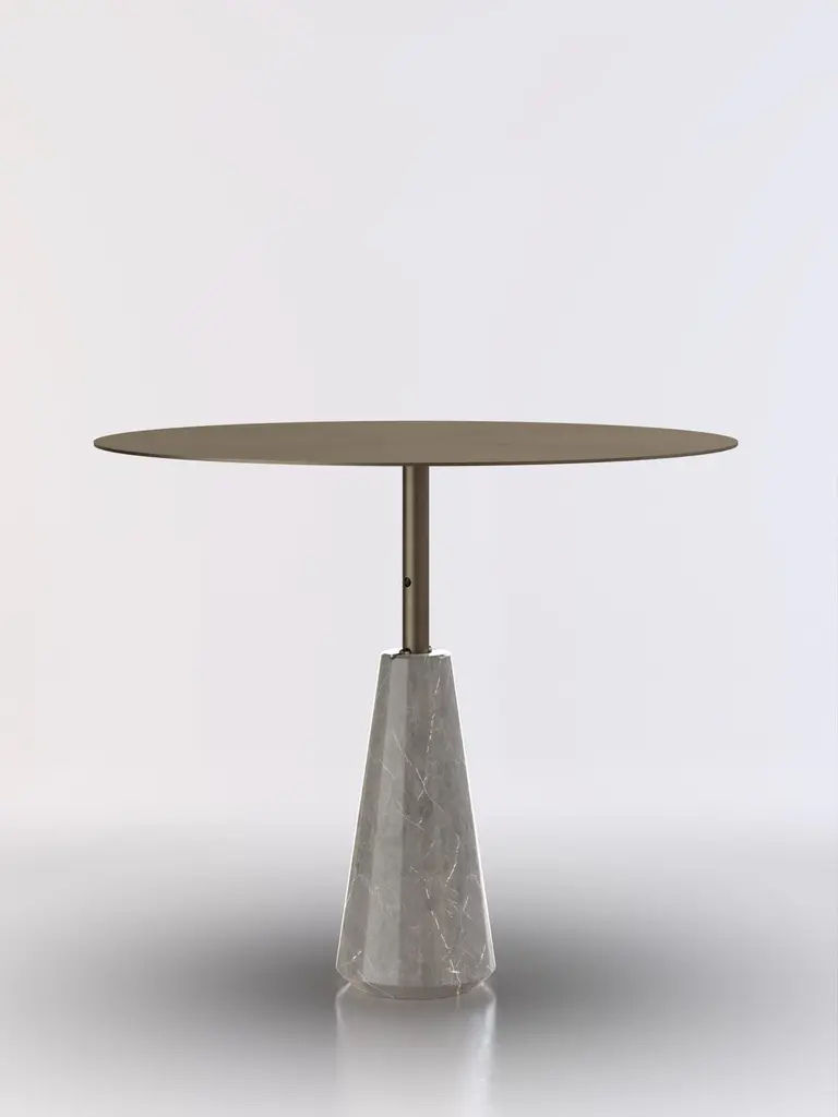 Reconfigurable bronze side table with grey stone base.The table's height can be set in three different levels.