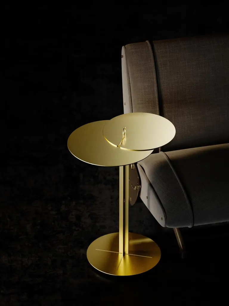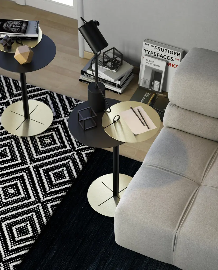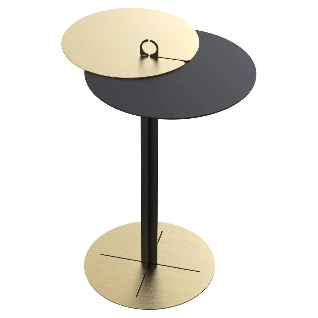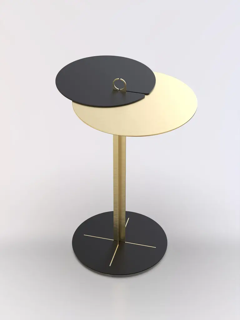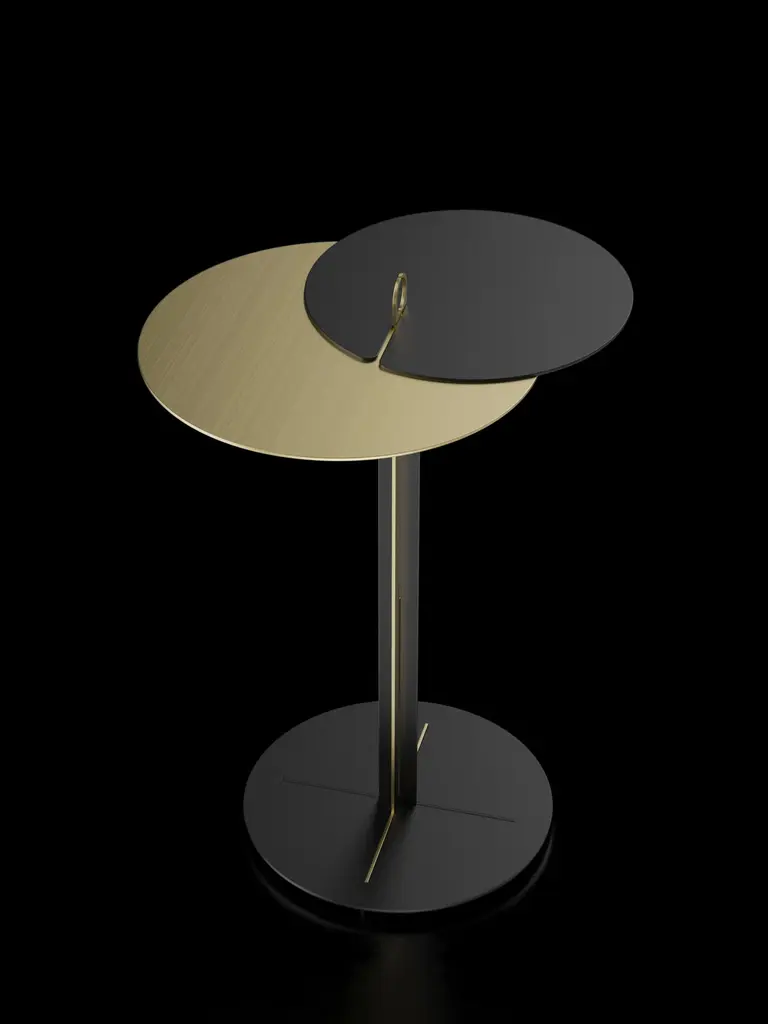 Side table made in lasercut metalsheet with an interlock black paint and brushed brass structure.