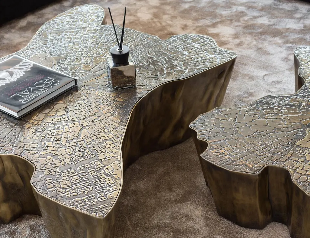 The mystic behind the name inspires Eden. This center table represents a part of the tree of knowledge and the tale of the birth of desire. Boca do Lobo uses the highest quality materials and textures, giving them shapes through objects that create a cosmopolitan luxury environment, finding the finest example in this table. Fully made of polished casted brass, with a delicately engraved top exposing the heart of a golden tree to the very heart of a home. Available a set of two center tables and also an elegant and highly decorative side table.