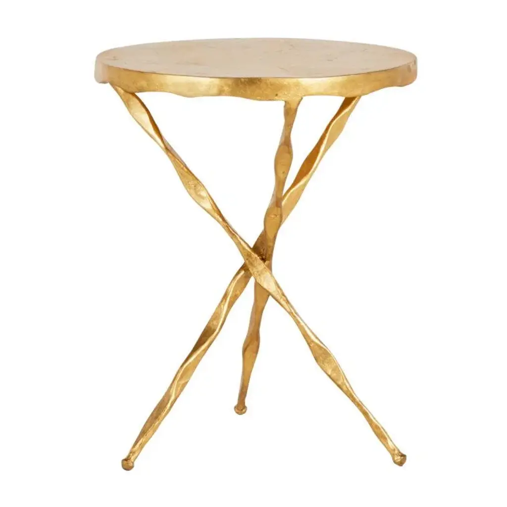 The Edgar Gold Leaf Drinks Table The cast-metal Edgar Side Table is the essence of versatility. Perfectly sized to fit wherever an extra surface is needed, this small table features sophisticated styling such as twisted-ribbon style legs and a round tabletop with a softly scalloped, organic edge. The entire table has a hand-applied gold-leaf finish that gives a warm accent. Finishes: Royale Leaf. Width: 15.25" - Depth: 15.25" - Height: 19.25"