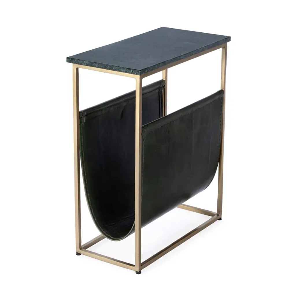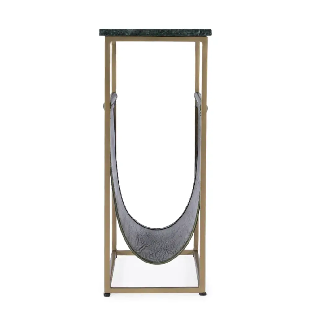 A stunning combination of marble, iron, and leather! This magazine table is a beautiful complement to any space.