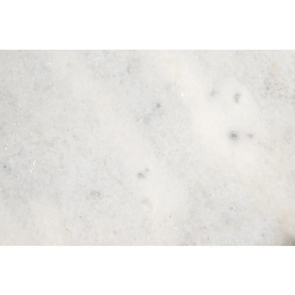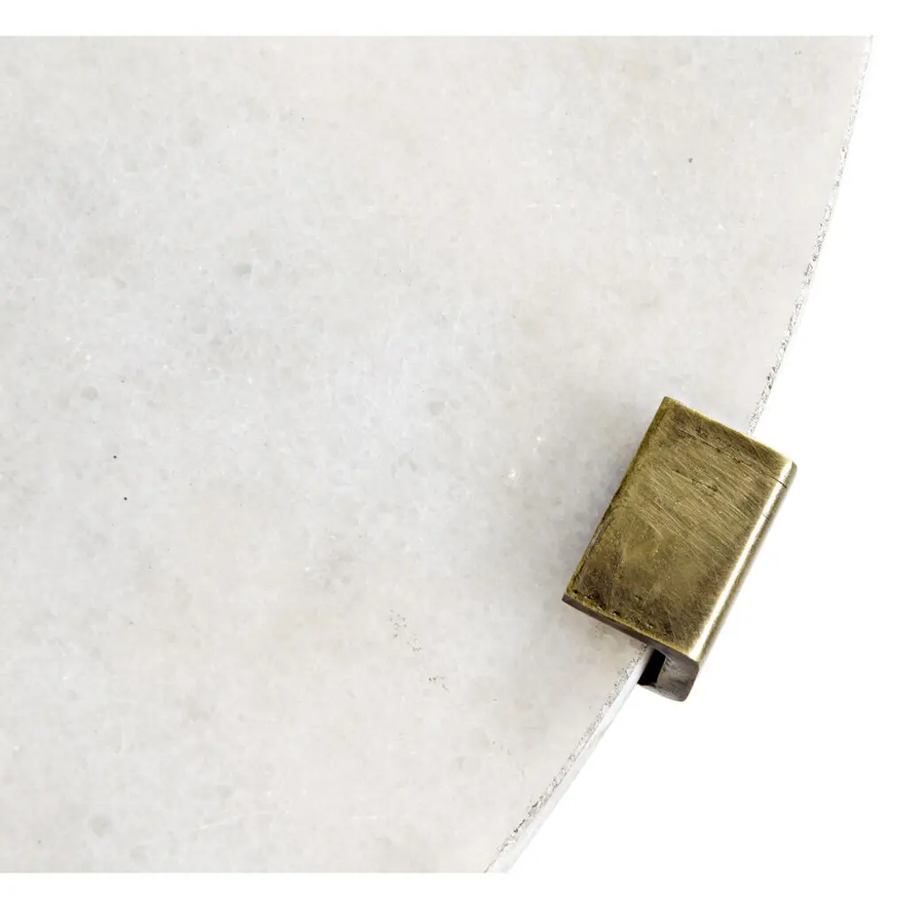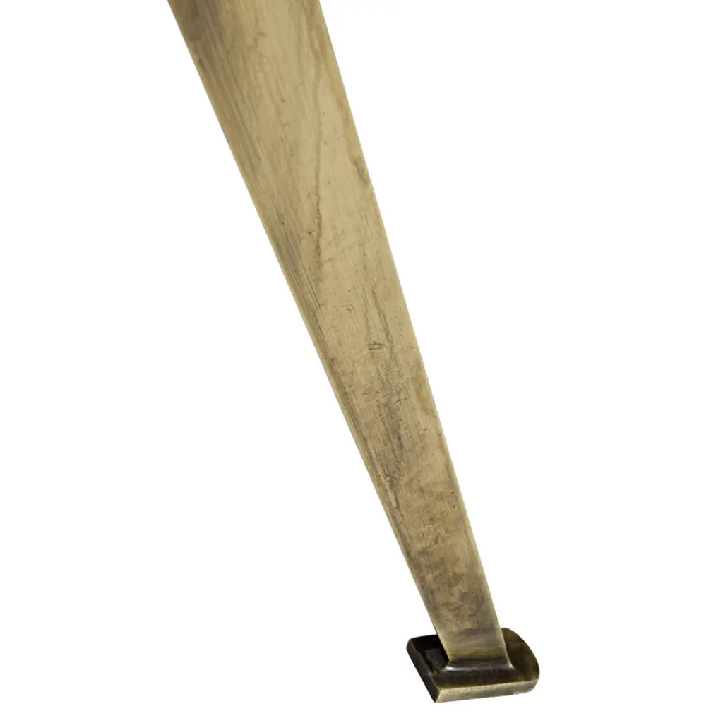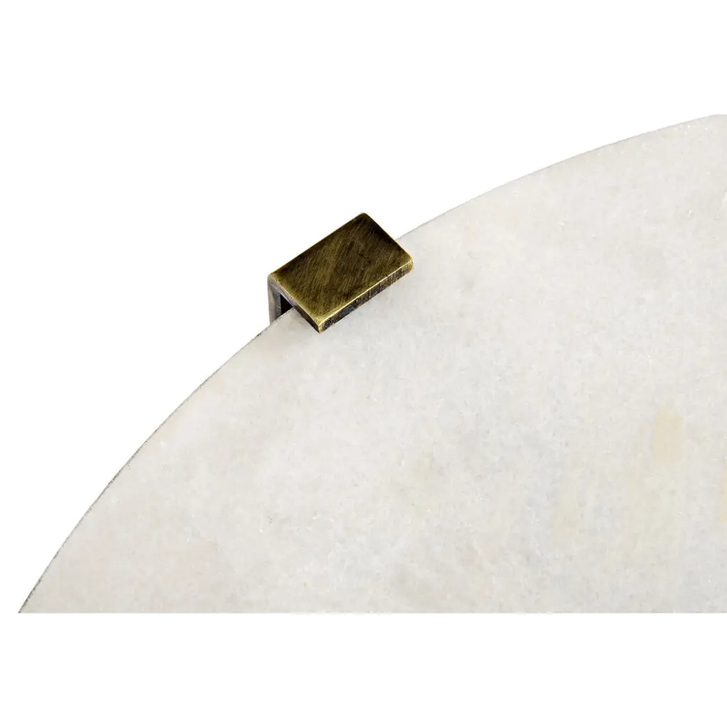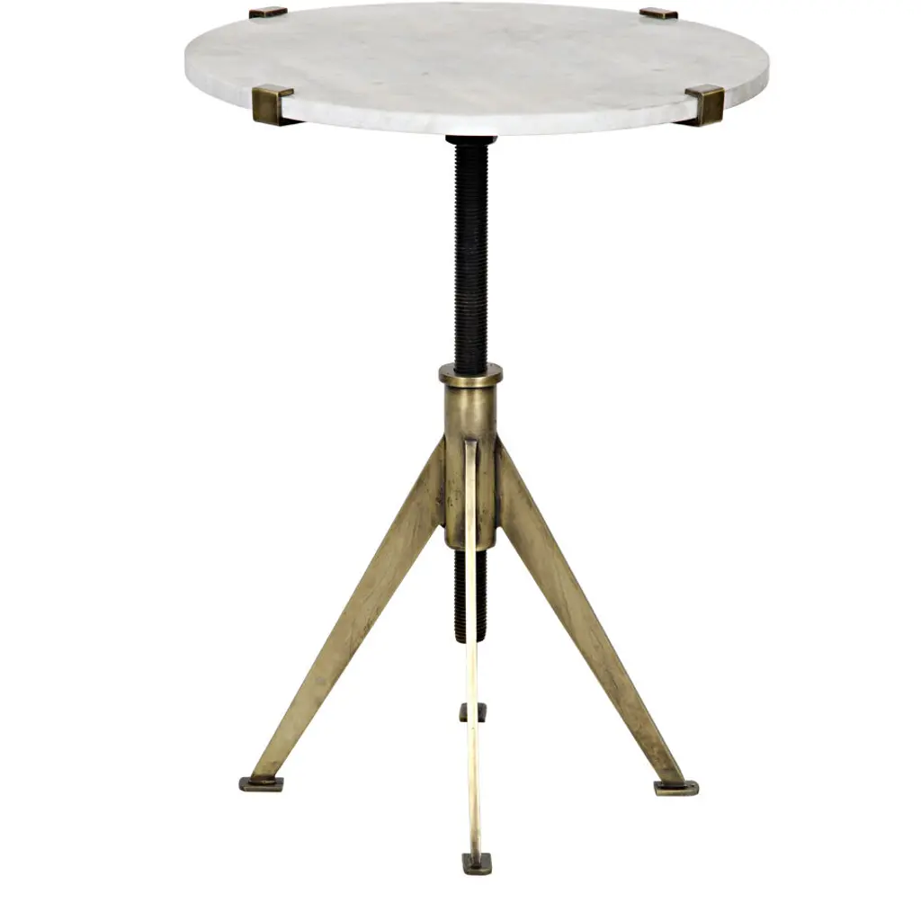 An updated take on mid-century modern, the table is topped with a slab of marble and designed to embrace the natural beauty of the material. The one of a kind stone discs top adjustable metal bases, in an antiqued brass finish, that allow the table's height to be easily adjusted.